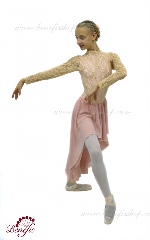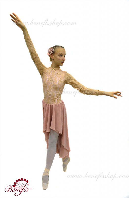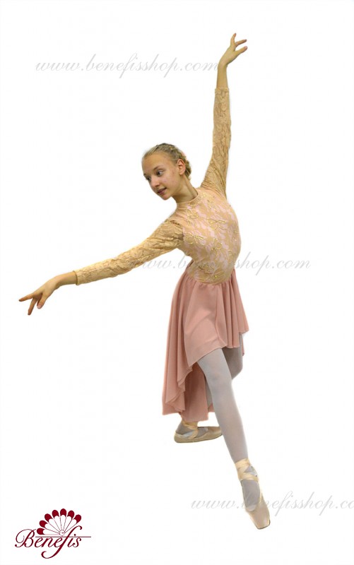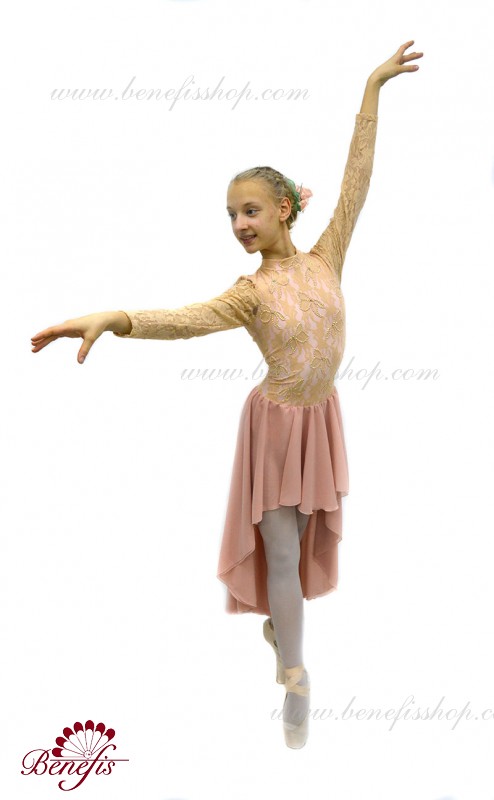 Professional stage ballet costume based on a leotard. The leotard is made of elastic fabric (supplex) with guipure. The skirt is made of two layers of chiffon. Décor includes sequins and rhinestones.