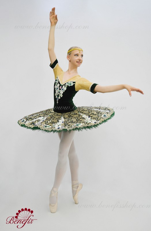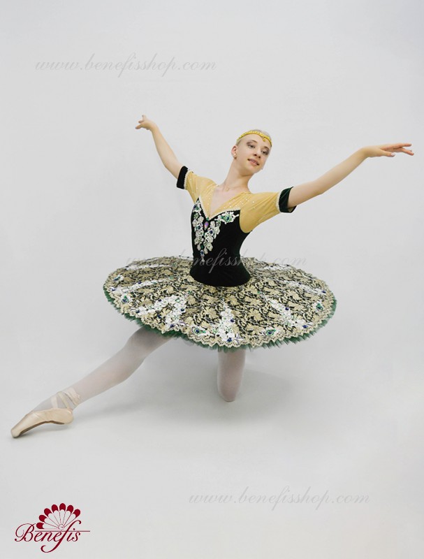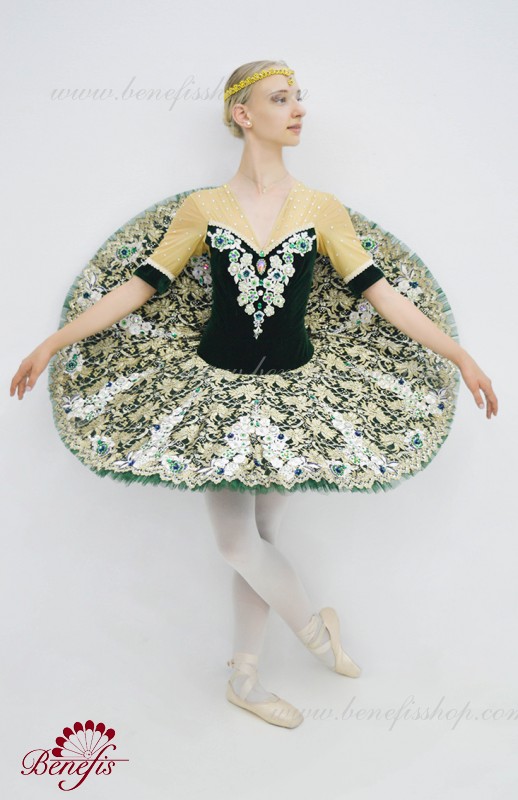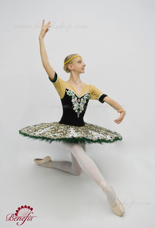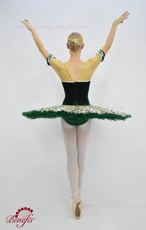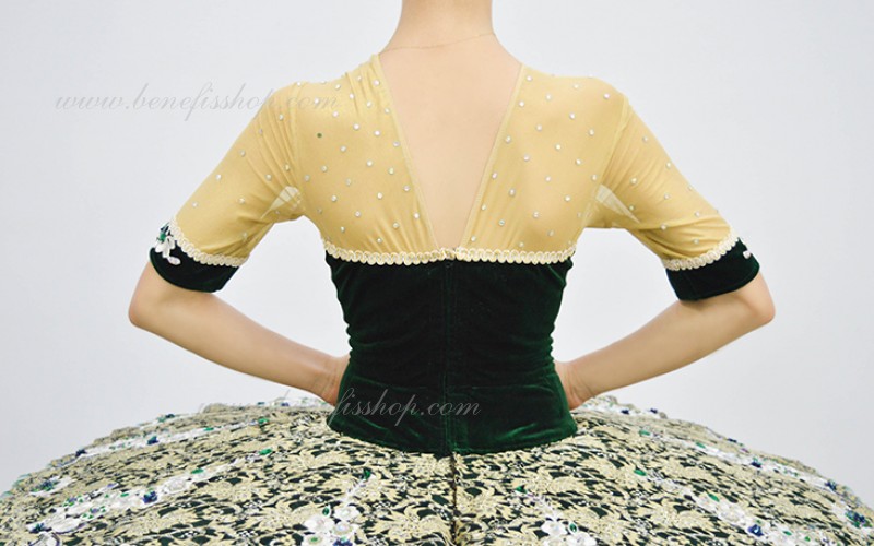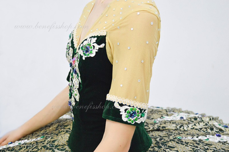 The bodice is made of two parts of the shortened bodice and coquette. The upper part of the bodice is made of elastic mesh that passes into the sleeves. The costume is decorated with sparkles, beads, rhinestones, flowers, applications and braid