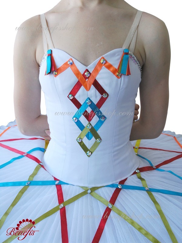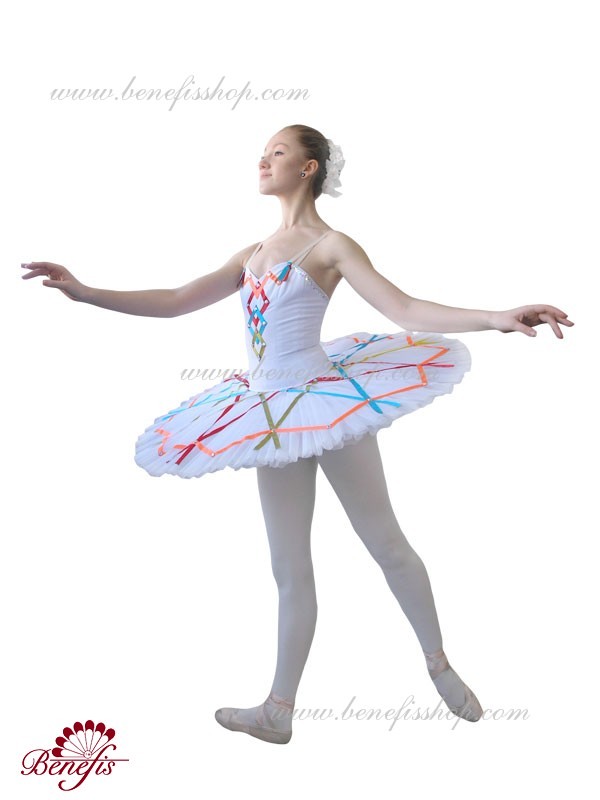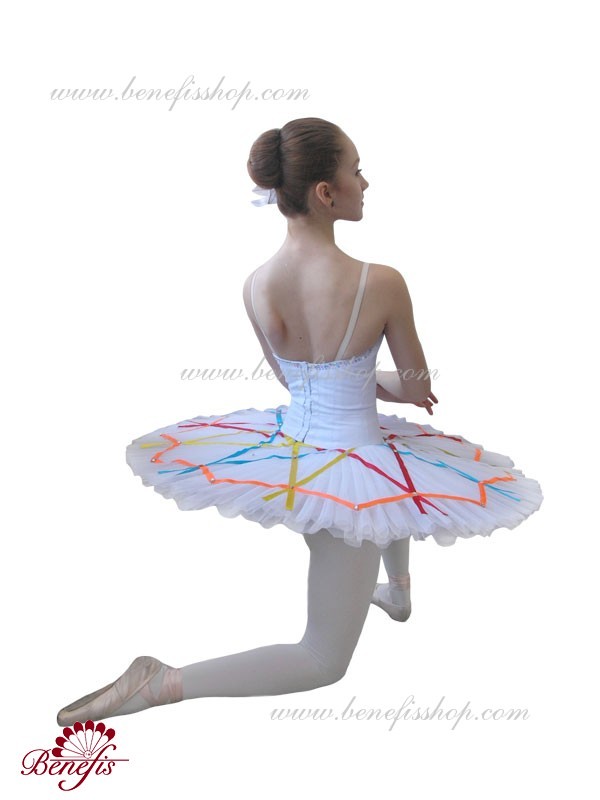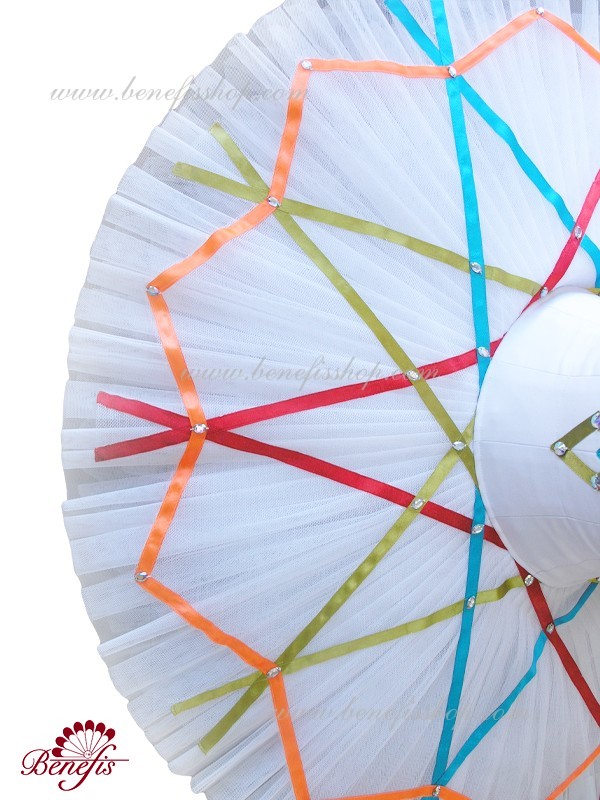 Eight pleated graduated layers of semi-soft tulle - seven long and one short on the panties of tulle with 10 cm yoke attached to the elastic belt. Two crinoline hoops are embedded in the middle layer with two additional short ruffles at the edges. The length of the top layer is 36-38 cm, each next layer is 4 cm shorter. The tutu is fastened on the back with 6 large hooks and eyelets. This ballet rehearsal tutu can be performed on both an adult and a child.