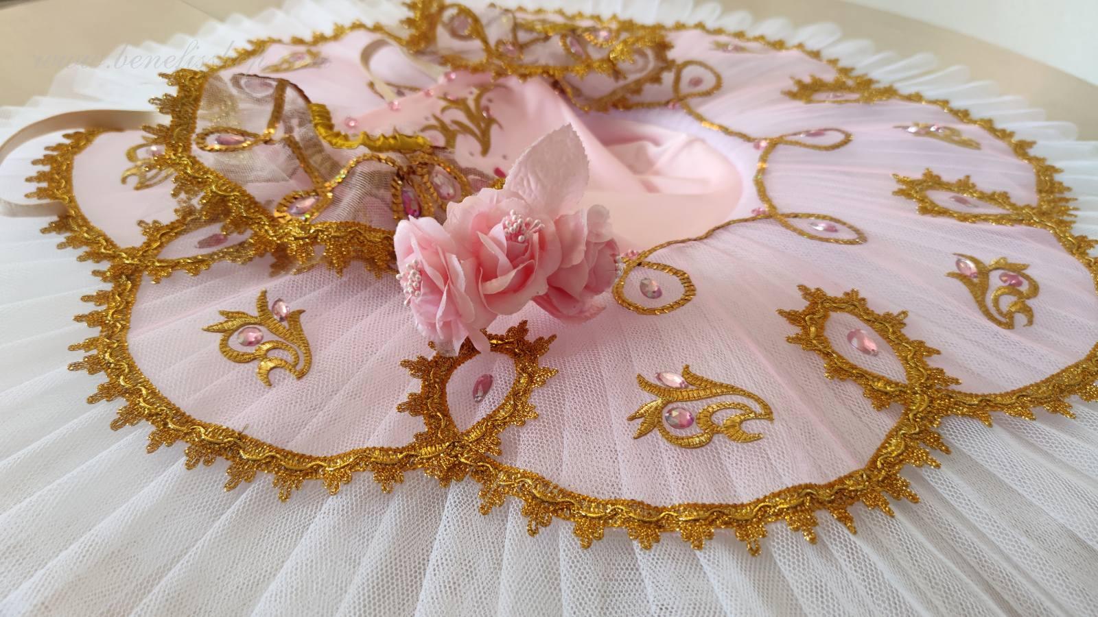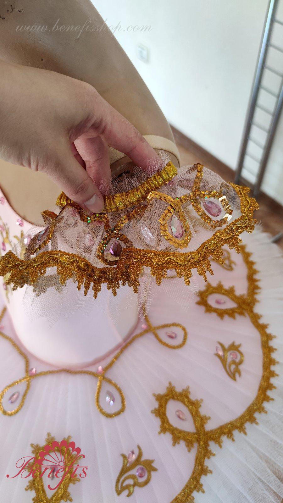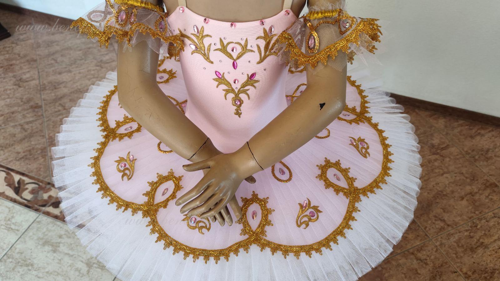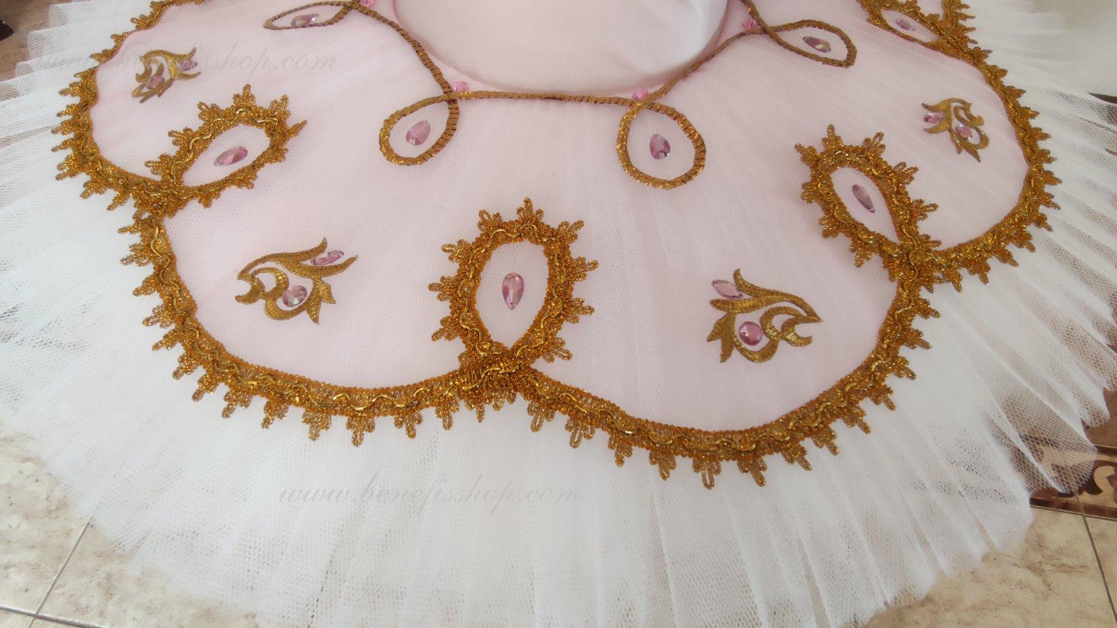 Details: costume. The rehearsal tutu is made of 5 layers of semi-rigid tulle. The briefs and yoke are made of elastic fabric - used. Without fastener. The bodice and the top layer of the skirt are decorated with patterns of appliques, sequins and rhinestones of various sizes. The edges of the tire and the armbands are decorated with gold or silver braid.