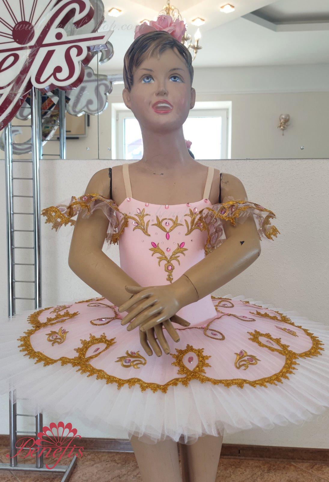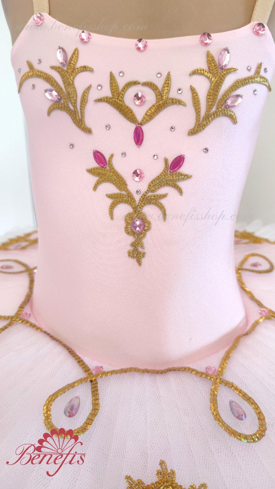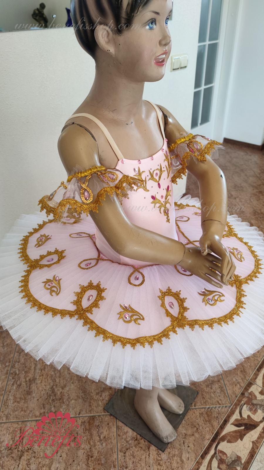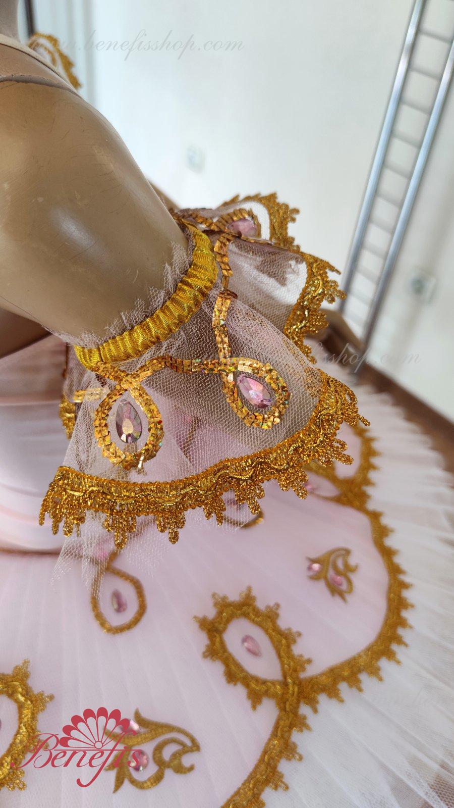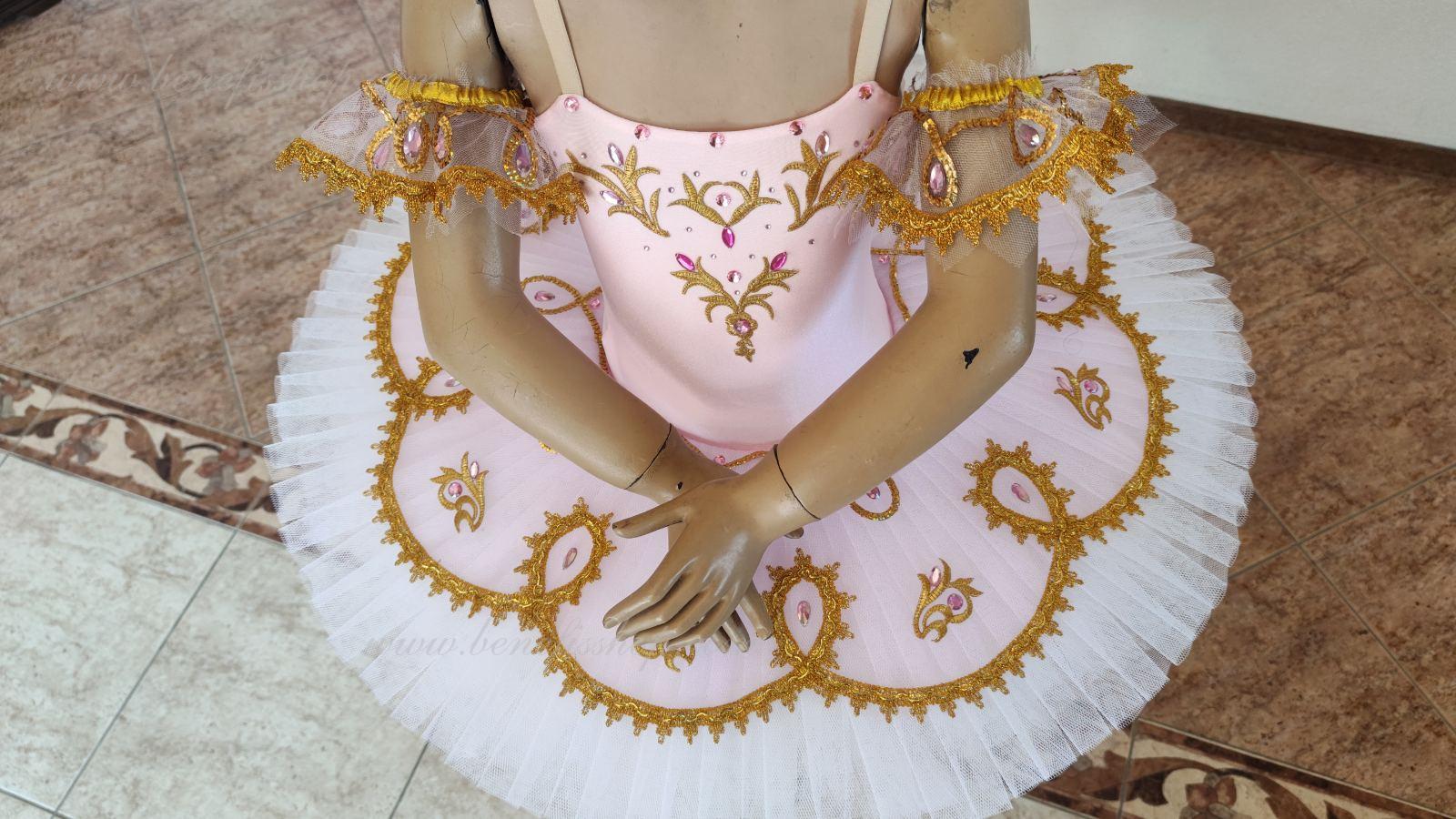 Details: costume. The rehearsal tutu is made of 5 layers of semi-rigid tulle. The briefs and yoke are made of elastic fabric - used. Without fastener. The bodice and the top layer of the skirt are decorated with patterns of appliques, sequins and rhinestones of various sizes. The edges of the tire and the armbands are decorated with gold or silver braid.
