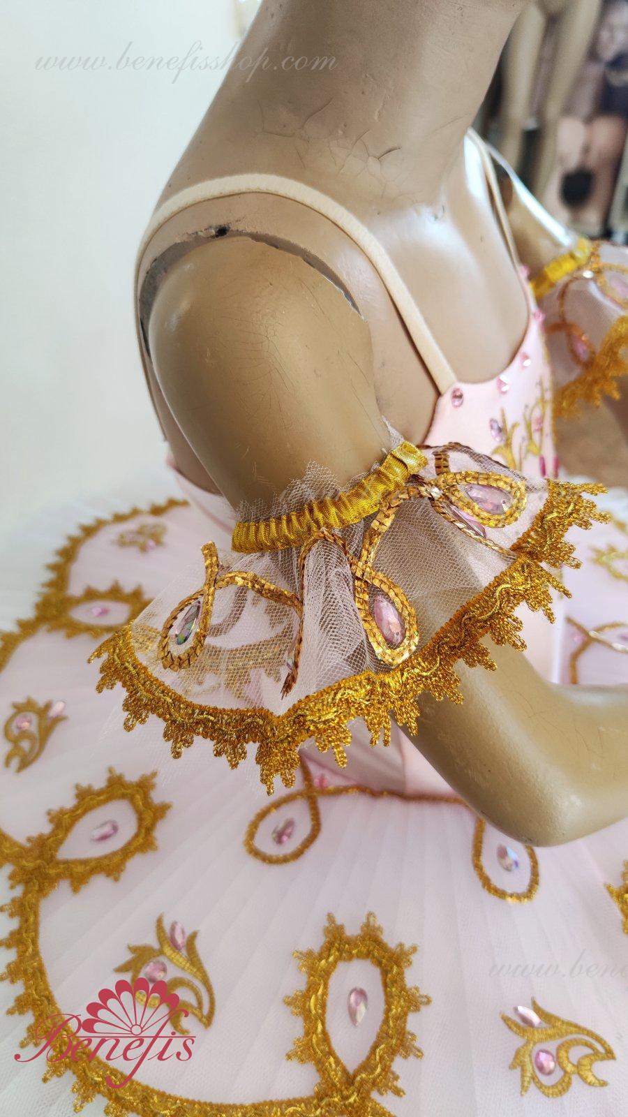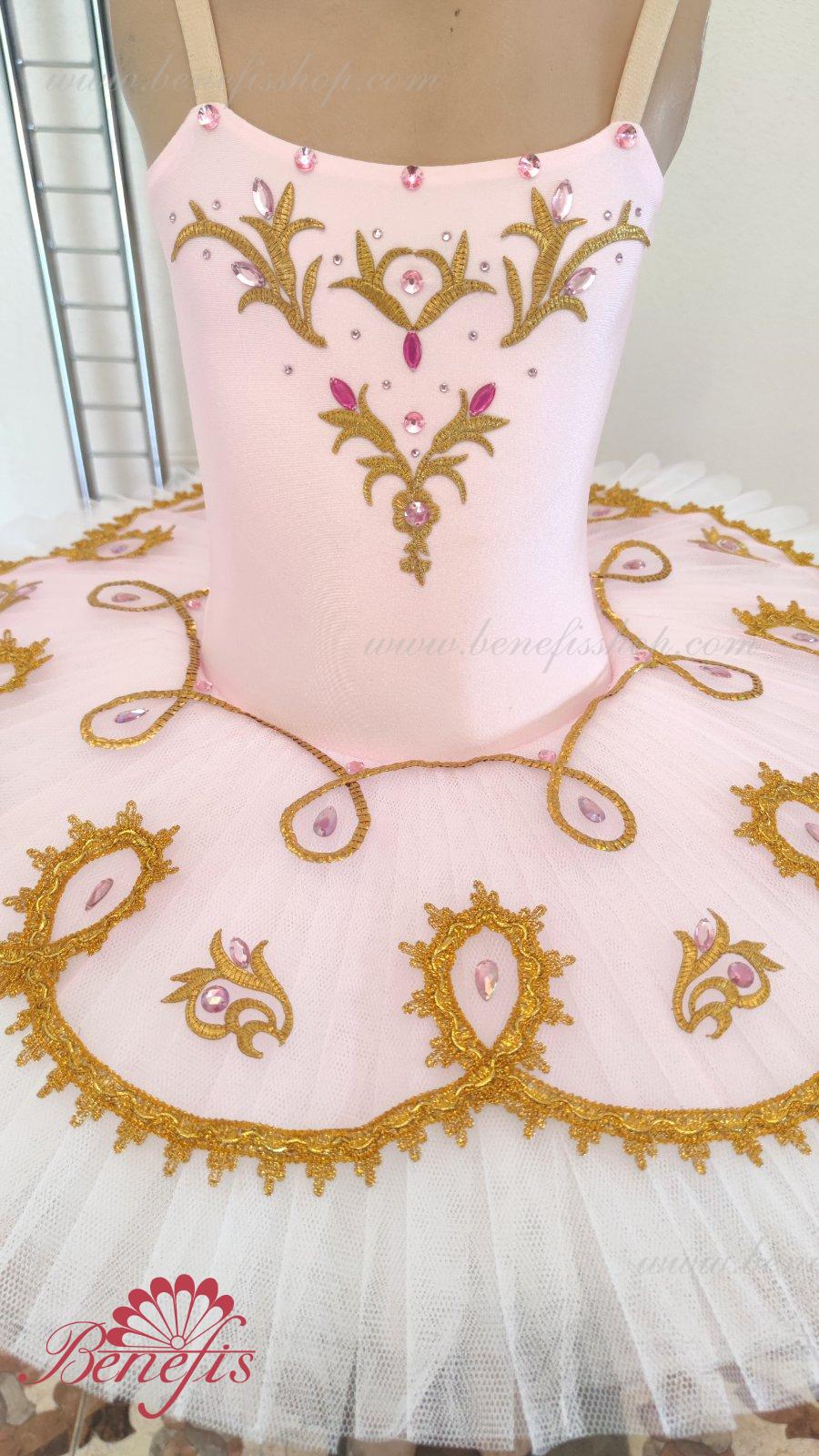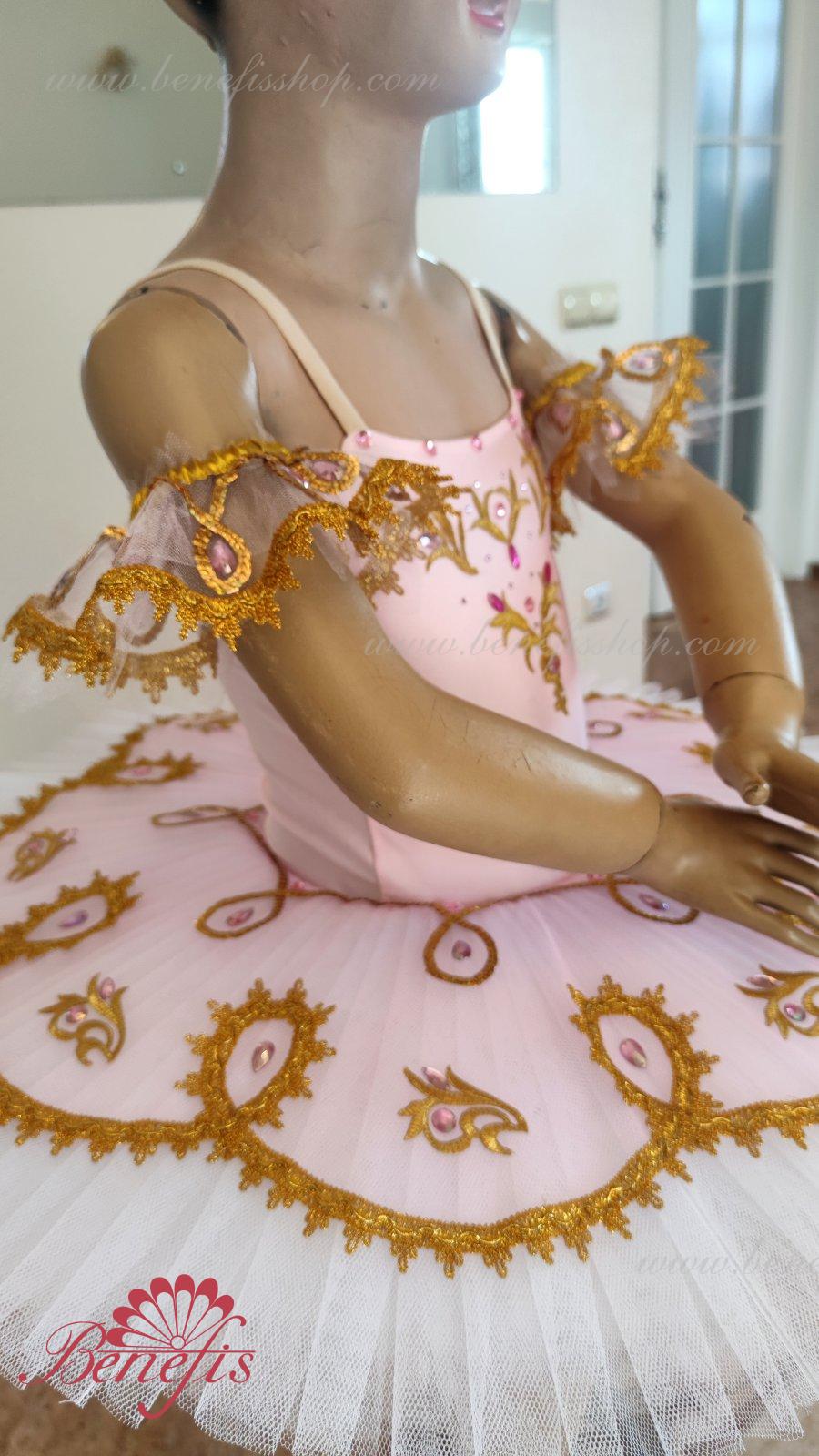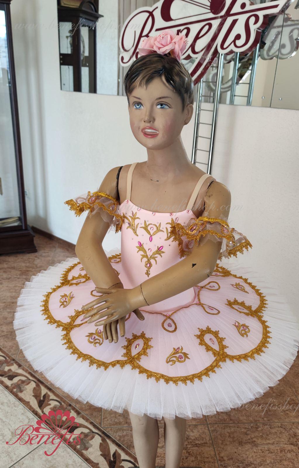 Details: costume. The rehearsal tutu is made of 5 layers of semi-rigid tulle. The briefs and yoke are made of elastic fabric - used. Without fastener. The bodice and the top layer of the skirt are decorated with patterns of appliques, sequins and rhinestones of various sizes. The edges of the tire and the armbands are decorated with gold or silver braid.