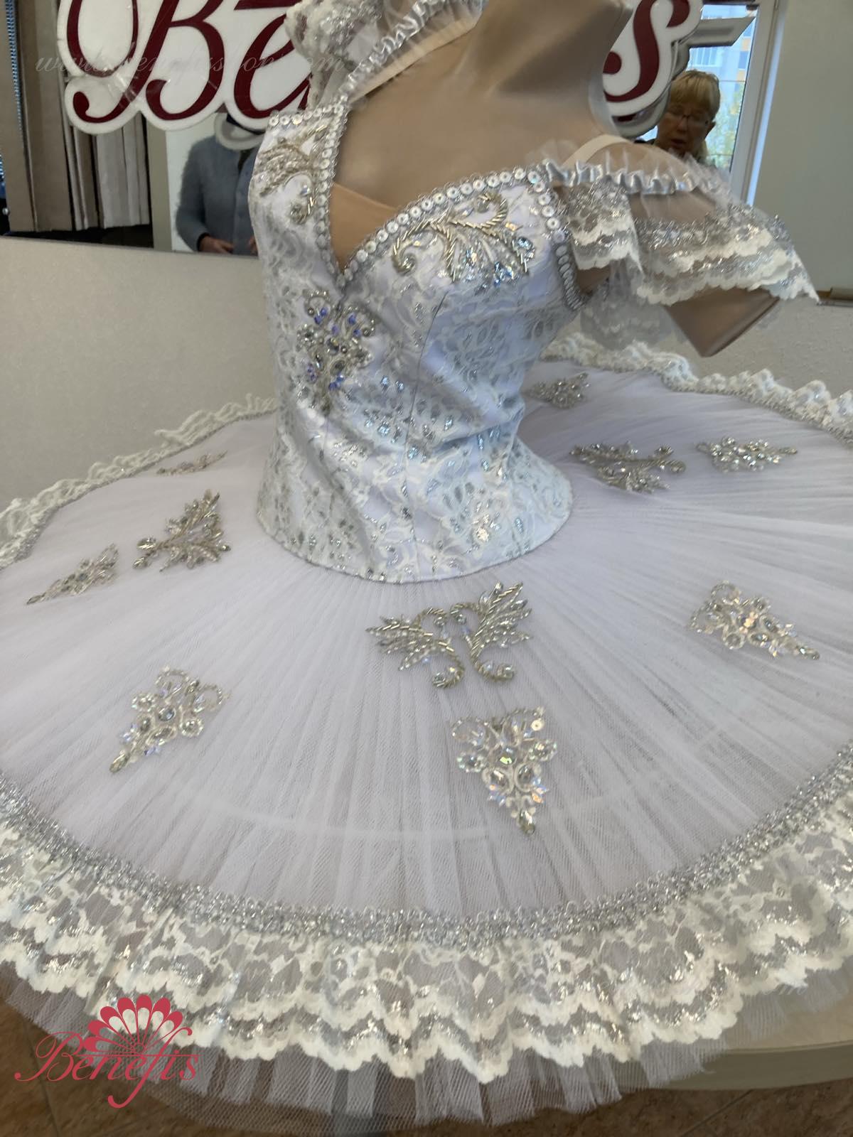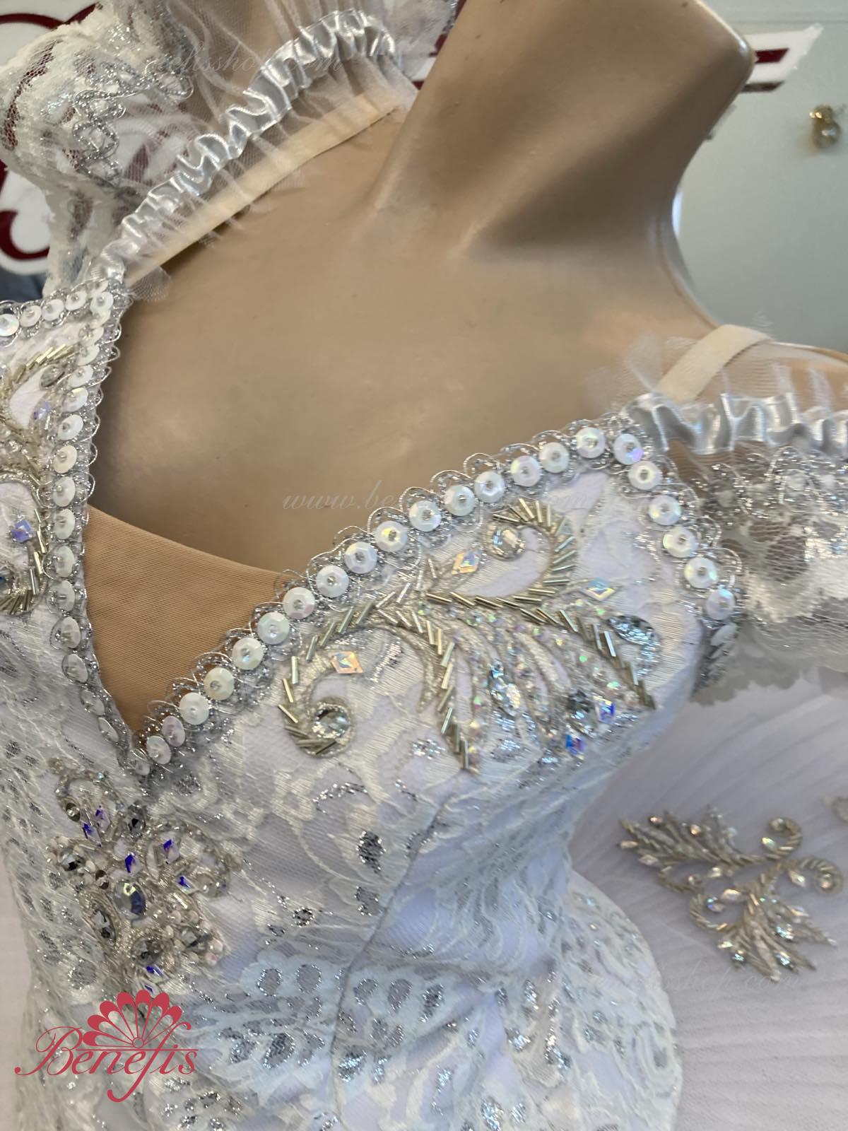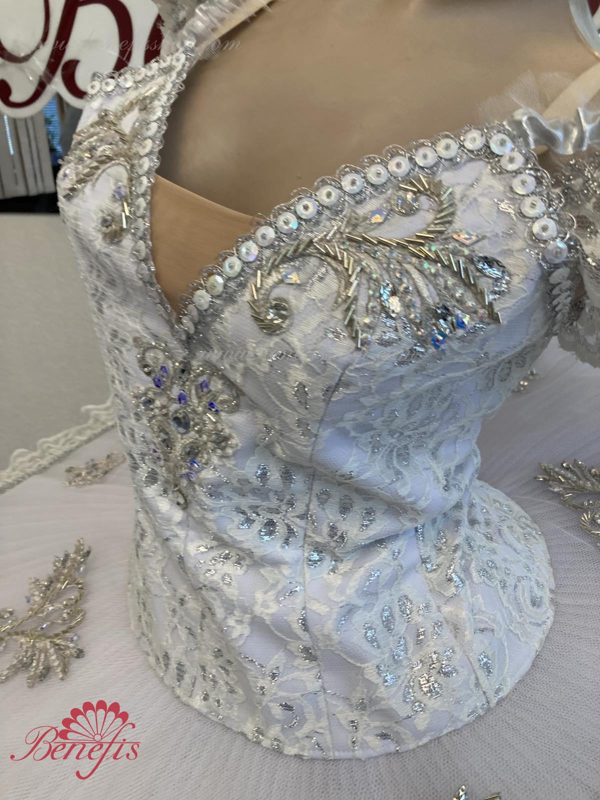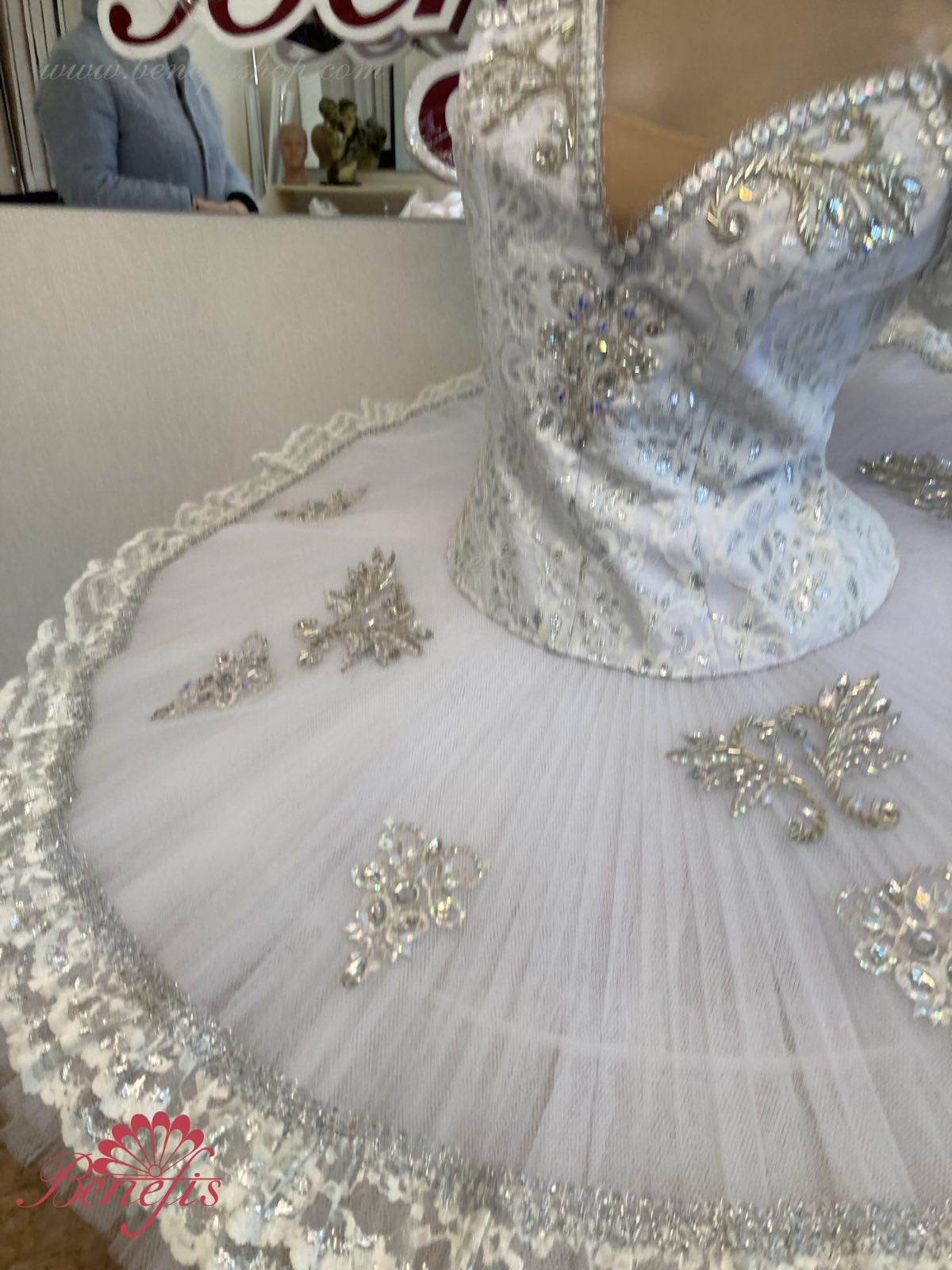 Details: costume. The bodice of the T0009 is duplicated with guipure. Extra lightweight rehearsal tutu with hoops T0001B .Eight pleated graduated net layers of semi soft tulle- seven long and one short layer, are built on net panties with 10 cm basque attached to an elastic waistband. Two crinoline resilient hoops is inserted in the middle layer with two extra short ruffles on the edge. The length of the top layer is 36-38 cm, with each successive layer being 4 cm shorter than the previous layer. Six large hook and eyes are attached at the back to fasten the skirt. The cover and the decor of the bodice are made of guipure, appliques, sequins, rhinestones, glass beads.The terms of producing of the items (since the day of receiving the money on our account): 1. Ready-made kinds of production (leotards, tights, skirts) – from several days to 3 weeks, depending on the volume of order. 2. Stage costumes – during 4-6 weeks. 3. Special orders – during 4-6 weeks. 4. The claims are considered during 2 weeks since day of receiving the order by customer. 5. We guarantee express delivery on the indicated address.