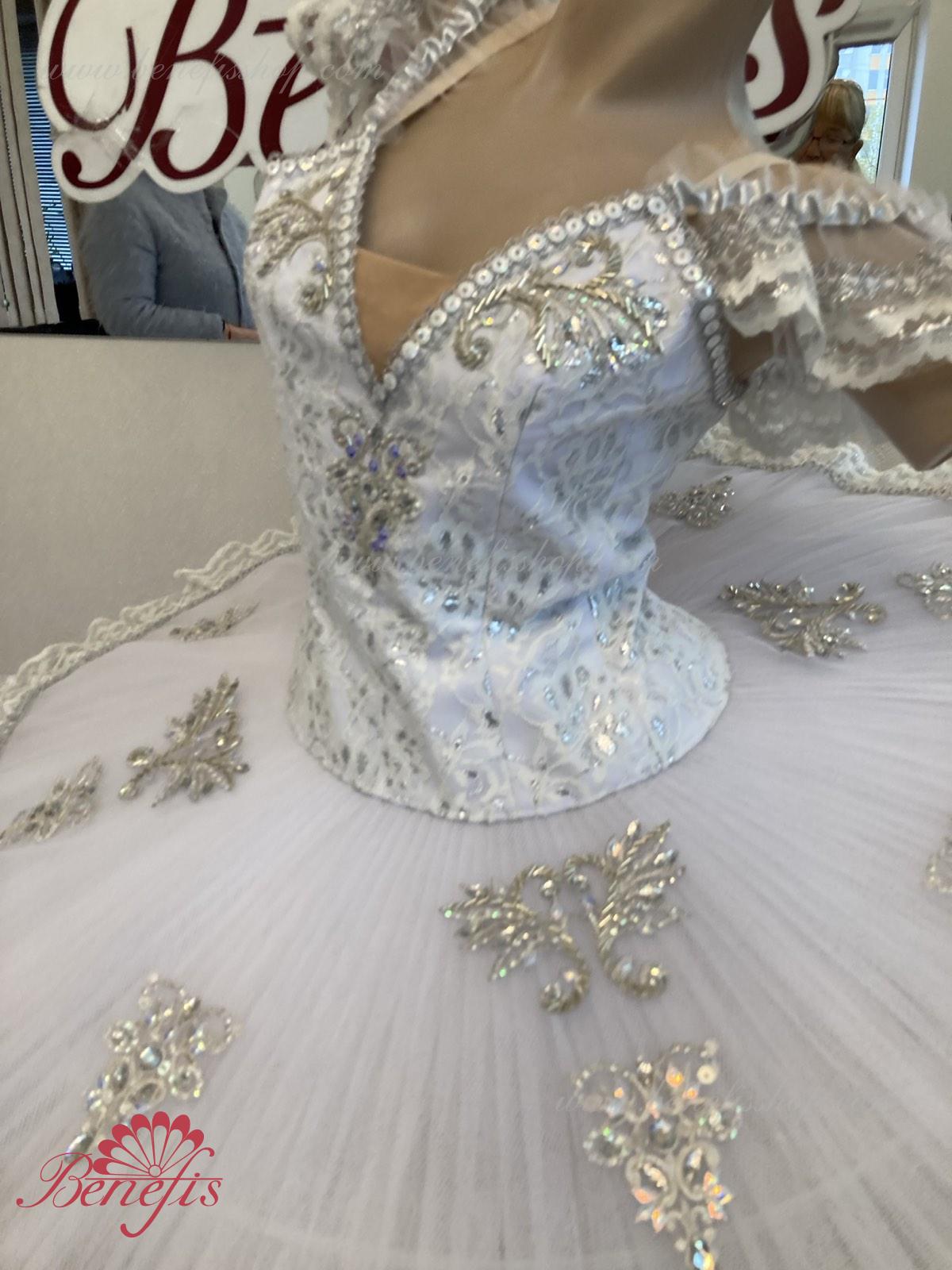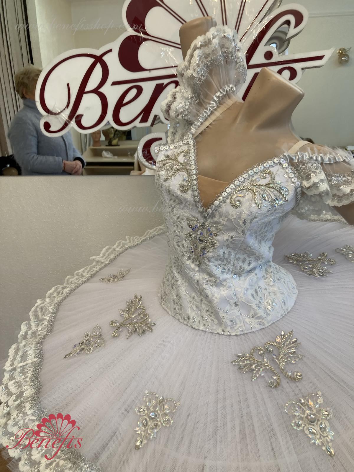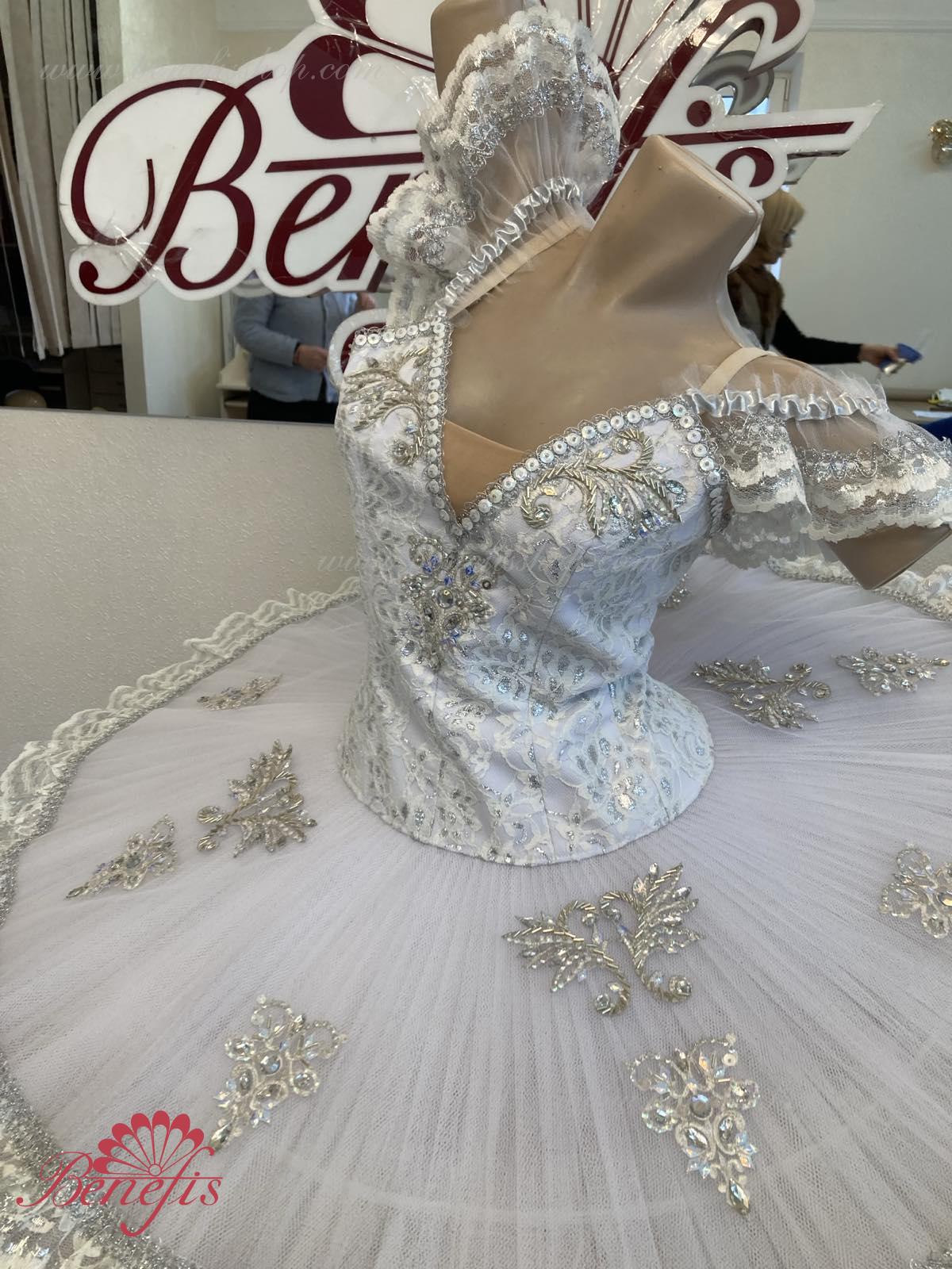 Details: costume. The bodice of the T0009 is duplicated with guipure. Extra lightweight rehearsal tutu with hoops T0001B .Eight pleated graduated net layers of semi soft tulle- seven long and one short layer, are built on net panties with 10 cm basque attached to an elastic waistband. Two crinoline resilient hoops is inserted in the middle layer with two extra short ruffles on the edge. The length of the top layer is 36-38 cm, with each successive layer being 4 cm shorter than the previous layer. Six large hook and eyes are attached at the back to fasten the skirt. The cover and the decor of the bodice are made of guipure, appliques, sequins, rhinestones, glass beads.The terms of producing of the items (since the day of receiving the money on our account): 1. Ready-made kinds of production (leotards, tights, skirts) – from several days to 3 weeks, depending on the volume of order. 2. Stage costumes – during 4-6 weeks. 3. Special orders – during 4-6 weeks. 4. The claims are considered during 2 weeks since day of receiving the order by customer. 5. We guarantee express delivery on the indicated address.
