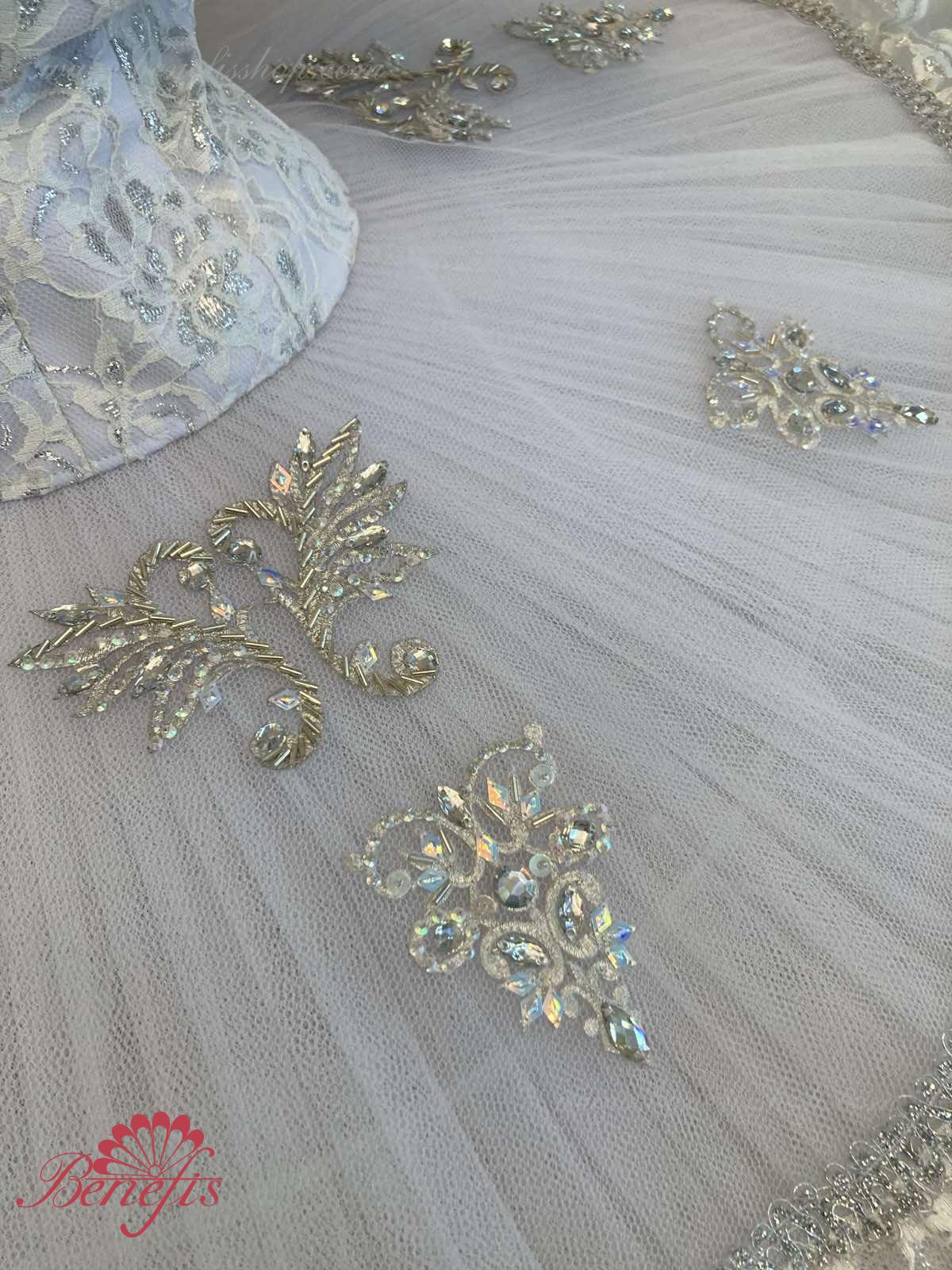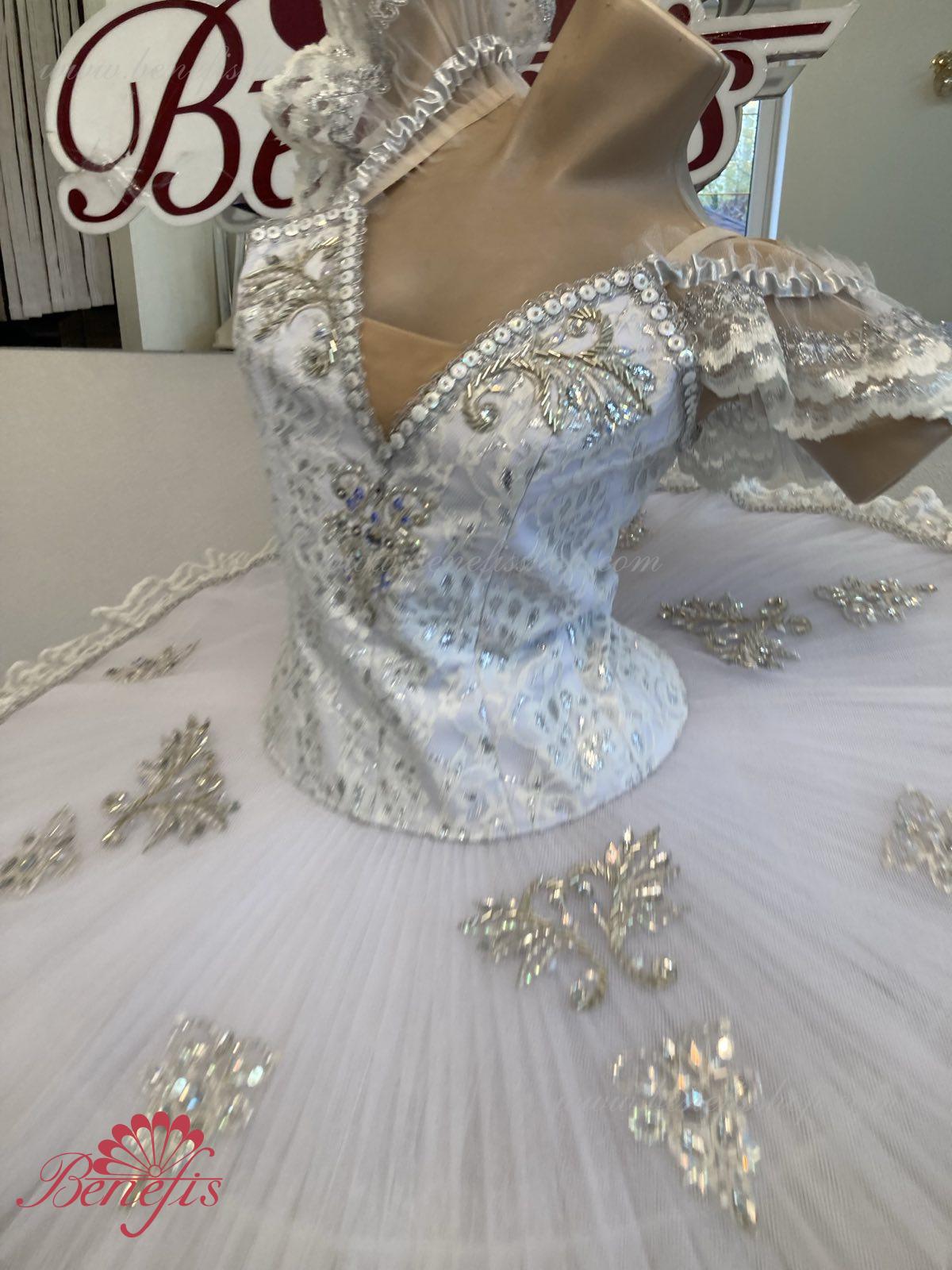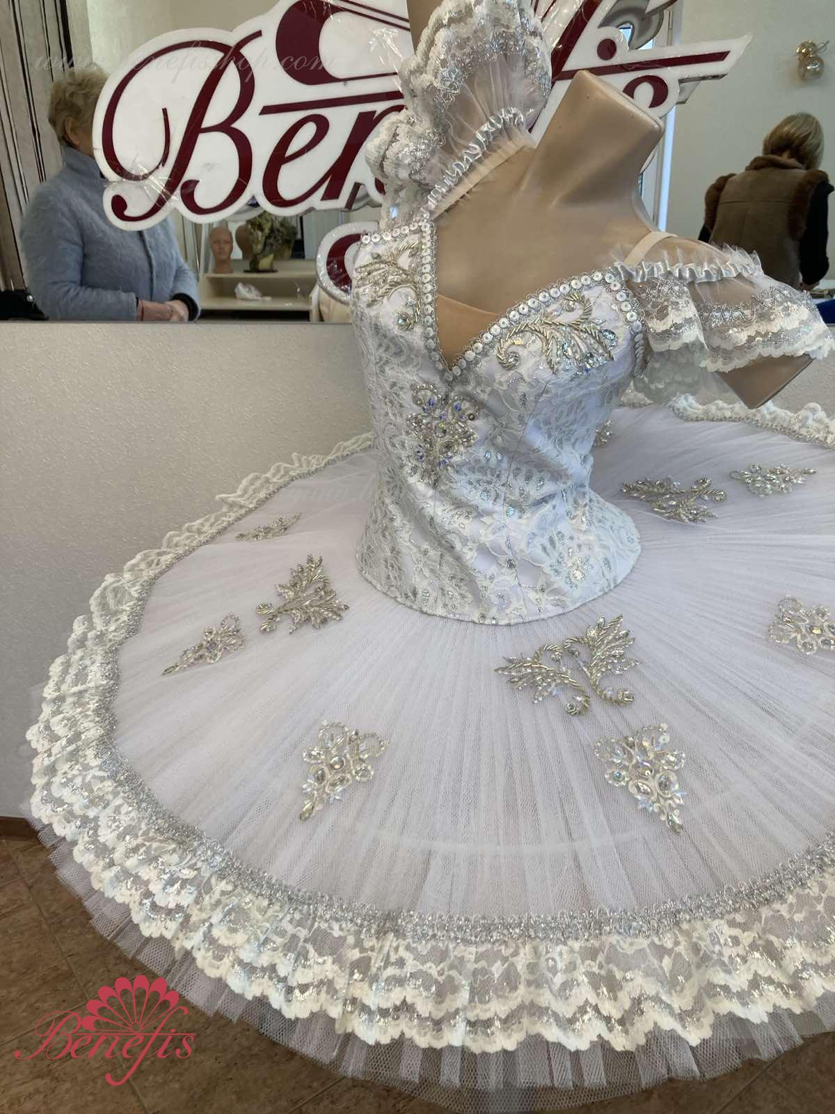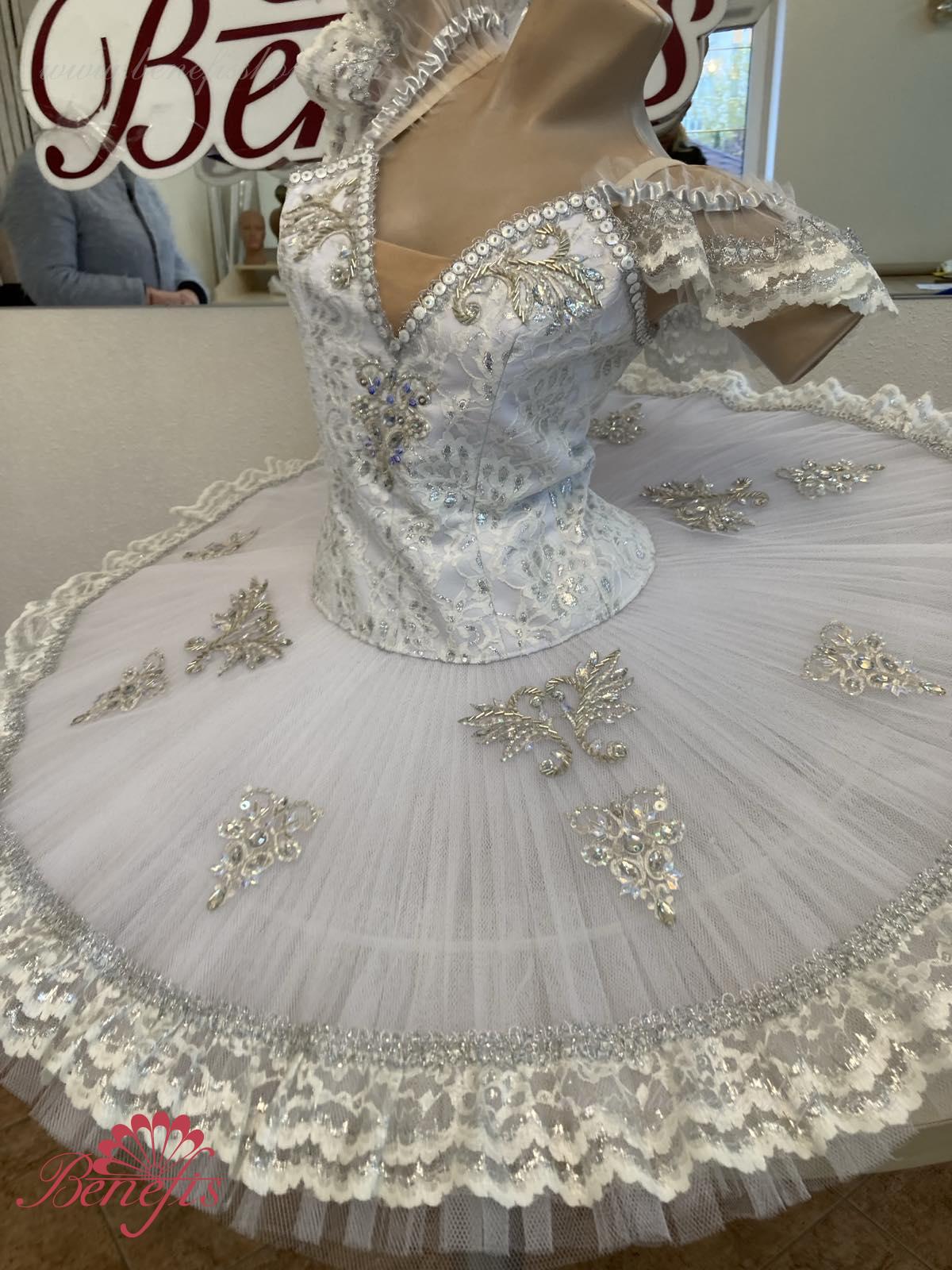 Details: costume. The bodice of the T0009 is duplicated with guipure. Extra lightweight rehearsal tutu with hoops T0001B .Eight pleated graduated net layers of semi soft tulle- seven long and one short layer, are built on net panties with 10 cm basque attached to an elastic waistband. Two crinoline resilient hoops is inserted in the middle layer with two extra short ruffles on the edge. The length of the top layer is 36-38 cm, with each successive layer being 4 cm shorter than the previous layer. Six large hook and eyes are attached at the back to fasten the skirt. The cover and the decor of the bodice are made of guipure, appliques, sequins, rhinestones, glass beads.The terms of producing of the items (since the day of receiving the money on our account): 1. Ready-made kinds of production (leotards, tights, skirts) – from several days to 3 weeks, depending on the volume of order. 2. Stage costumes – during 4-6 weeks. 3. Special orders – during 4-6 weeks. 4. The claims are considered during 2 weeks since day of receiving the order by customer. 5. We guarantee express delivery on the indicated address.