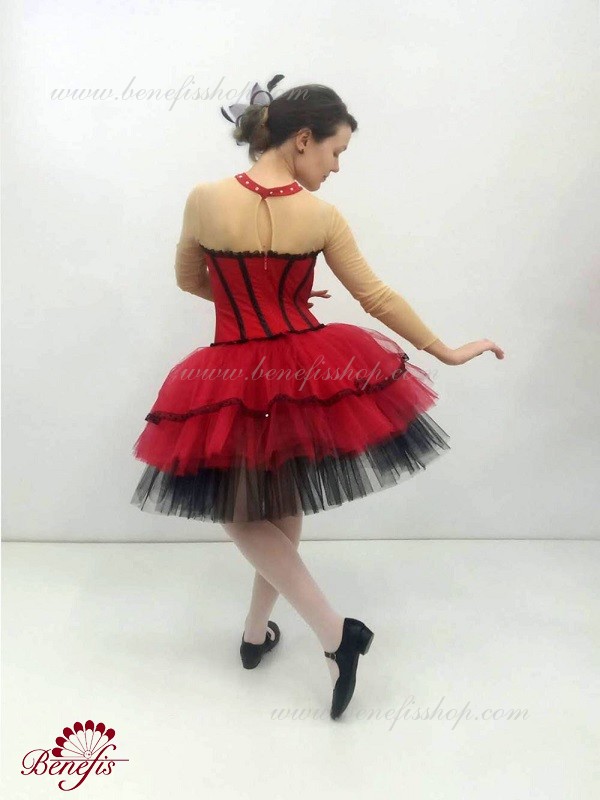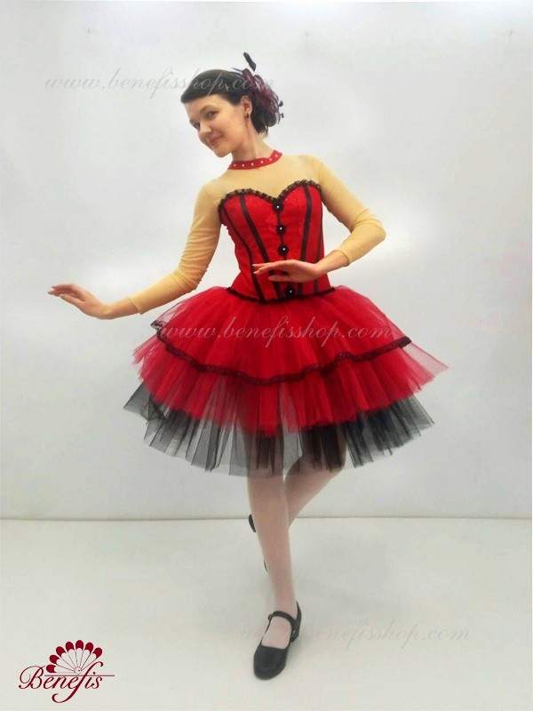 The costume consists of a corset with sleeves and a skirt connected to each other. The corset with underwire is made of satin, duplicated with guipure. The corset is fastened with a clasp. Artificial flowers, beads and lace are used as decoration.