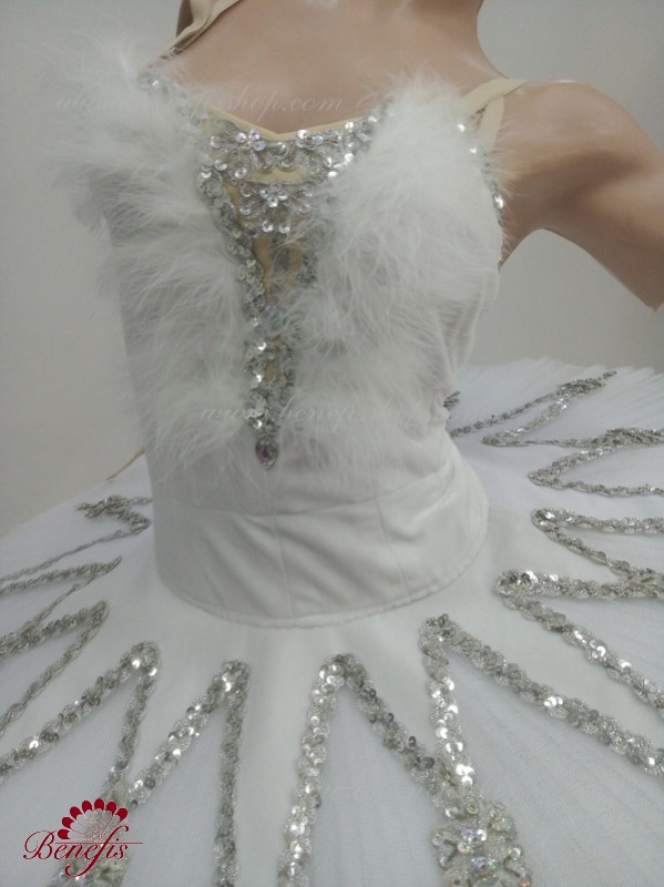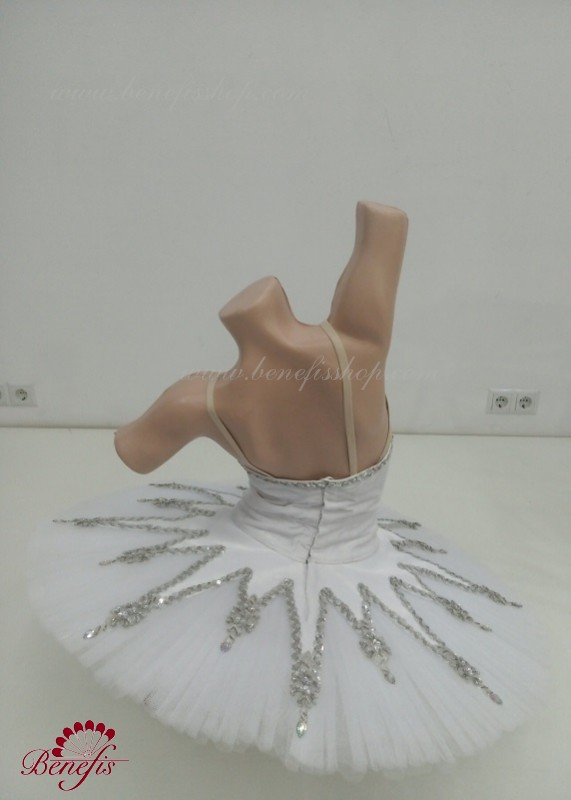 The bodice is fastened with hooks in two rows for convenient adjustment, the inner cord serves to tighten the bodice in the chest area. Eight pleated graduated layers of semi-soft tulle - seven long and one short on tulle panties with a 10 cm yoke attached to an elastic waistband. Two crinoline hoops are embedded in the middle layer with two additional short frills at the edges. The length of the top layer is 36-38 cm, each next layer is 4 cm shorter. The pack is fastened at the back with 6 large hooks and loops.