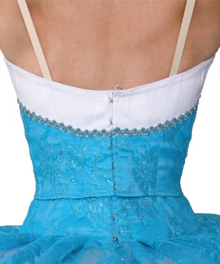 The bodice is made of the dense fabric doubled with guipure on the chest ispolzuetsya colored inset. The bodice has two rows of hooks for the comfortable regulation and an inner cord to tighten the bodice at the chest level. Straps are flesh-colored.