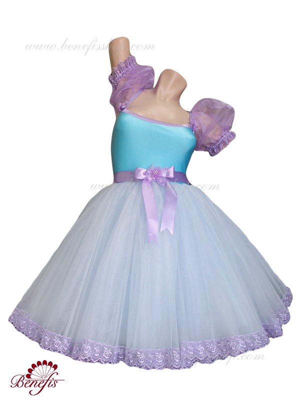 The costume is made on the basis of a leotard with sleeves - small lamps on the elastic band. The skirt is made on the basis of the professional basic romantic tutu (see model # T0008a). The skirt is made of 6 layers of tulle of different lengths, the bottom of the skirt is decorated with lace.