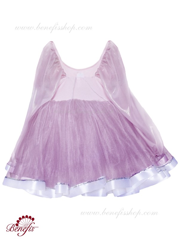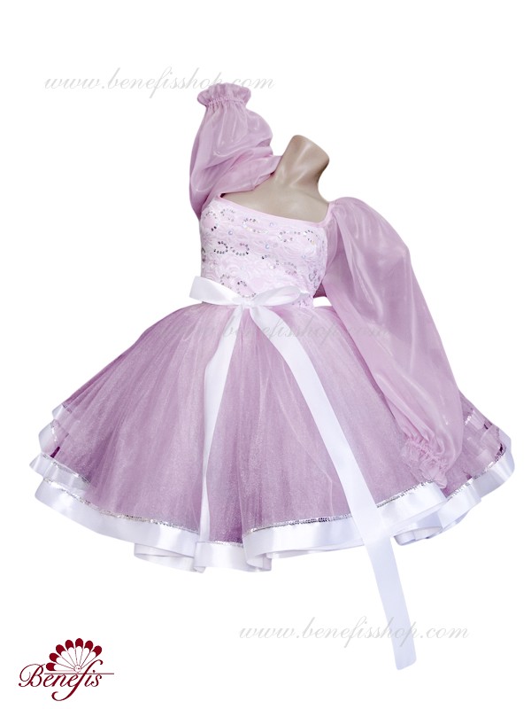 The costume is made on the basis of a leotard with sleeves with elastic bands. The skirt is made on the basis of the professional basic romantic tutu (see model # T0008). The skirt is made of 6 layers of tulle of different lengths, the bottom of the skirt is decorated with a satin ribbon. Leotard is decorated with sequins.