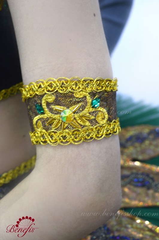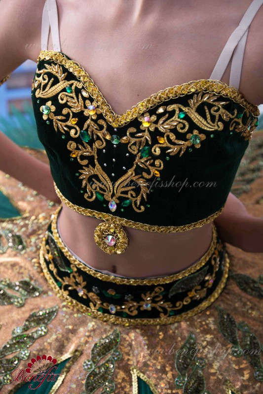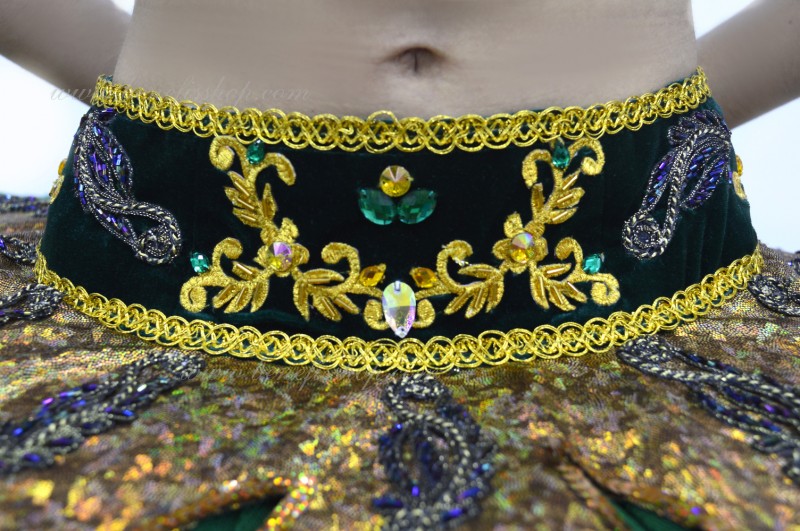 The costume is decorated with appliqués, braid, bugles, rhinestones, sparkling braid.