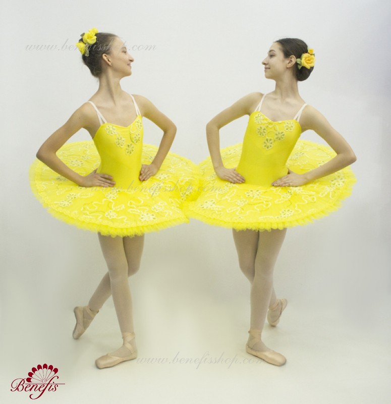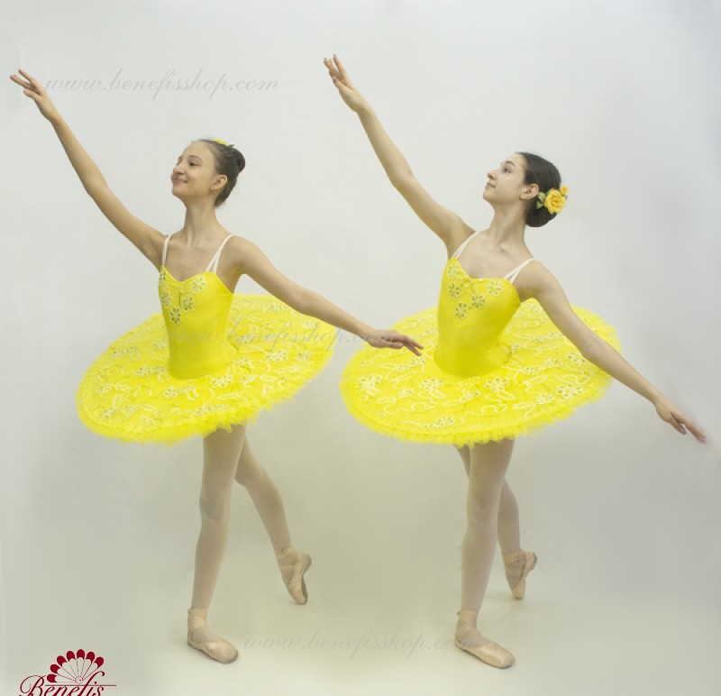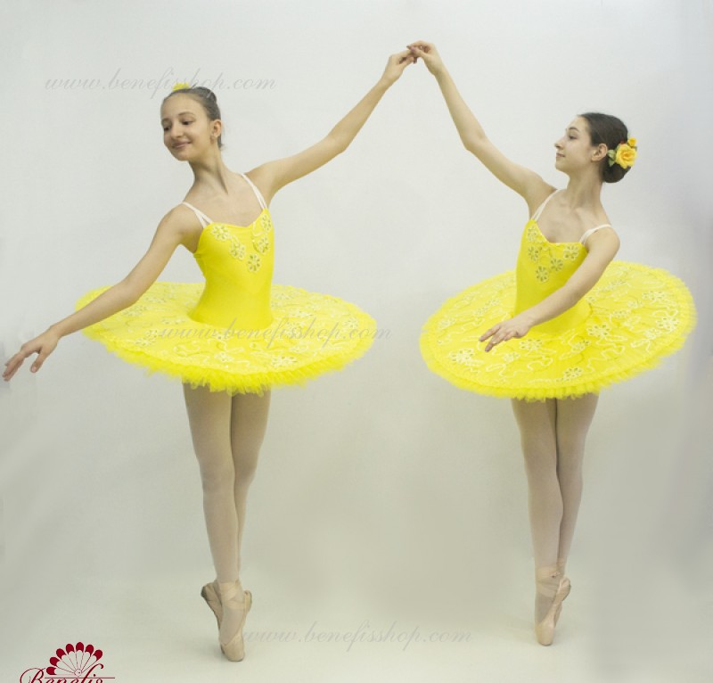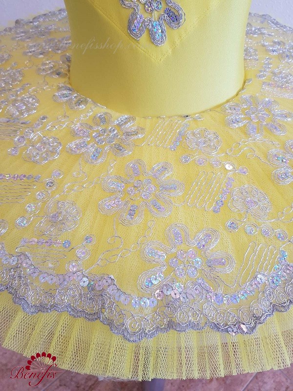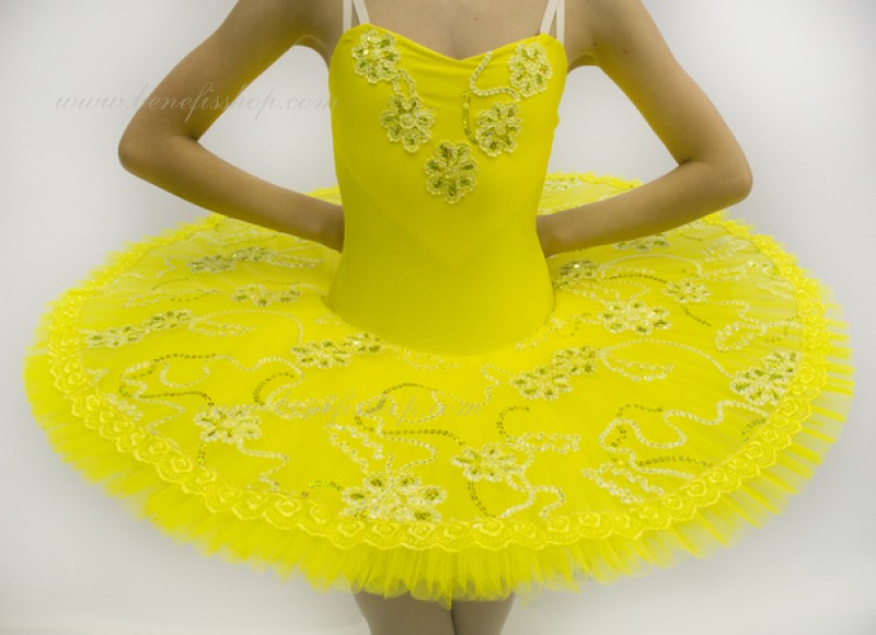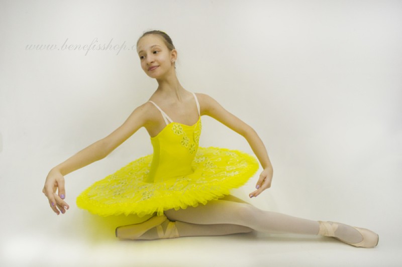 It is a professional stage costume. It is made on the basis of skirt attached to camisole leotard. The tutu is made of 6 layers of net. The top layer of the tutu is folded as top layer of any professional skirt. The length of the layers is different (at the customer’s will) and decreases towards the lower layer of the skirt. There is flounce in the middle of the layers, where the hoop is inserted. Camisole leotard is made of supplex. The bodice, according to the customer’s desire, may be made of velvet and decorated slightly with crystals for an additional payment.