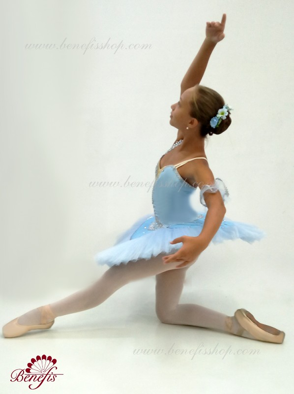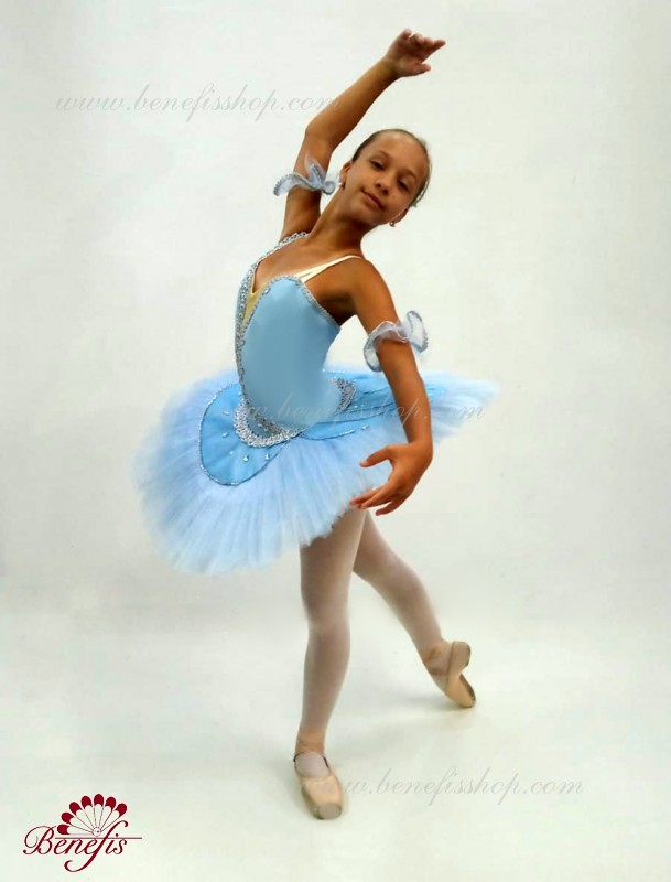 Stage costume is made of bodice T0009 and lightweight tutu T0001K. The decor consists of decorative braid, shiny braid, rhinestones and sequins. The arm ruffles are also decorated with braid.