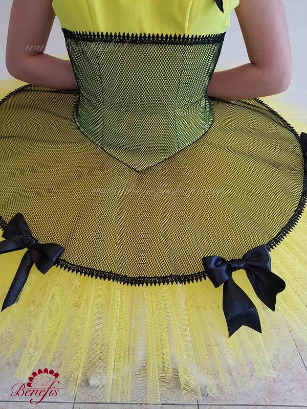 This professional stage costume is made on the basis of a professional base pack #T0001E (see the section "Base packs"). The bodice is fastened at the back with two rows of hooks. In the chest area, the bodice is fastened with an internal cord in the chest area. Bodice P1312 . Seven pleated graduated layers of hard tulle on tulle panties with a 6 cm yoke attached to an elastic waistband. A steel elastic hoop is embedded in the middle layer with two additional short frills at the edges. The length of the top layer is 34 cm . The length of the layers is different (depending on the size of the customer), it is decreasing in the direction of the lower layer.