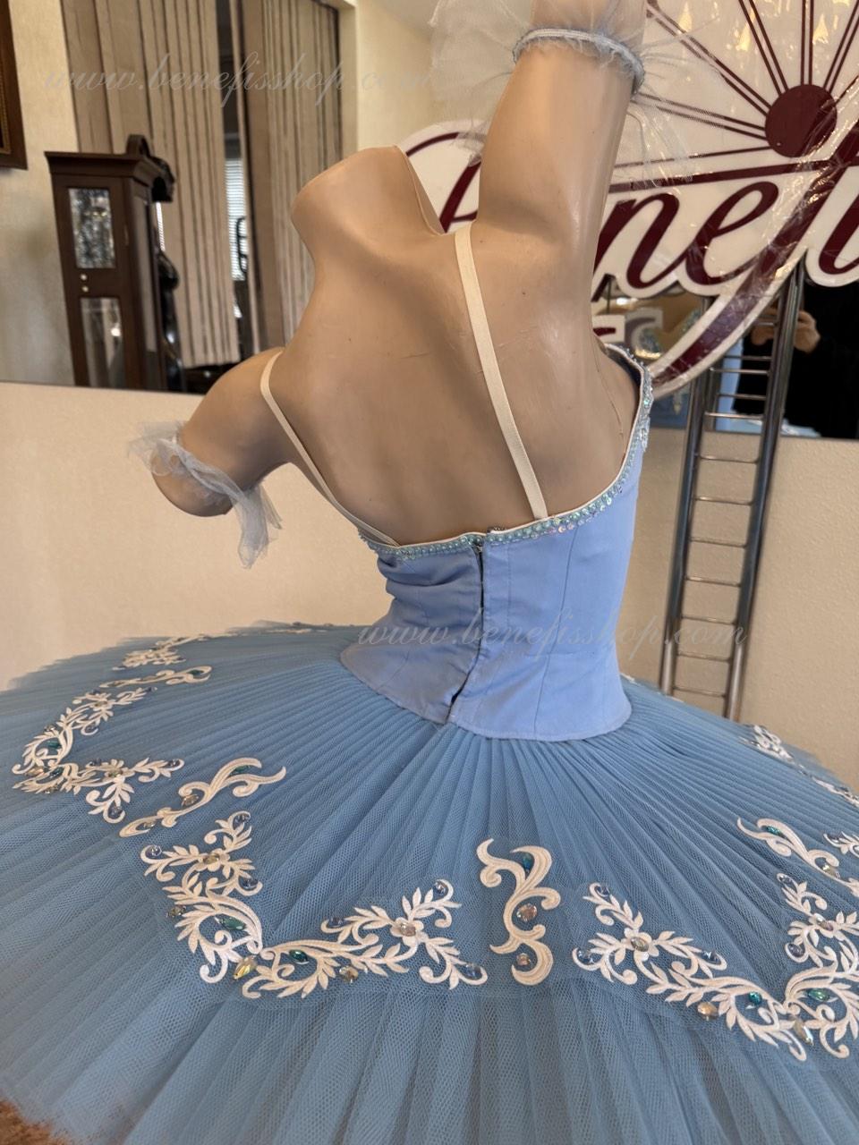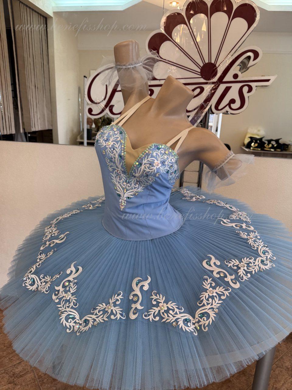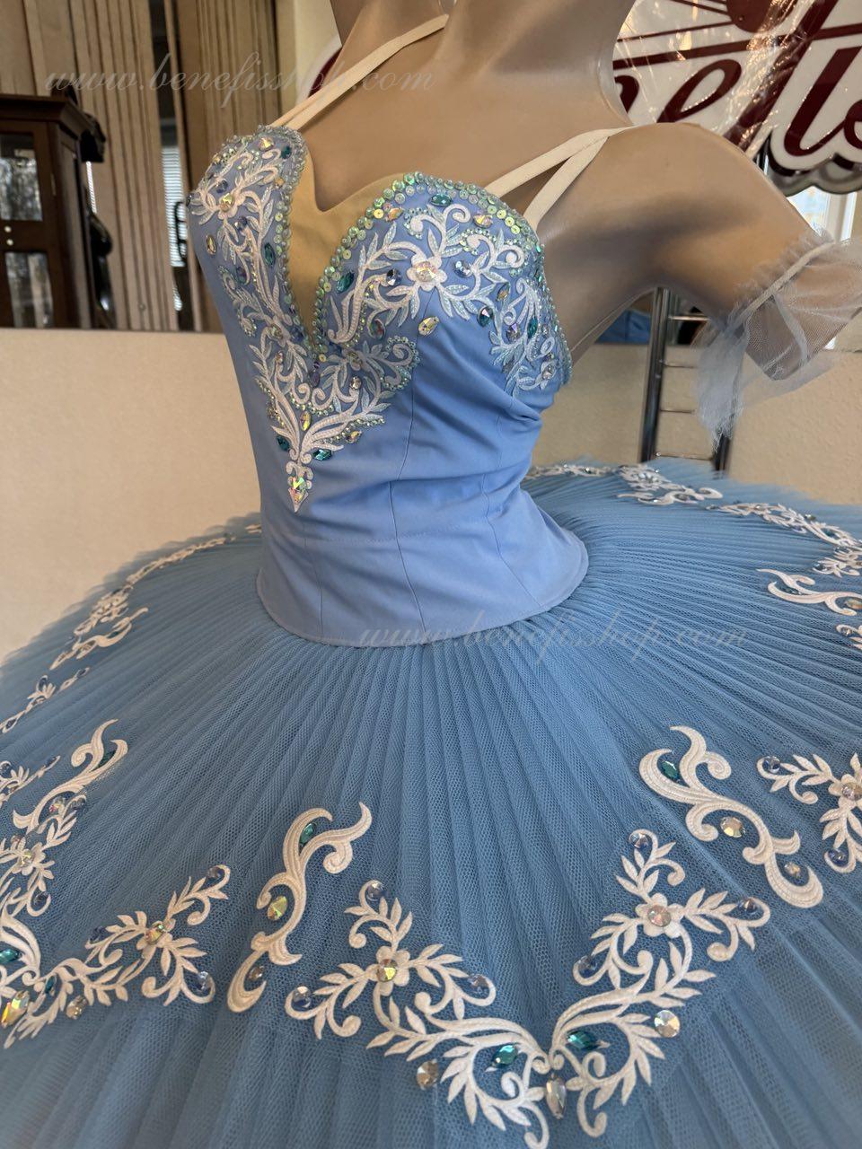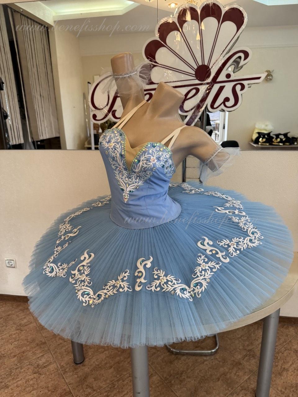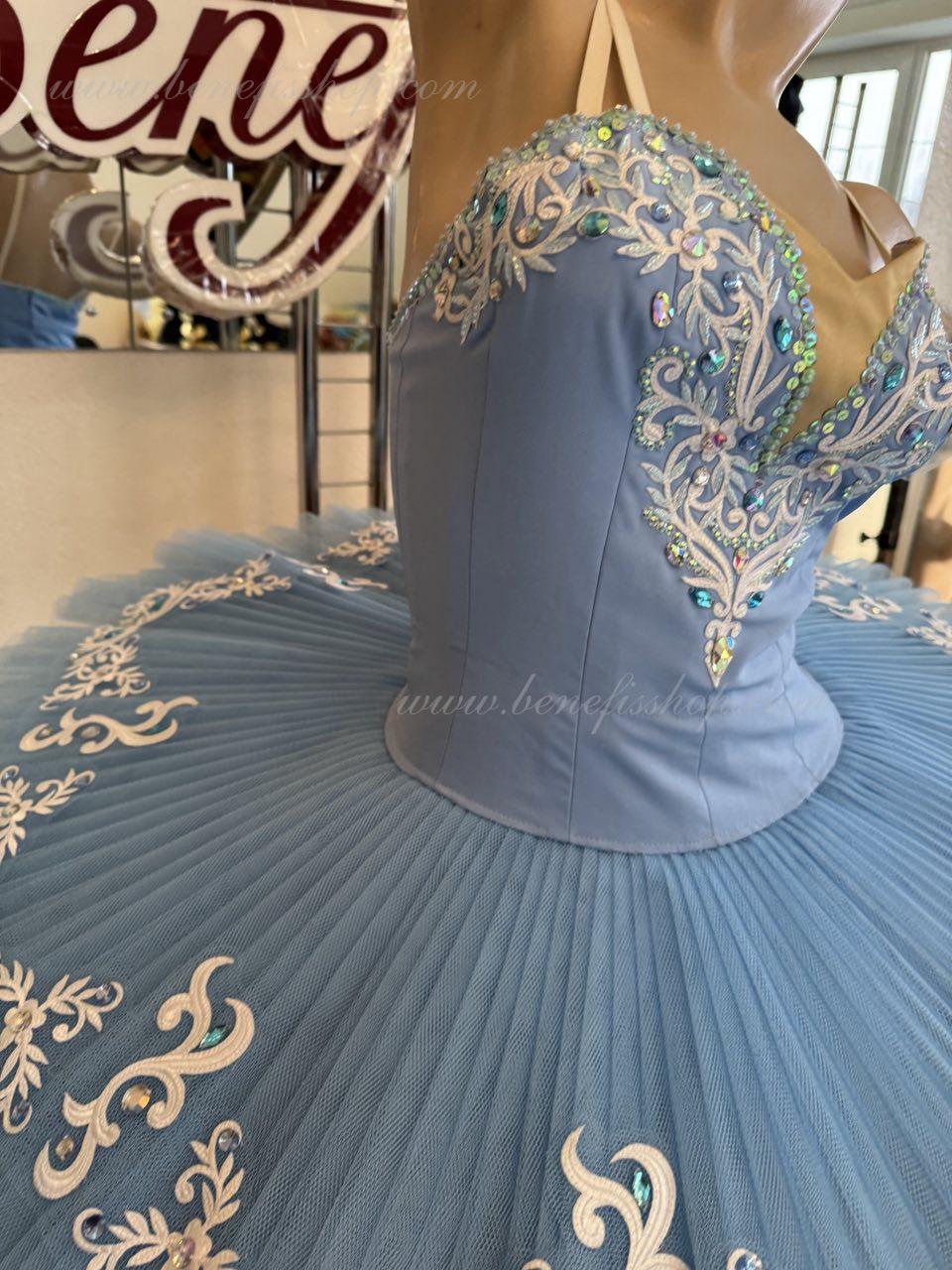 The bodice is fastened with hooks in two rows for convenient adjustment, the inner cord serves to tighten the bodice in the chest area. Eight pleated graduated layers of semi-soft tulle - seven long and one short on tulle panties with a 10 cm yoke attached to an elastic waistband. Two crinoline hoops are embedded in the middle layer with two additional short frills at the edges. The length of the top layer is 36-38 cm, each next layer is 4 cm shorter. The pack is fastened at the back with 6 large hooks and loops.