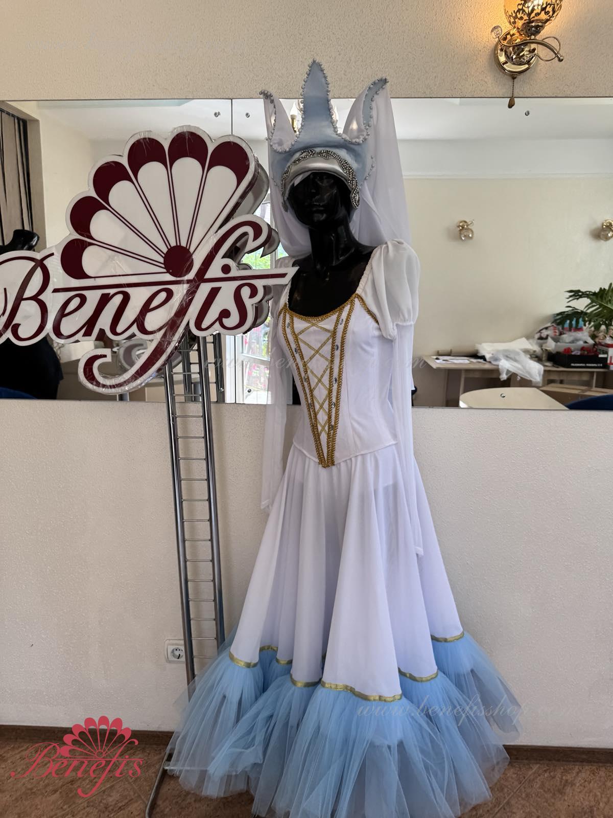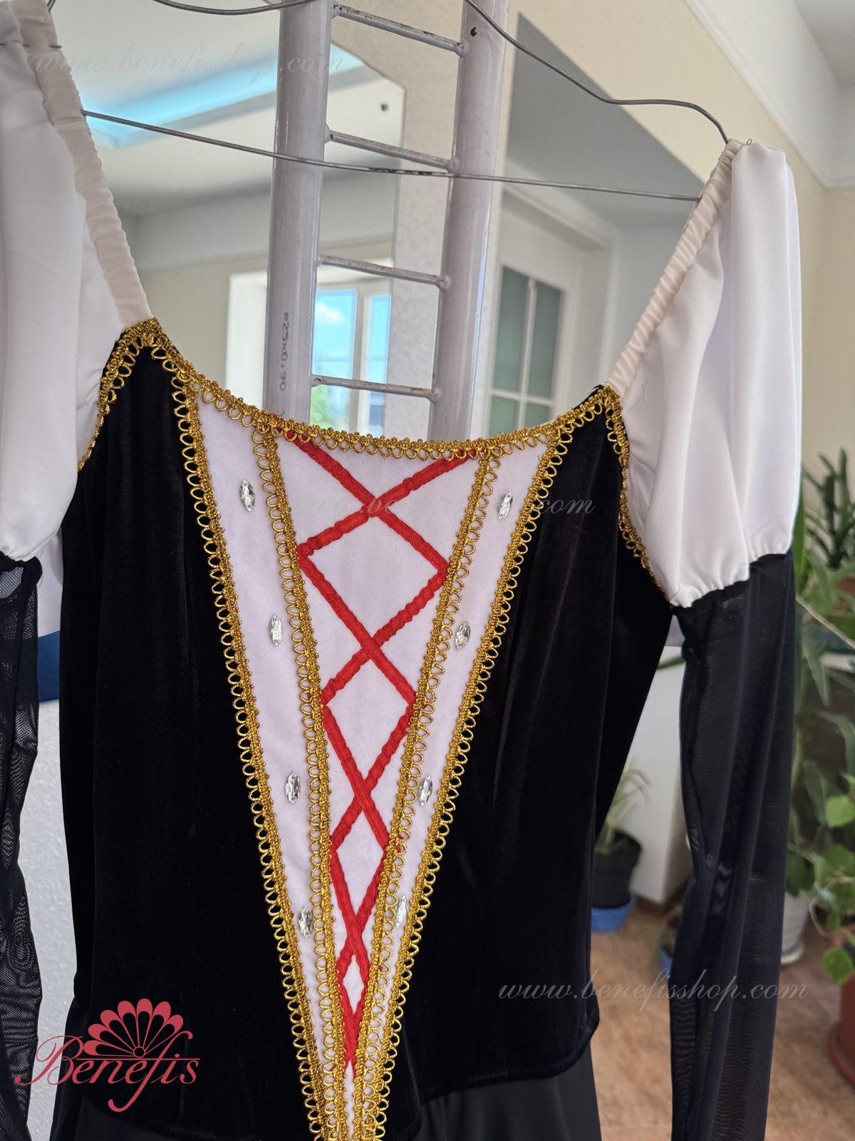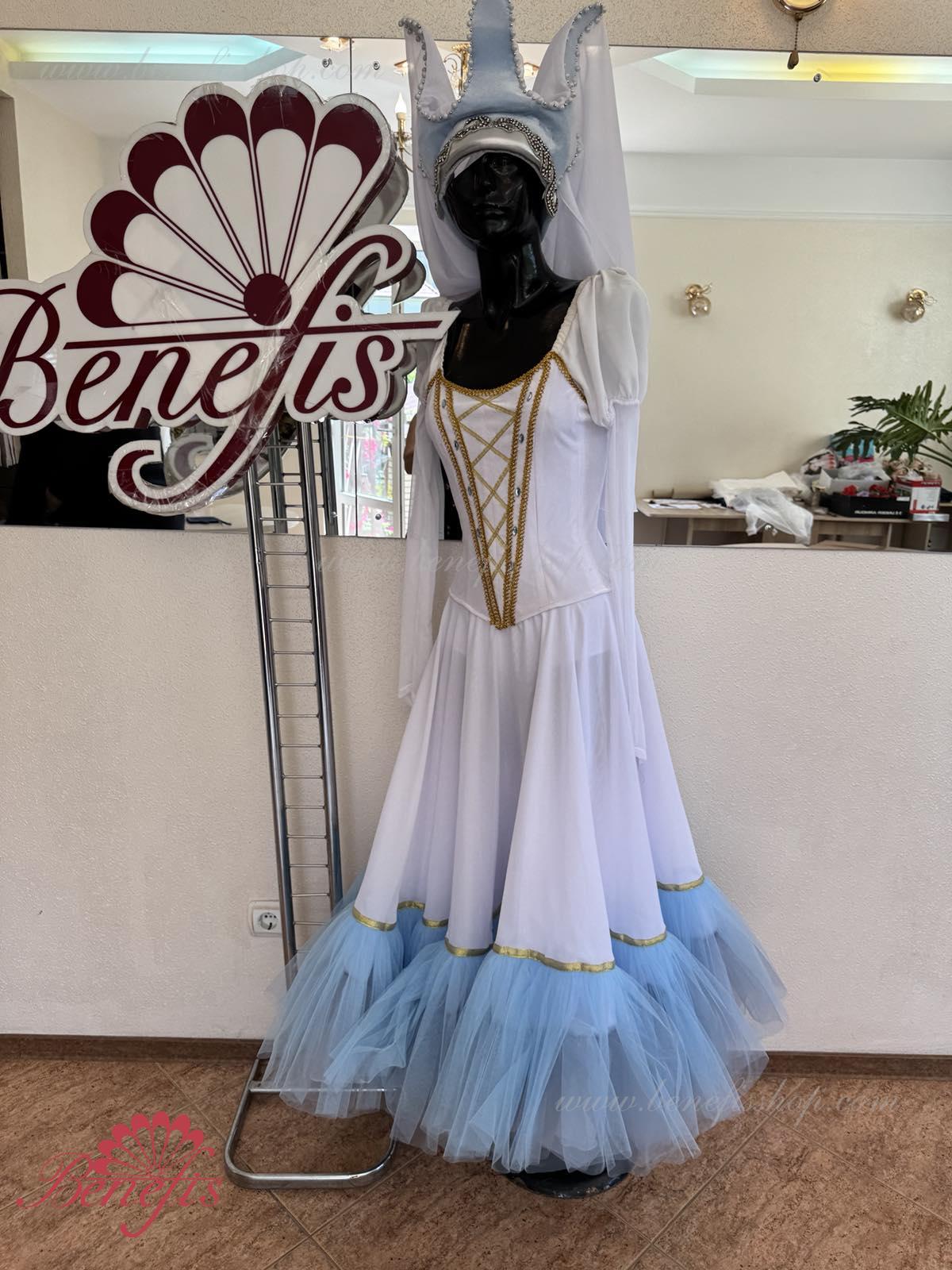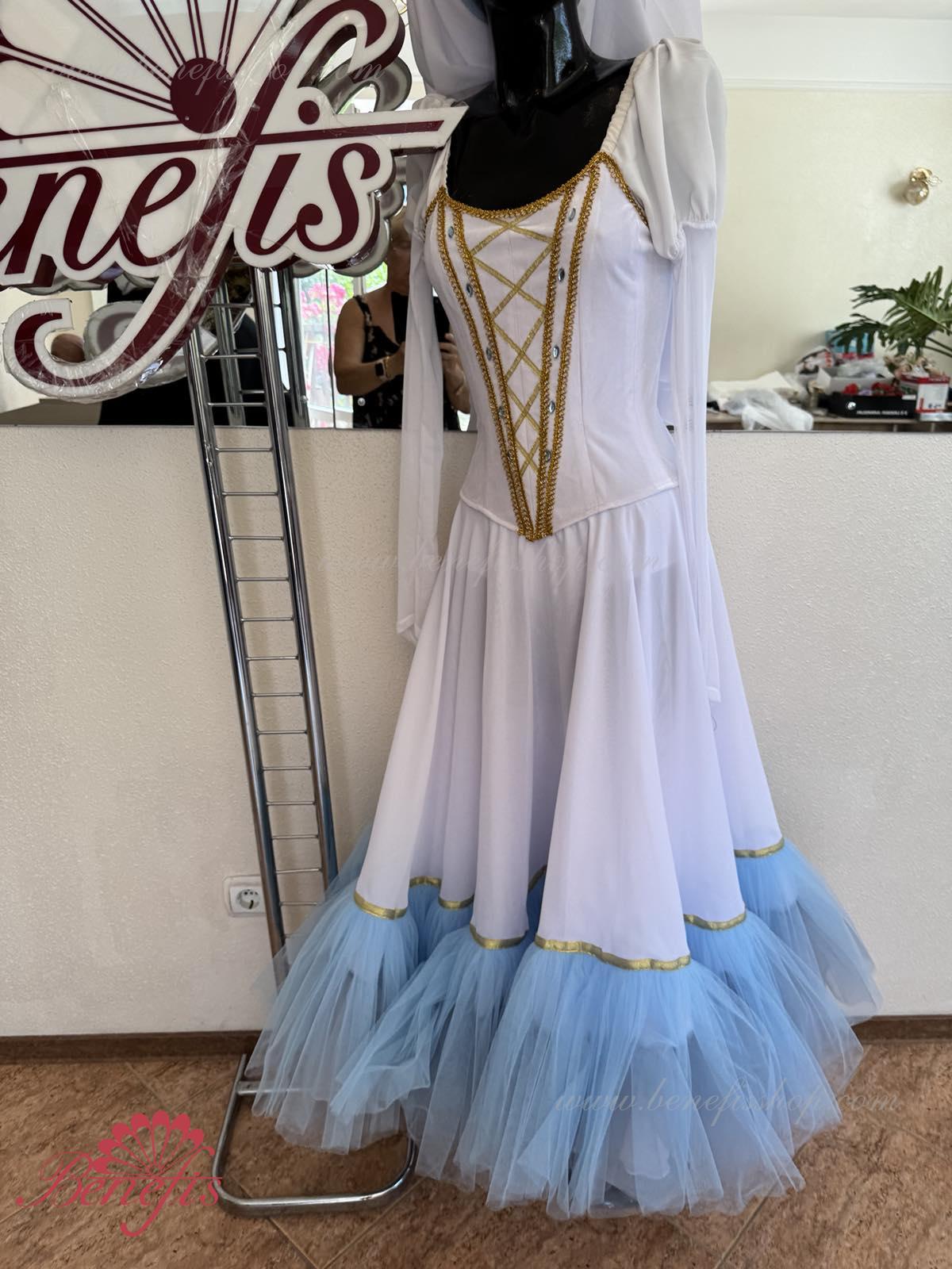 Details: costume. The bodice is made of velvet with an ear, a cape and sleeves. 2 Skirts are made of ankle-length chiffon. Decor: gold braid, rhinestones. All these delicate décor elements are selected in accordance with the costume’s tint and impart a magnificent look to the costume. For a better safety of this costume and transportation facility, You can purchase a tutu bag. See \"Accessories\" section, code S0001.