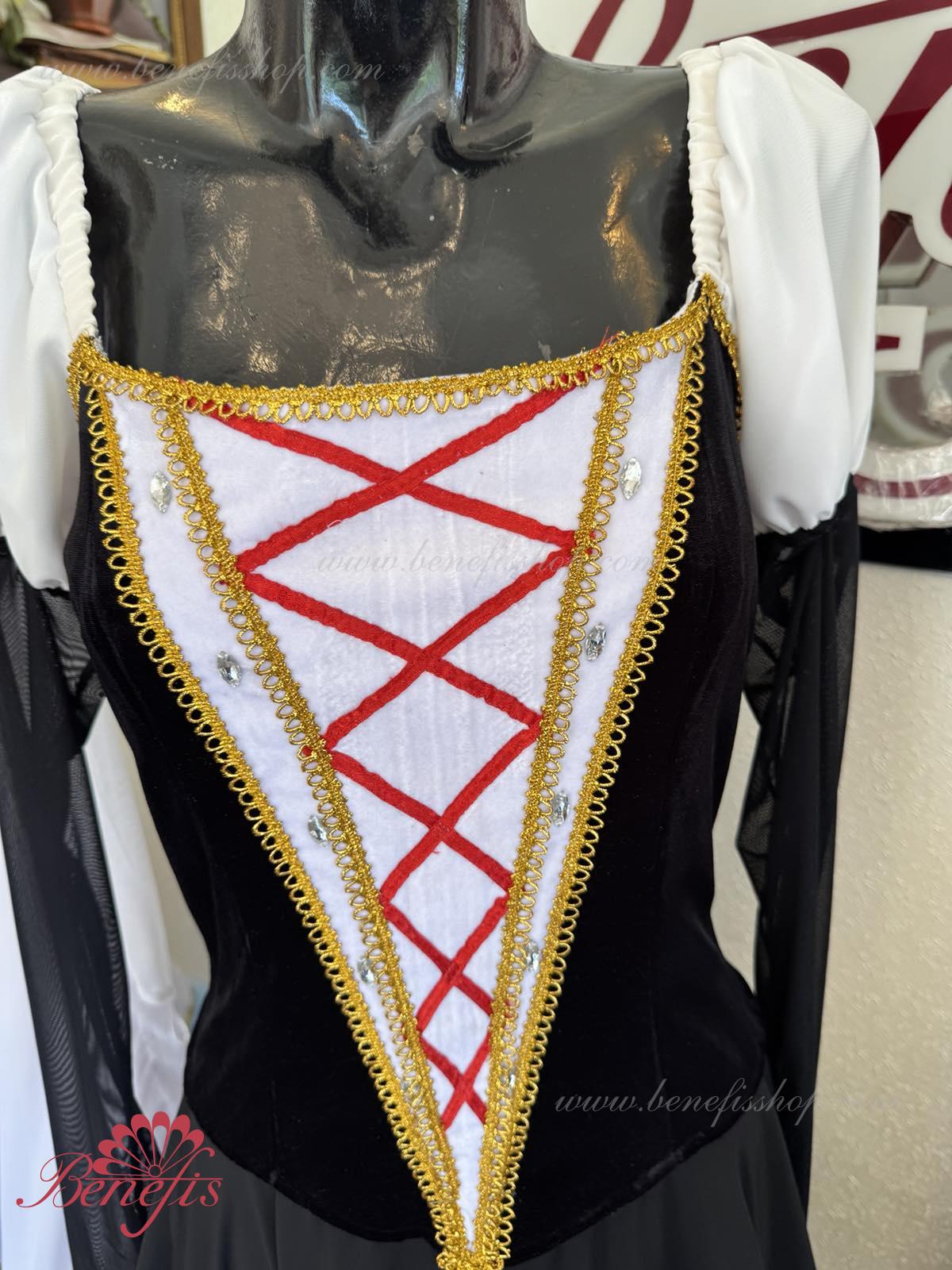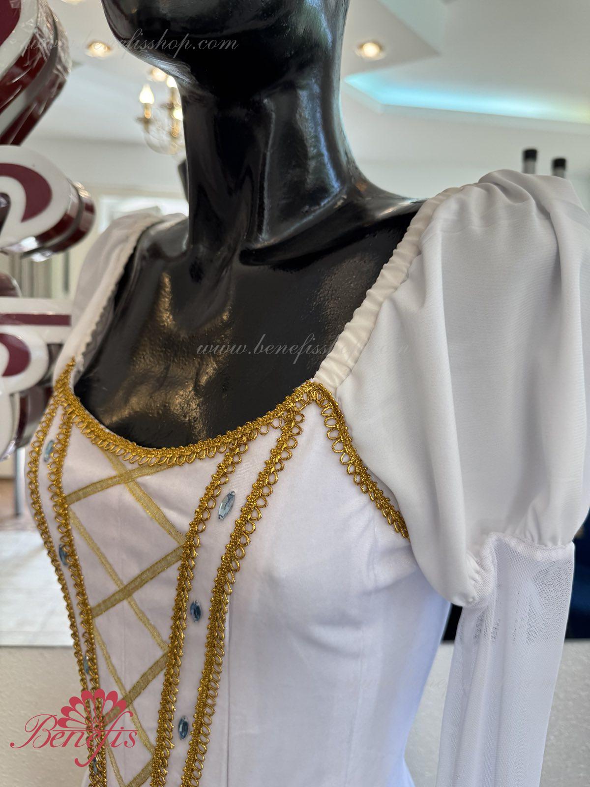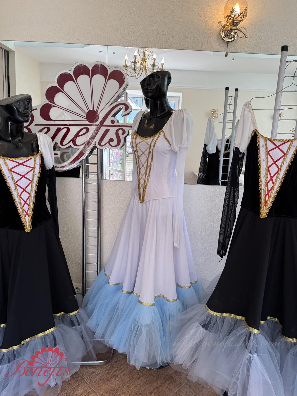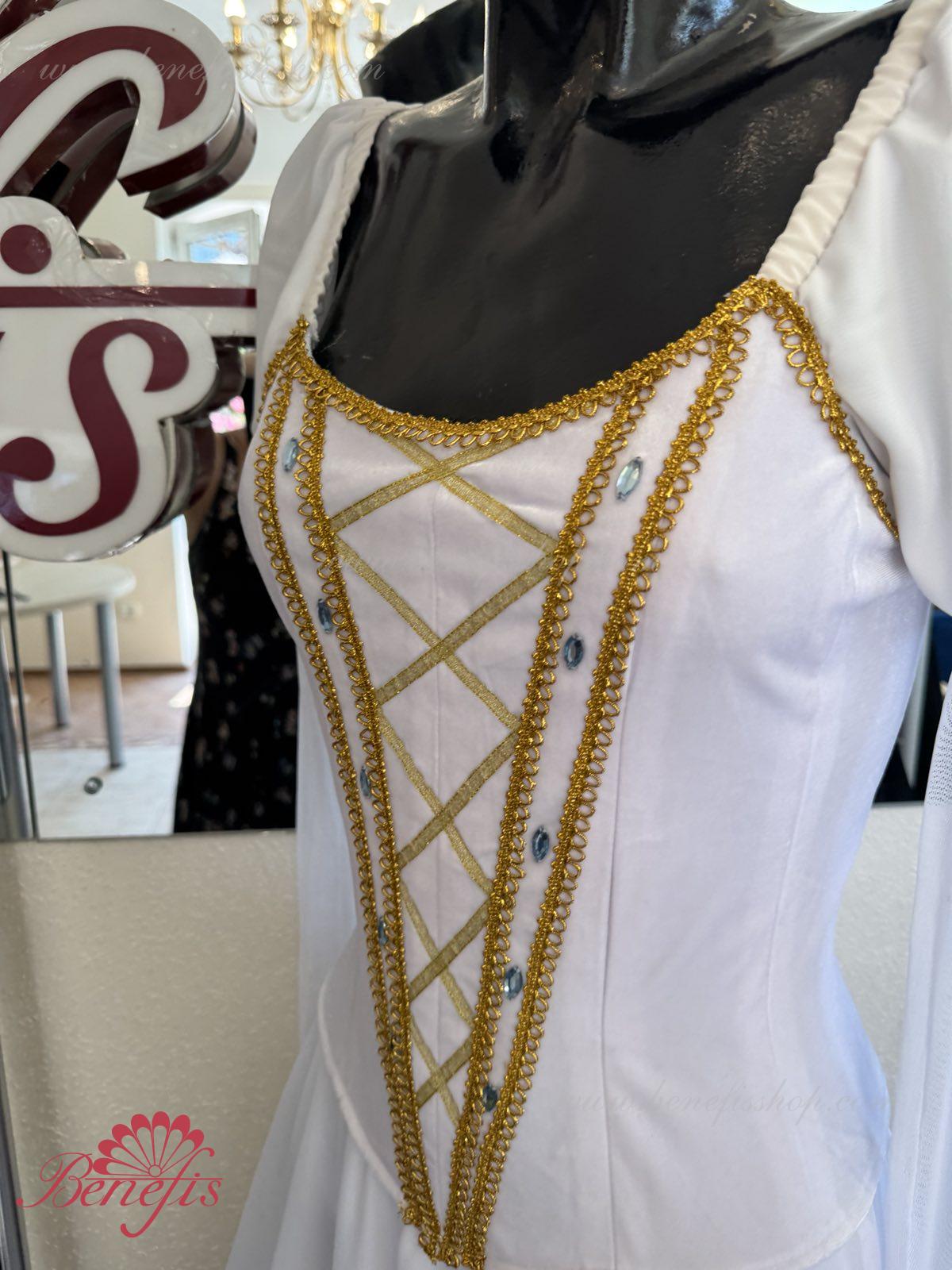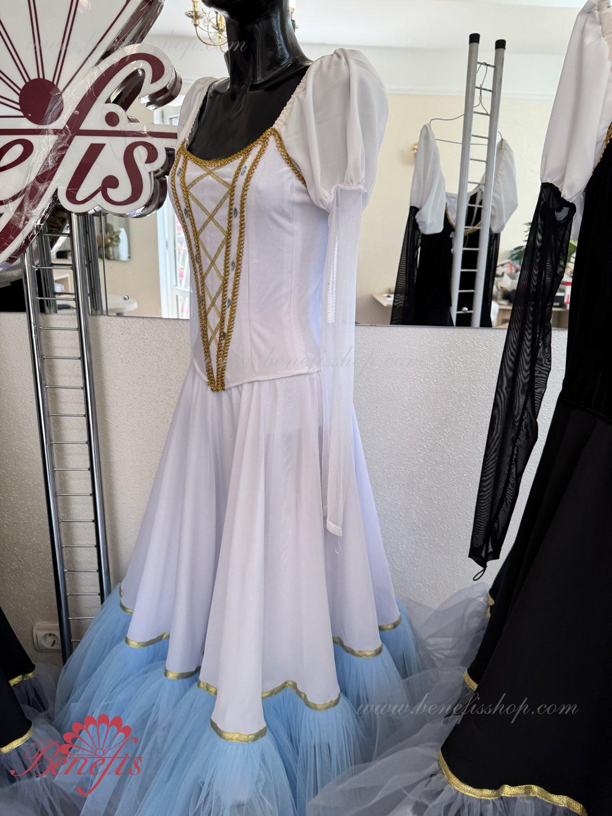 Details: costume. The bodice is made of velvet with an ear, a cape and sleeves. 2 Skirts are made of ankle-length chiffon. Decor: gold braid, rhinestones. All these delicate décor elements are selected in accordance with the costume’s tint and impart a magnificent look to the costume. For a better safety of this costume and transportation facility, You can purchase a tutu bag. See \"Accessories\" section, code S0001.