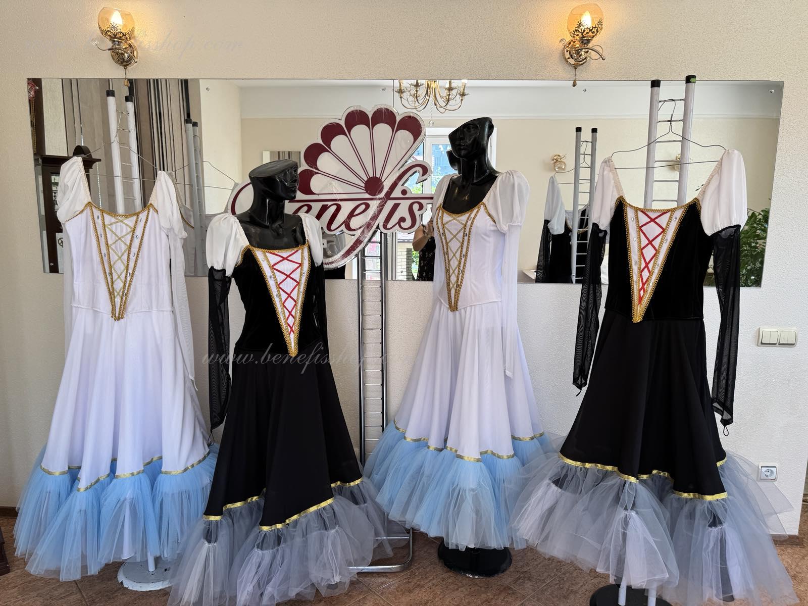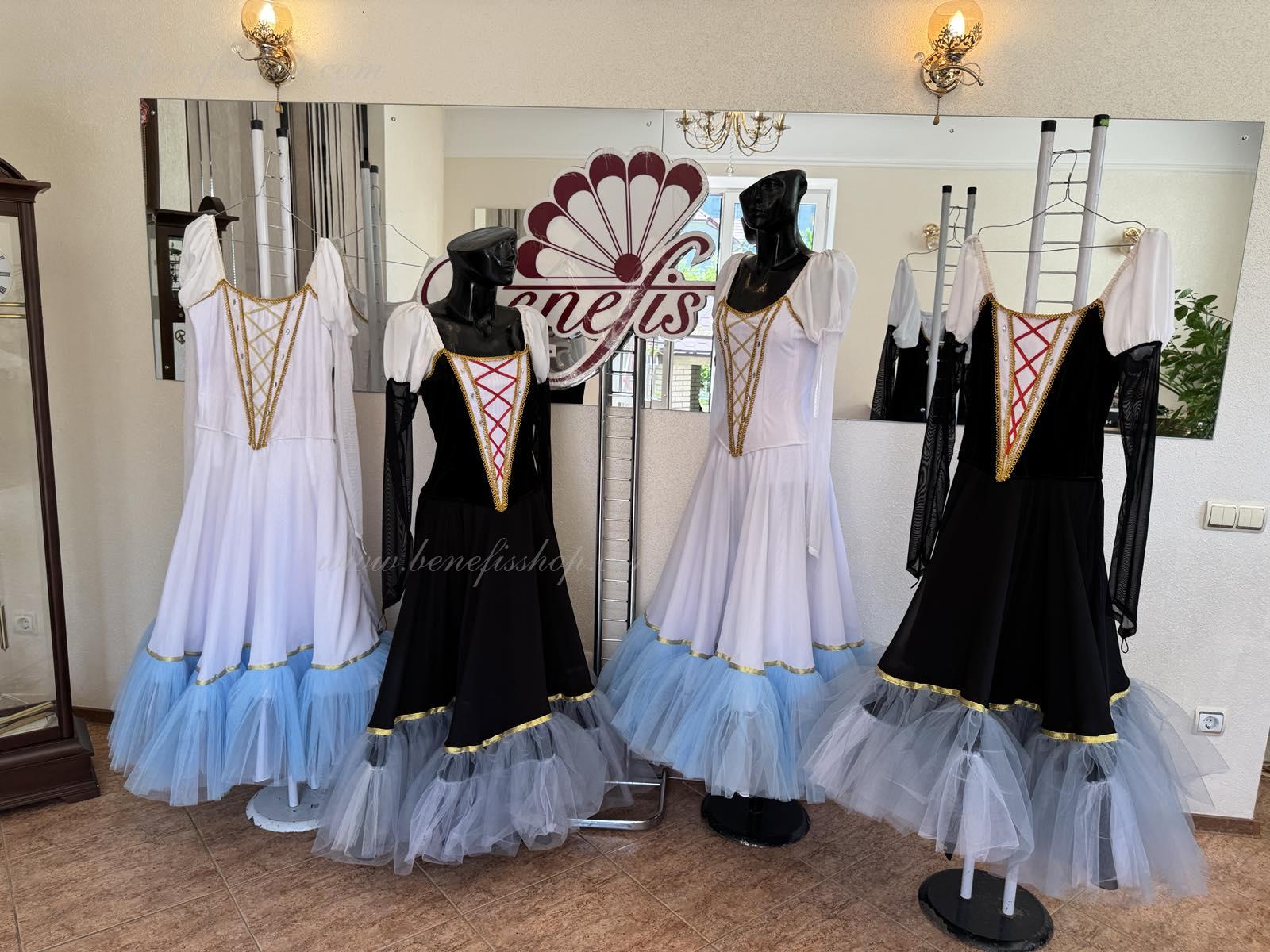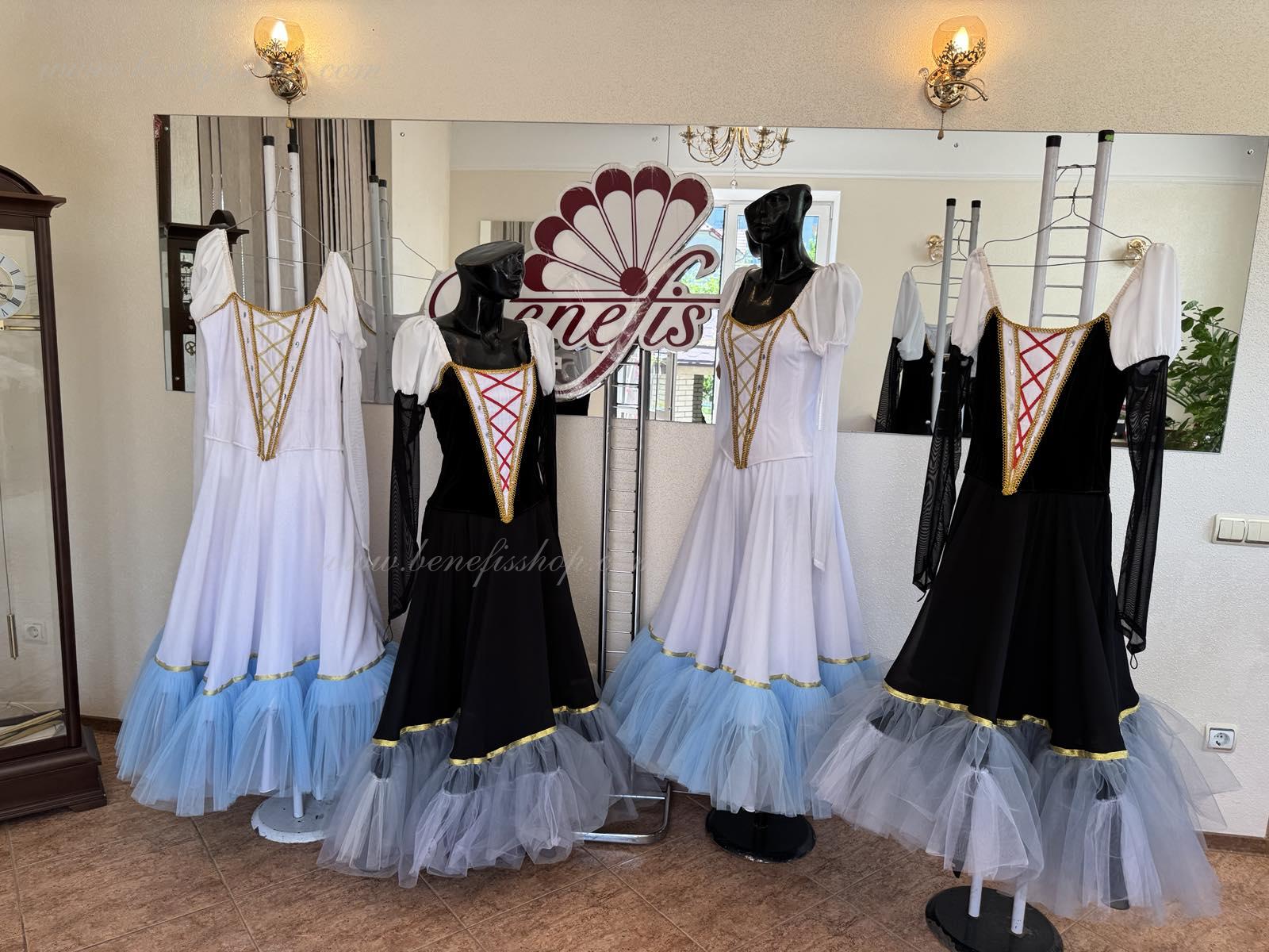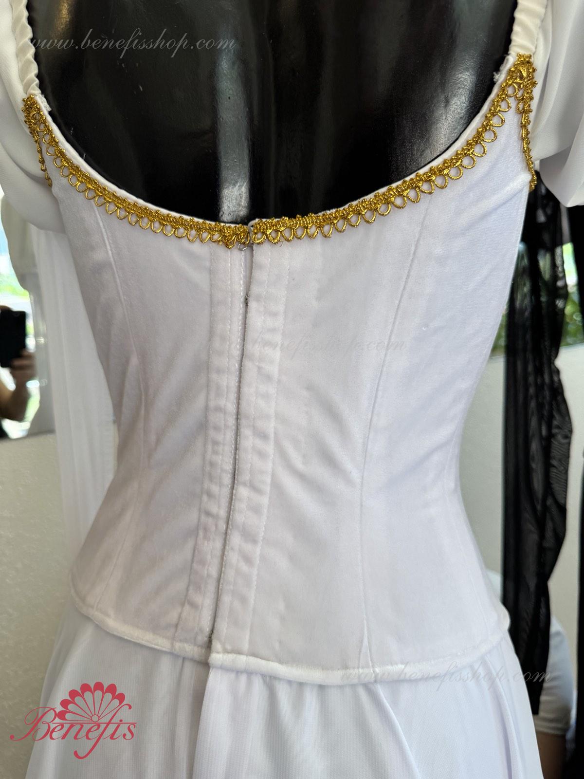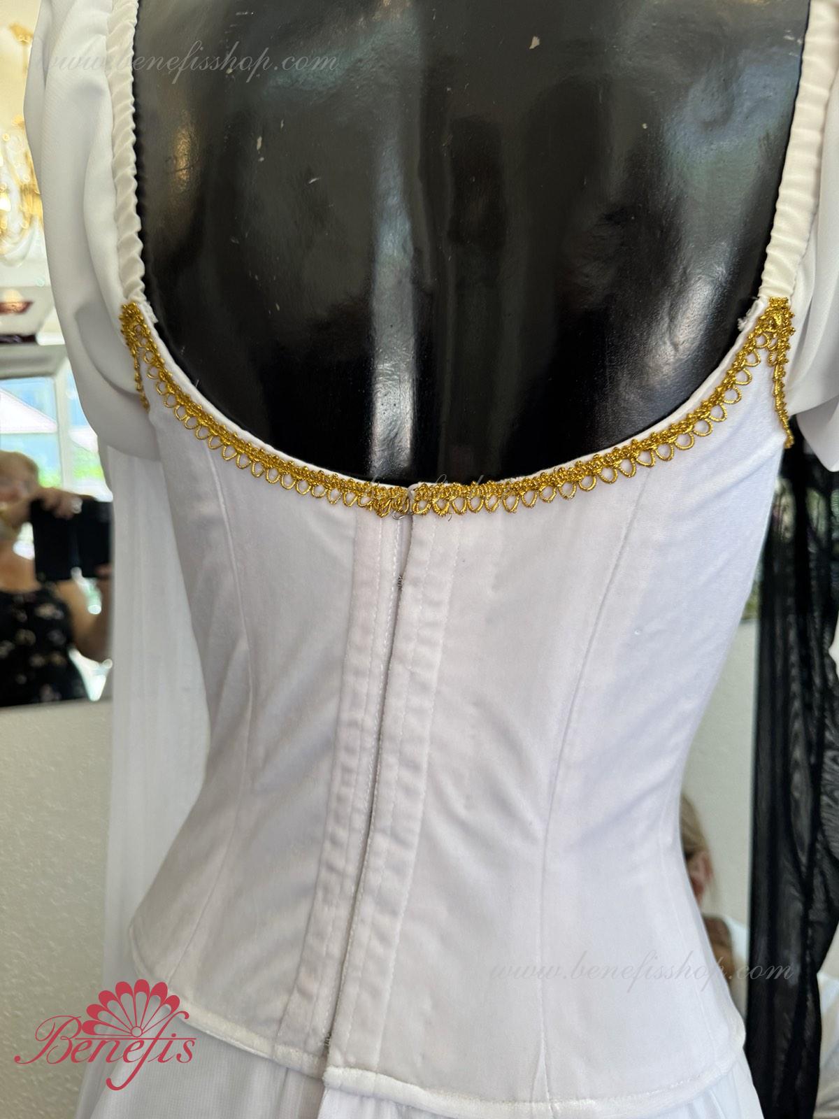 Details: costume. The bodice is made of velvet with an ear, a cape and sleeves. 2 Skirts are made of ankle-length chiffon. Decor: gold braid, rhinestones. All these delicate décor elements are selected in accordance with the costume’s tint and impart a magnificent look to the costume. For a better safety of this costume and transportation facility, You can purchase a tutu bag. See \"Accessories\" section, code S0001.