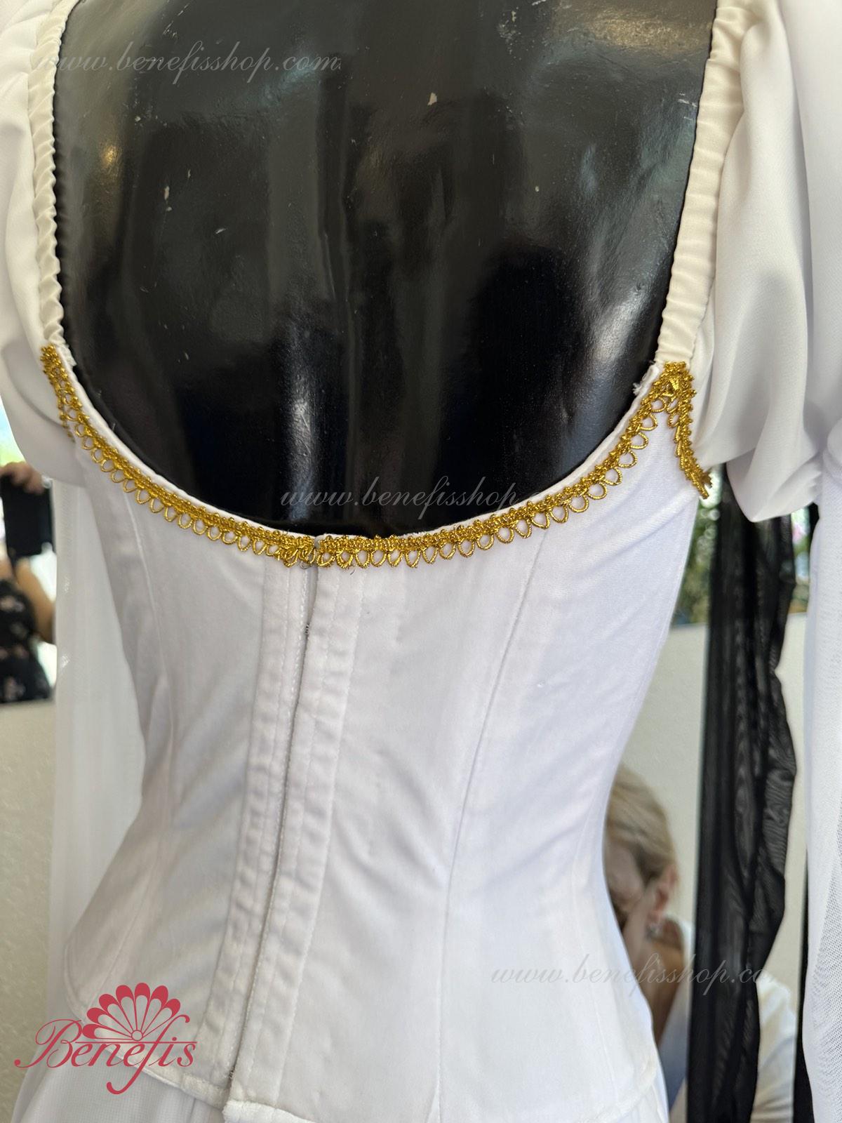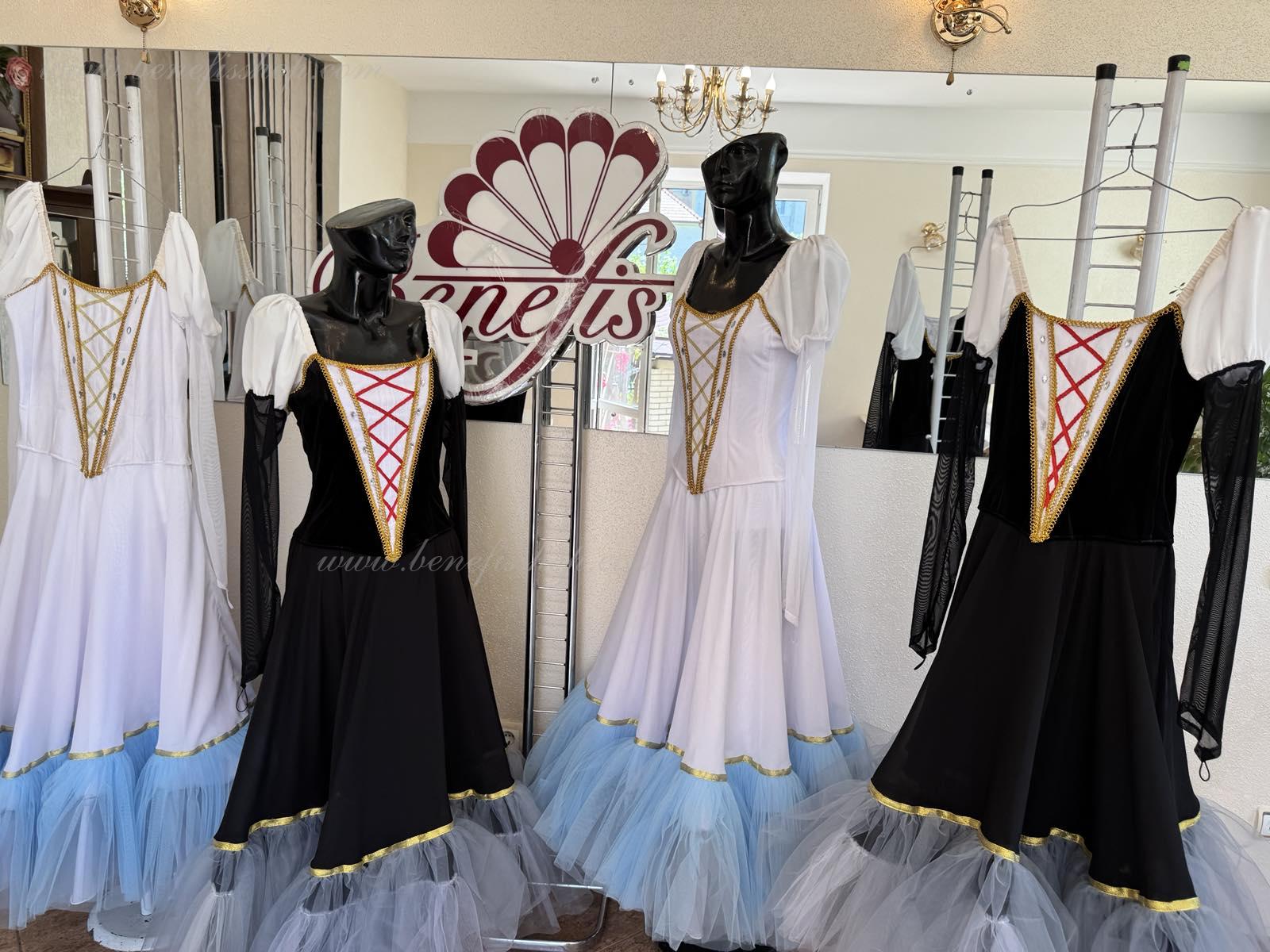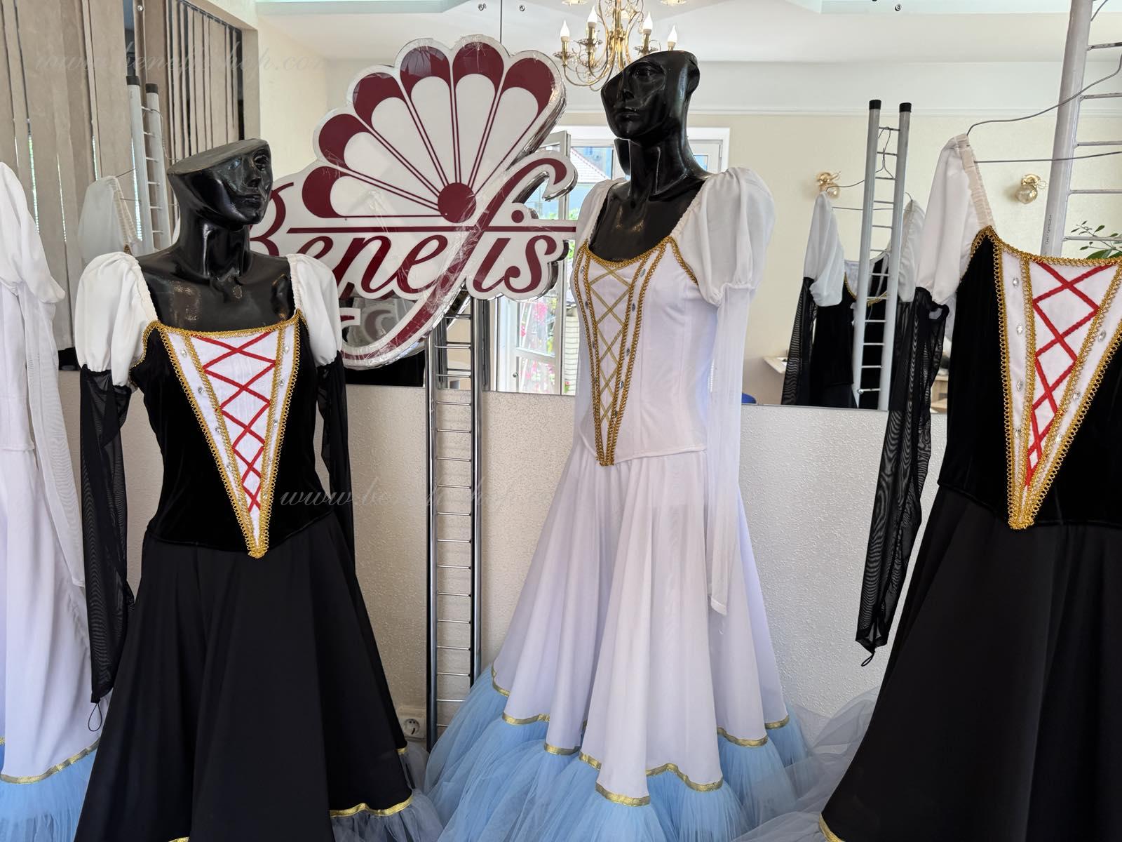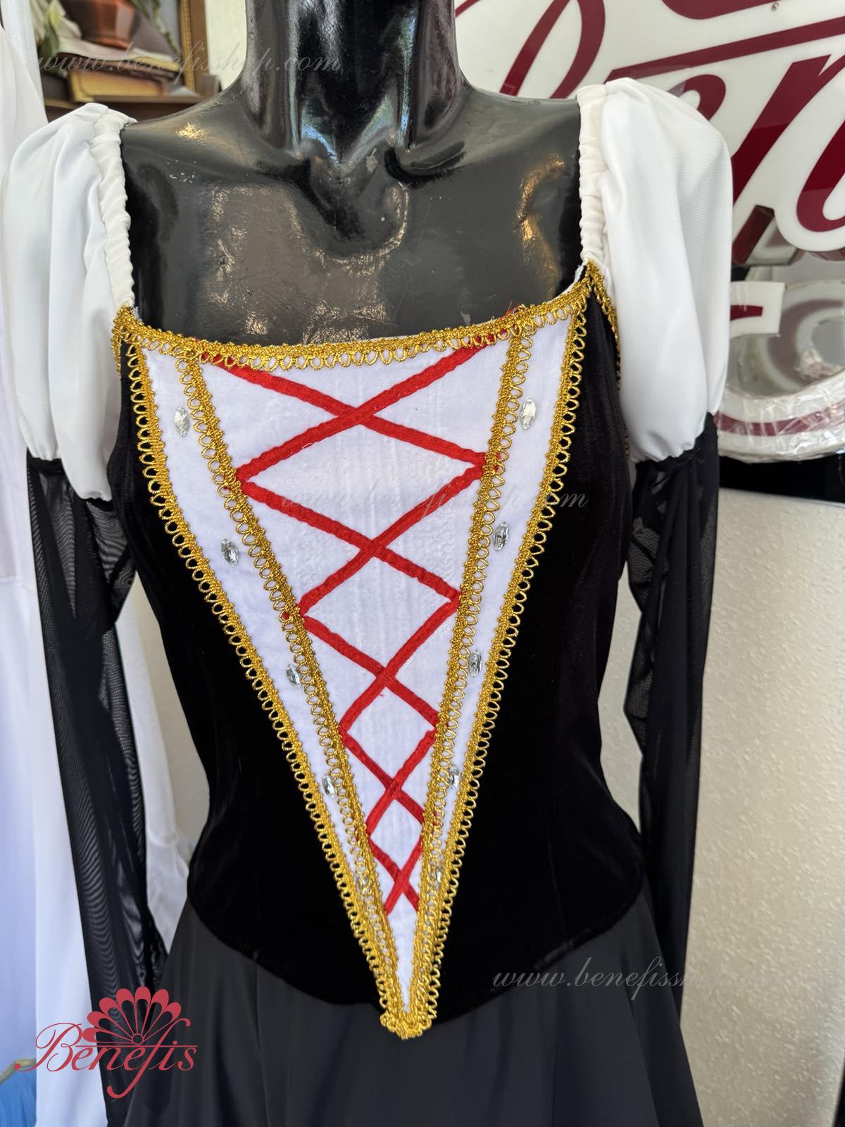 Details: costume. The bodice is made of velvet with an ear, a cape and sleeves. 2 Skirts are made of ankle-length chiffon. Decor: gold braid, rhinestones. All these delicate décor elements are selected in accordance with the costume’s tint and impart a magnificent look to the costume. For a better safety of this costume and transportation facility, You can purchase a tutu bag. See \"Accessories\" section, code S0001.