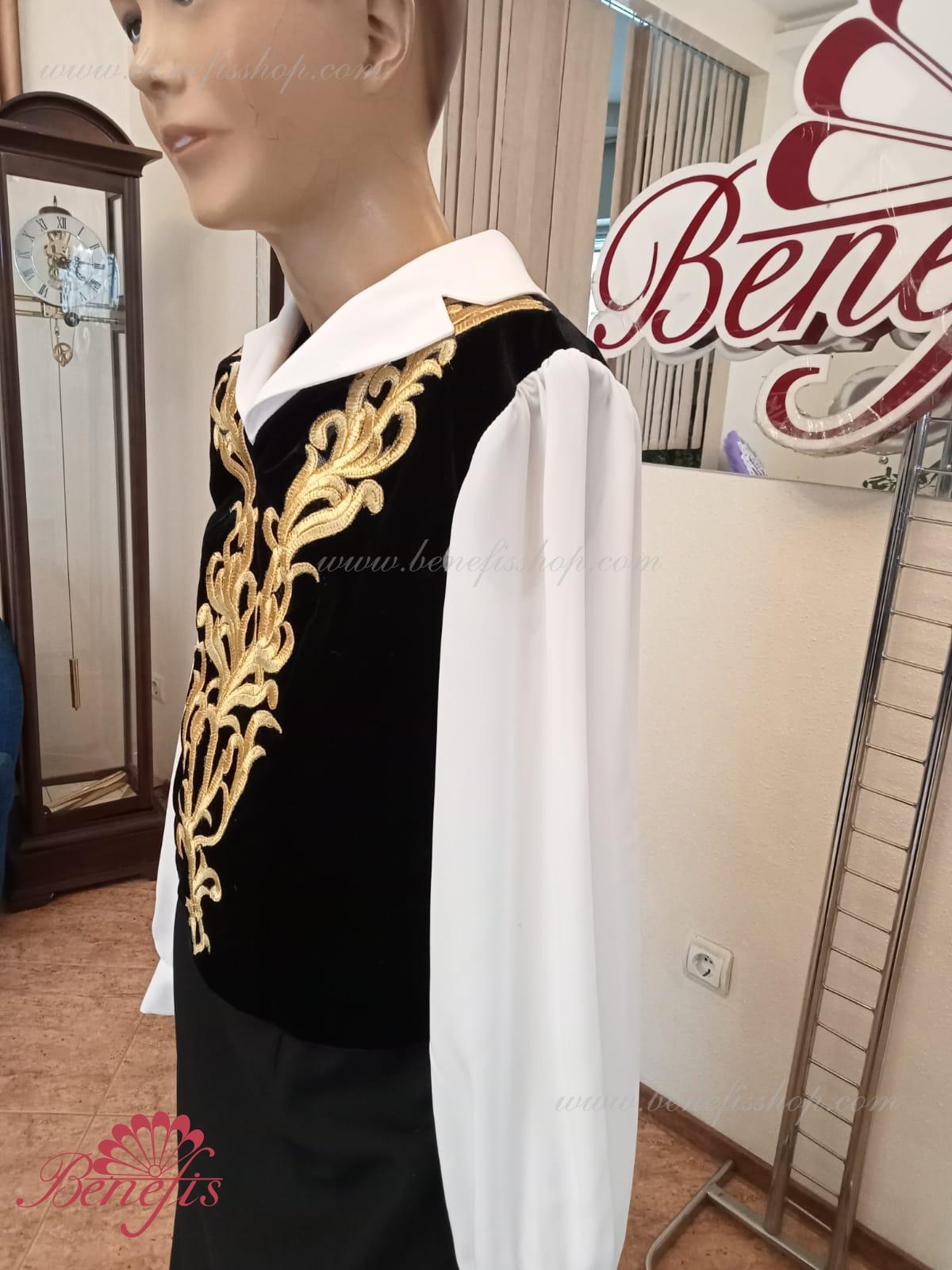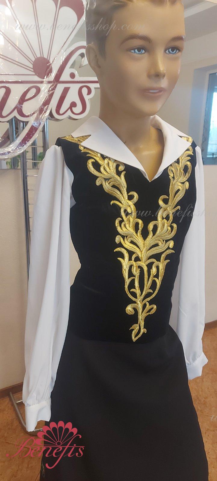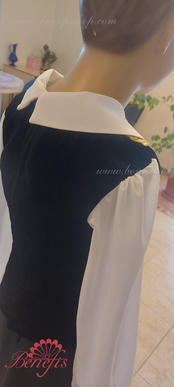 Details:It stings.The collar is made of black elastic velvet.The sleeves and collar are made of chiffon. Golden decor.The collar is fastened with two rows of hooks. Gold applications are used as jewelry.