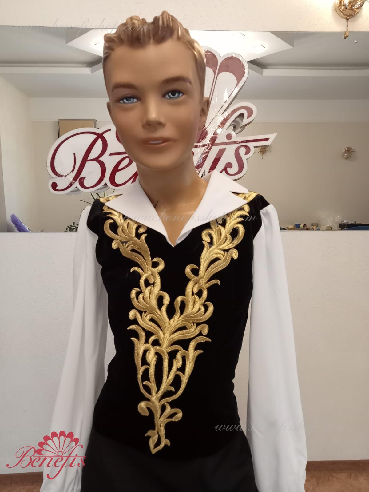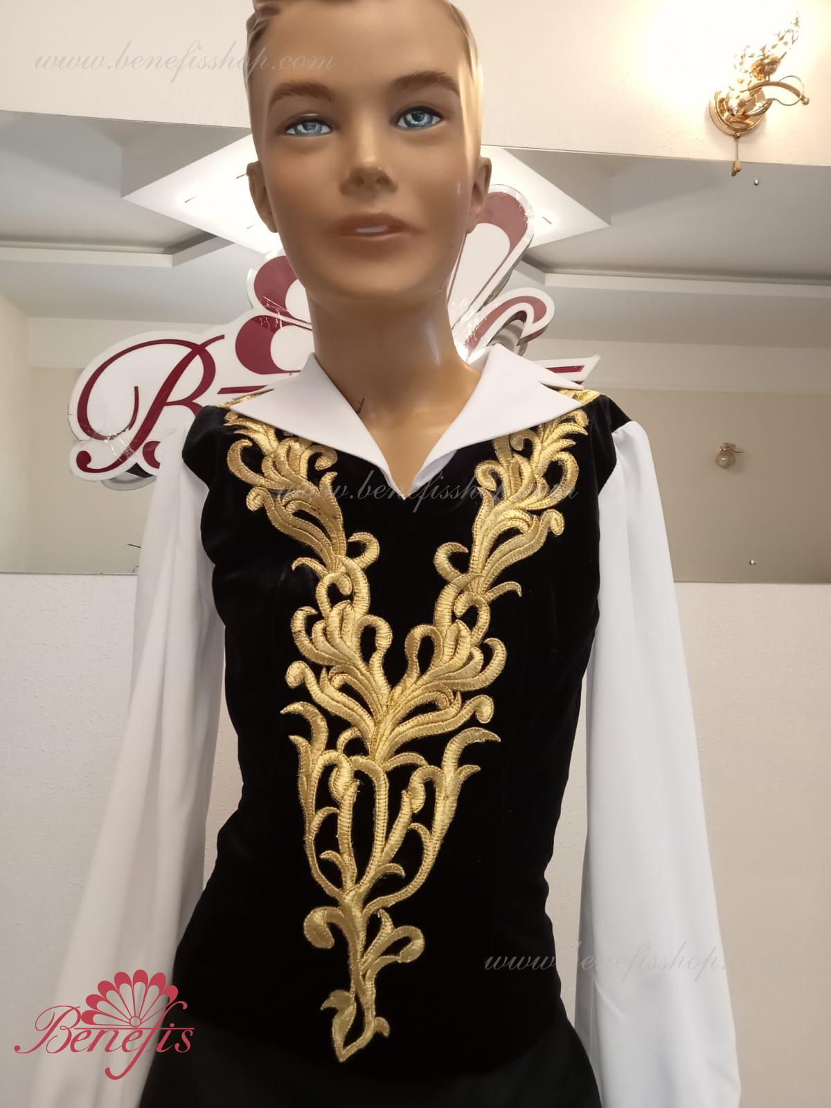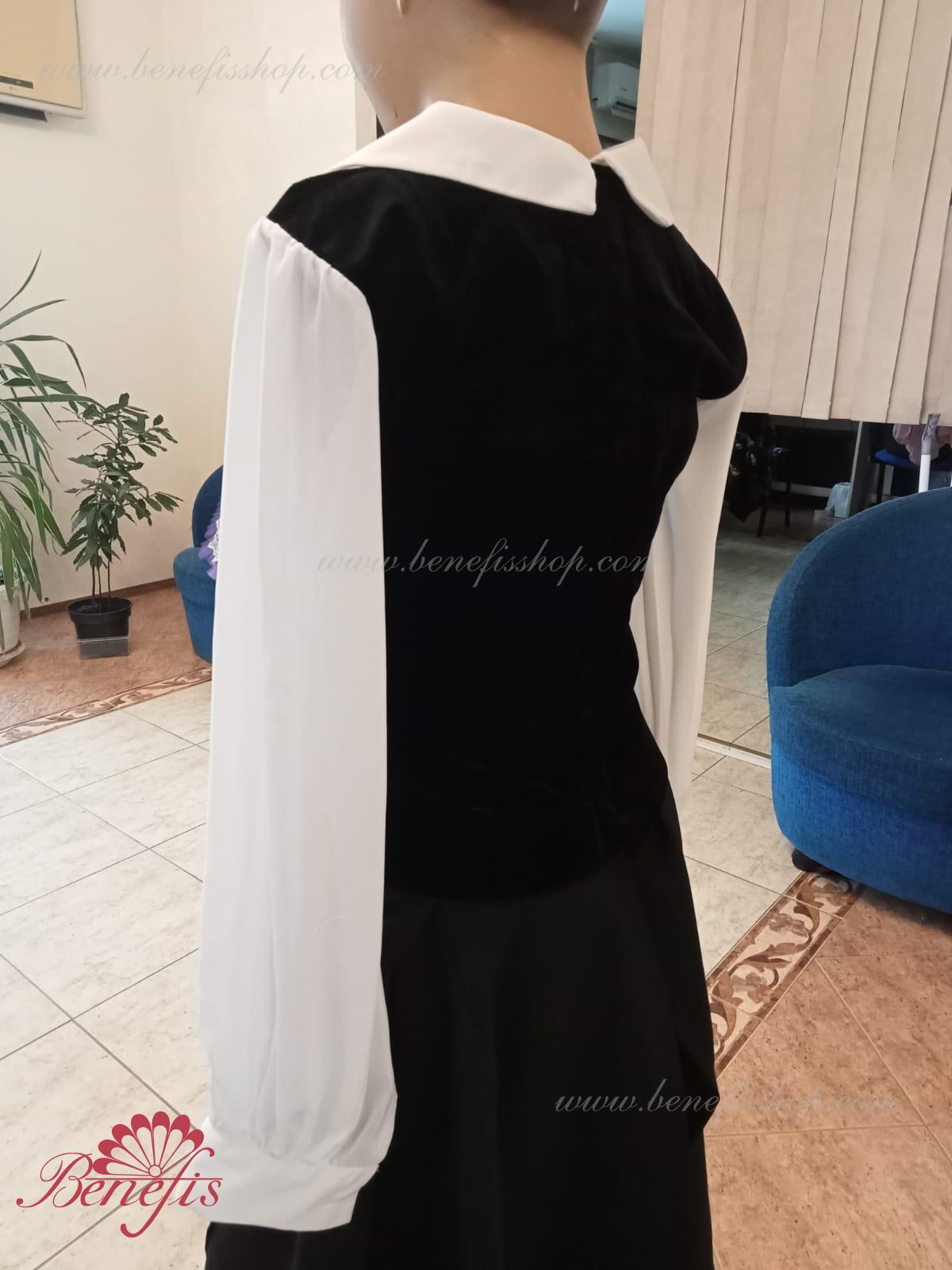Details:It stings.The collar is made of black elastic velvet.The sleeves and collar are made of chiffon. Golden decor.The collar is fastened with two rows of hooks. Gold applications are used as jewelry.