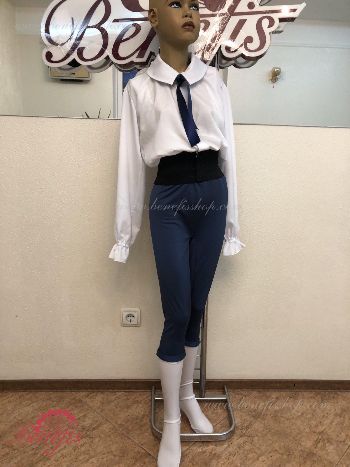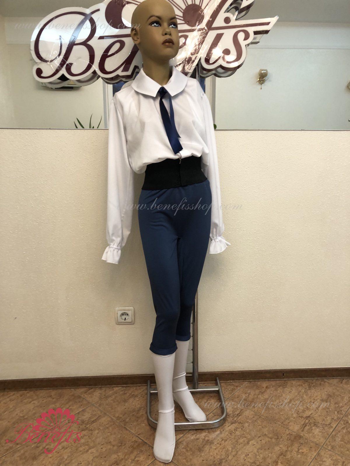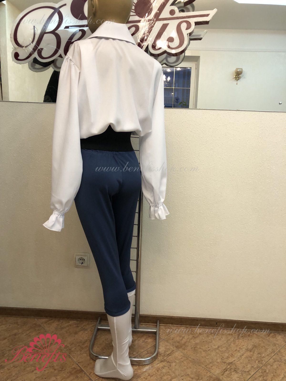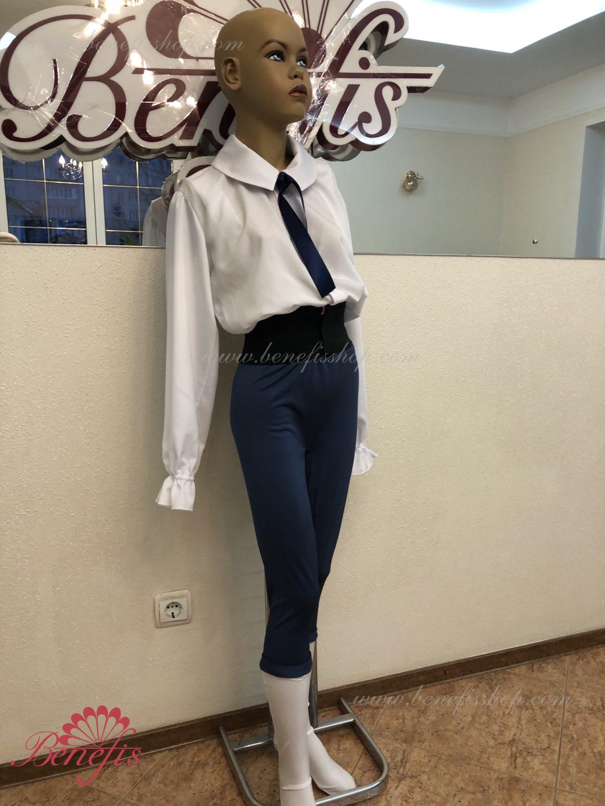 The costume consists of a shirt and leggings. The shirt is made of chiffon with a wide black belt. The leggings are made of biflex. The leggings are sewn in the form of breeches and knee socks (white).White button-down shirt, belt with hooks.