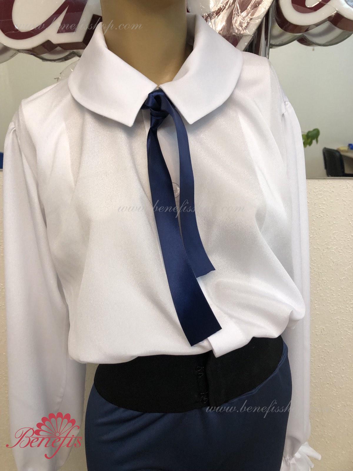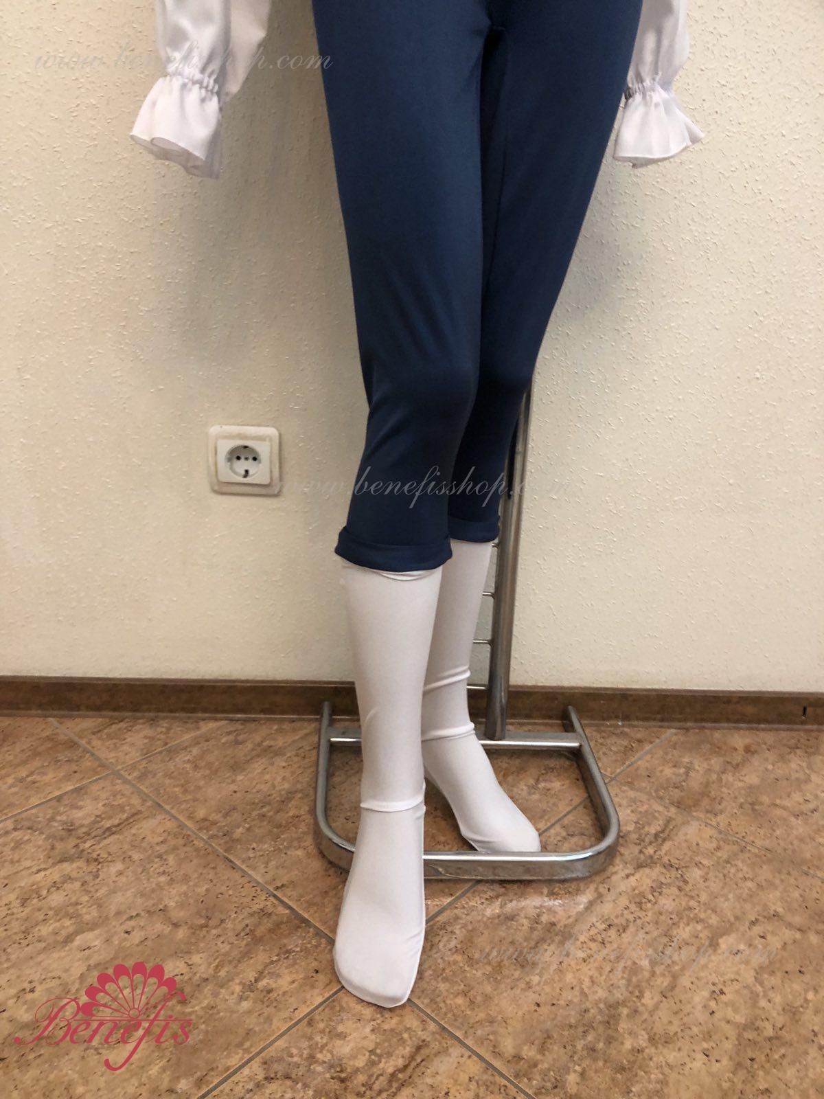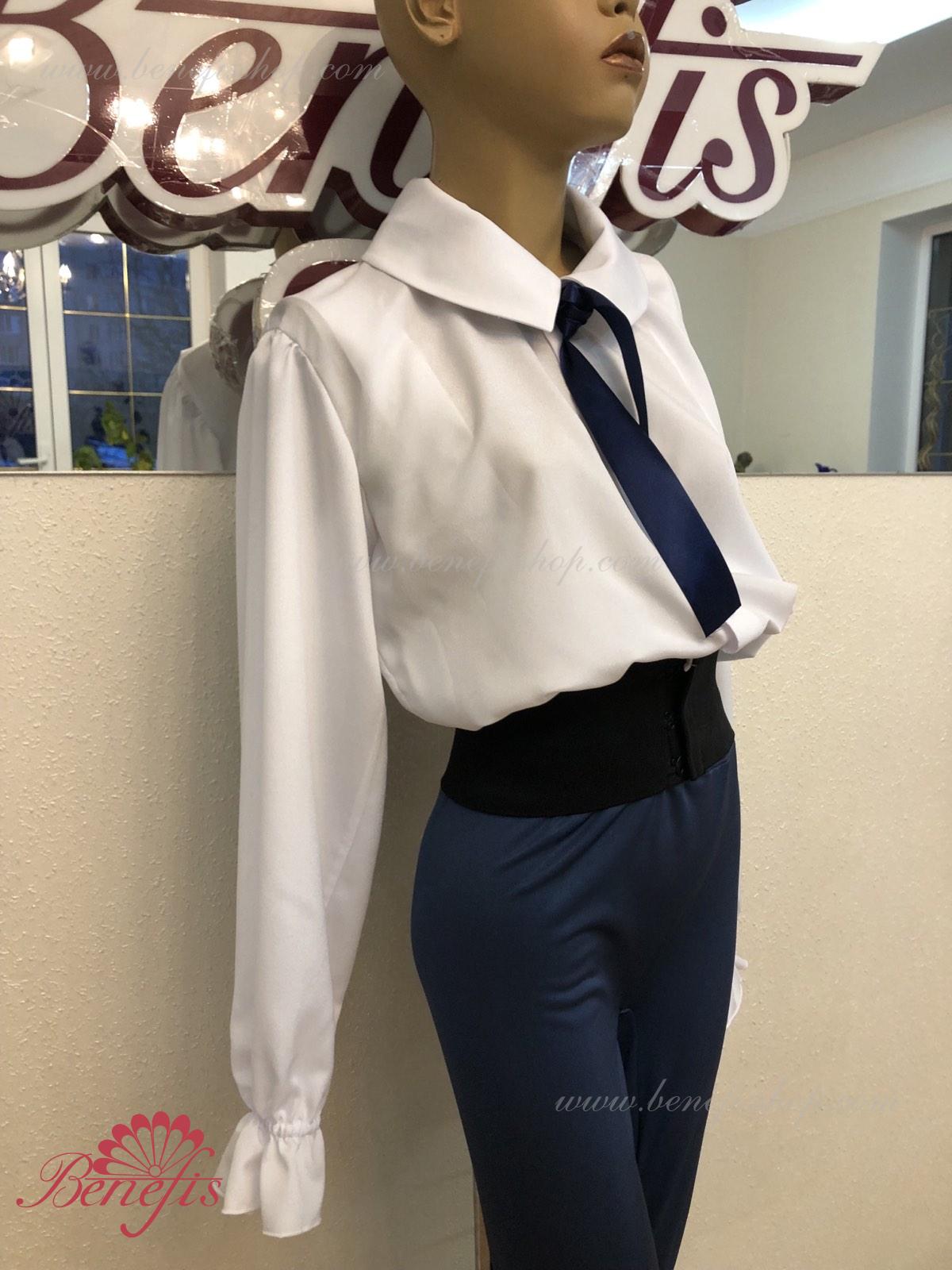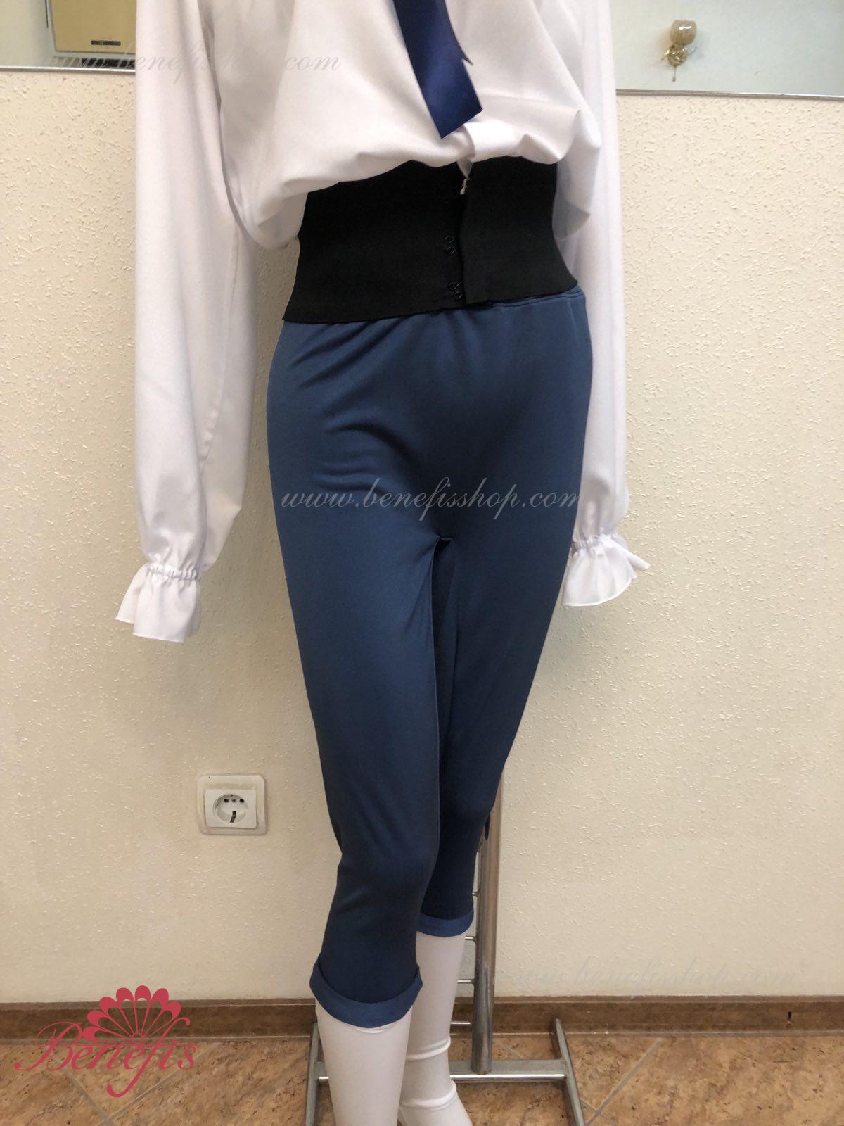 The costume consists of a shirt and leggings. The shirt is made of chiffon with a wide black belt. The leggings are made of biflex. The leggings are sewn in the form of breeches and knee socks (white).White button-down shirt, belt with hooks.
