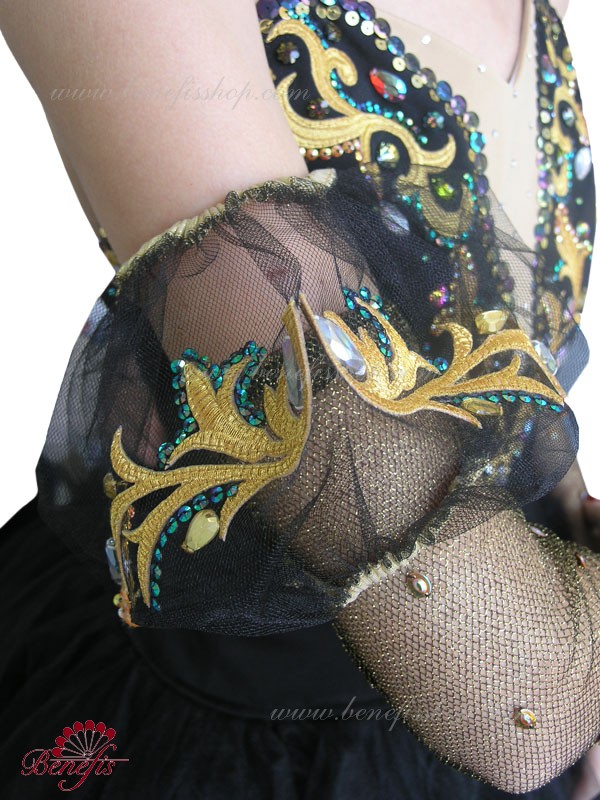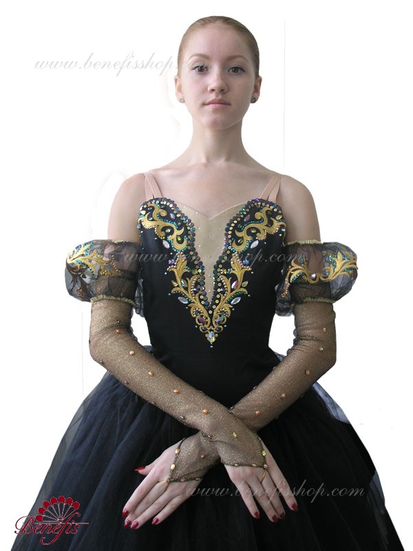 The sleeves are made in the shape of guipure sleeve - puffs combined with closely fitting gloves of the thin semi-stretch mesh fabric with sparkling accents. There are elastic loops on the gloves for fingers.