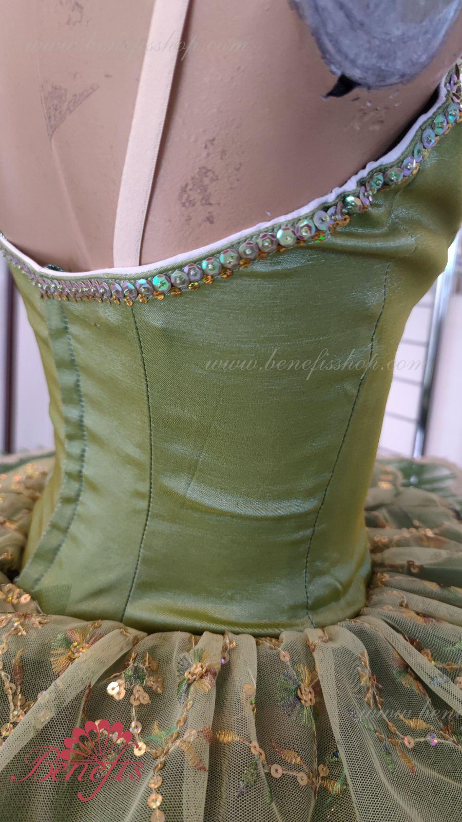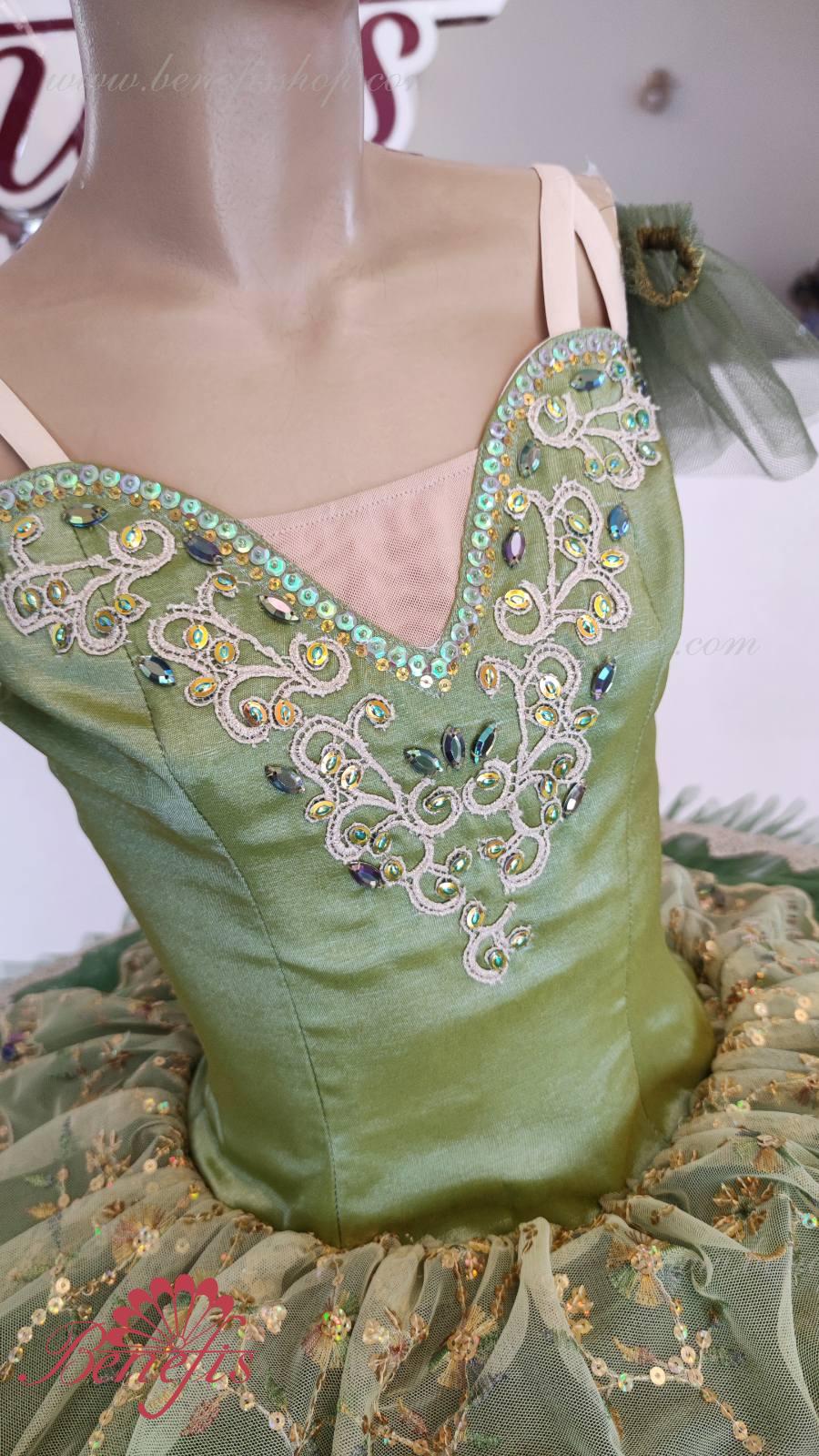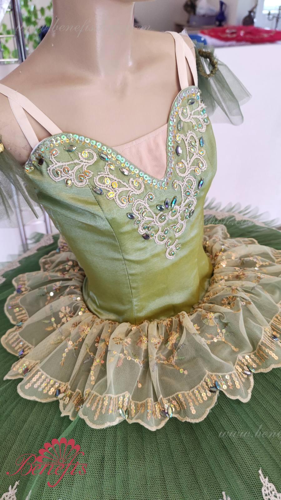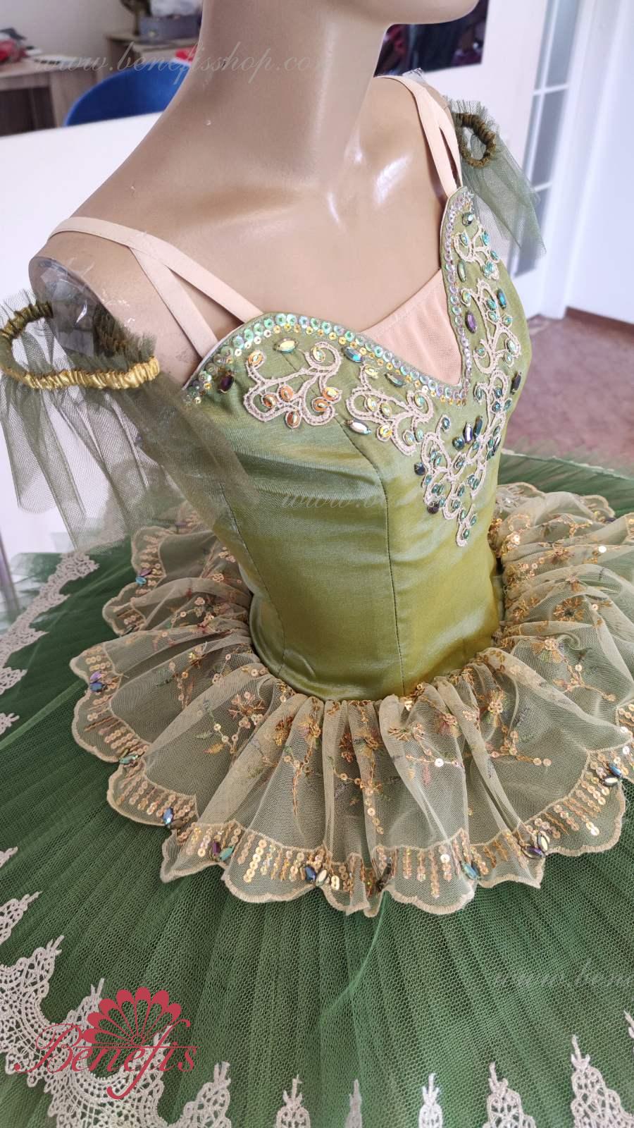 The costume is decorated with lace, guipure, rhinestones, and sequins.