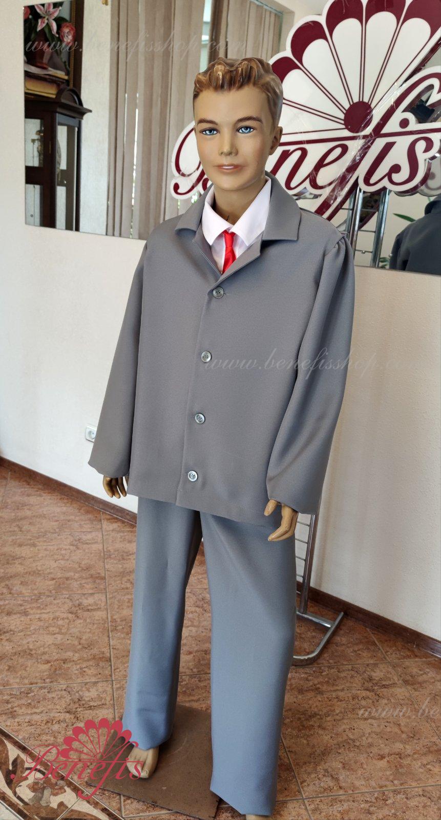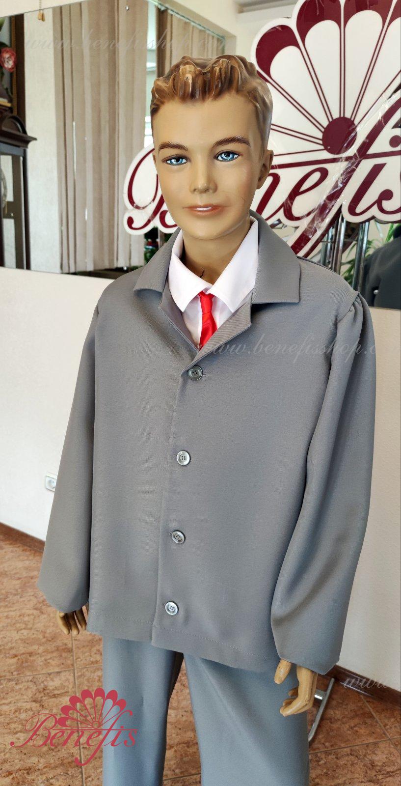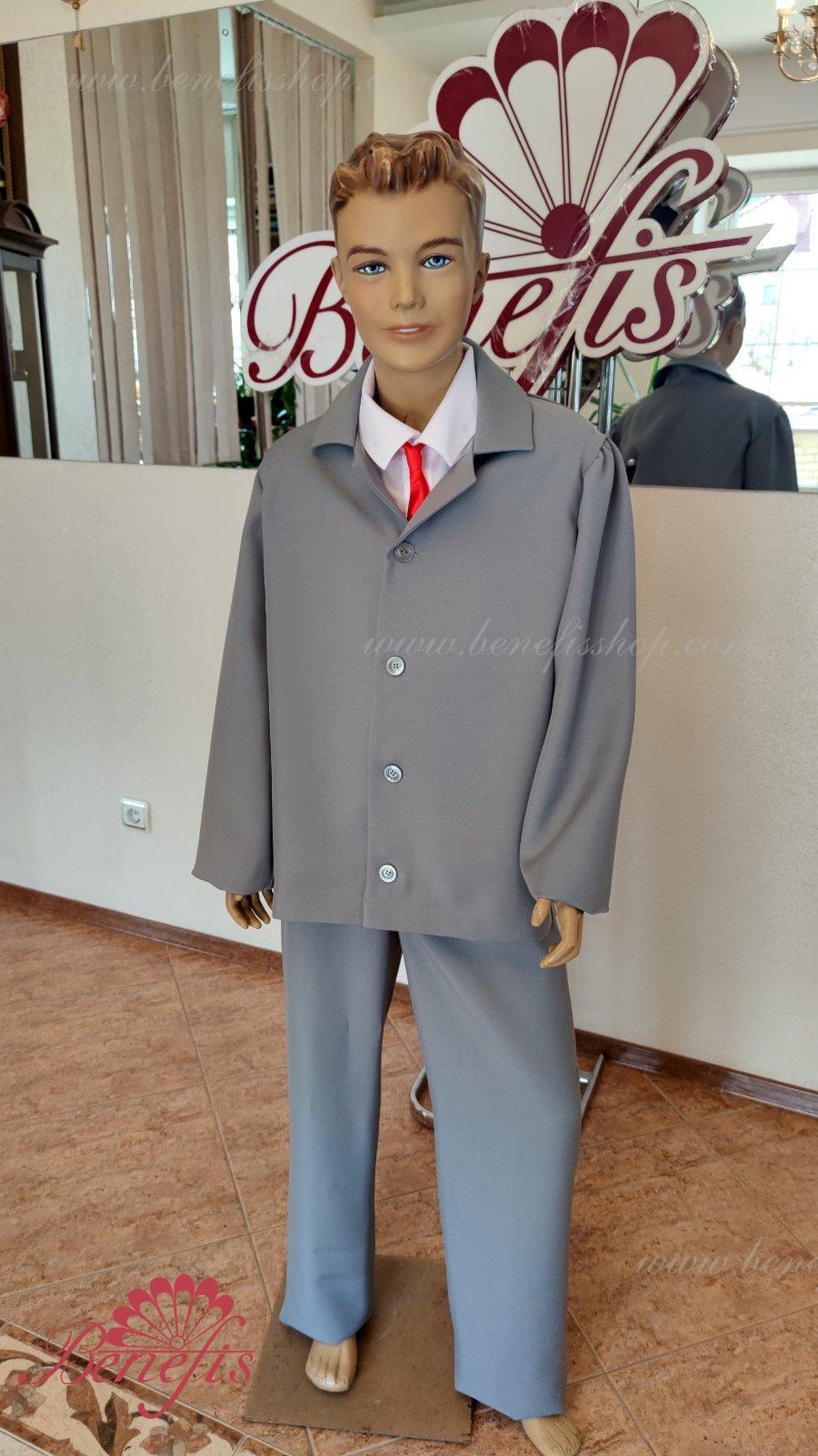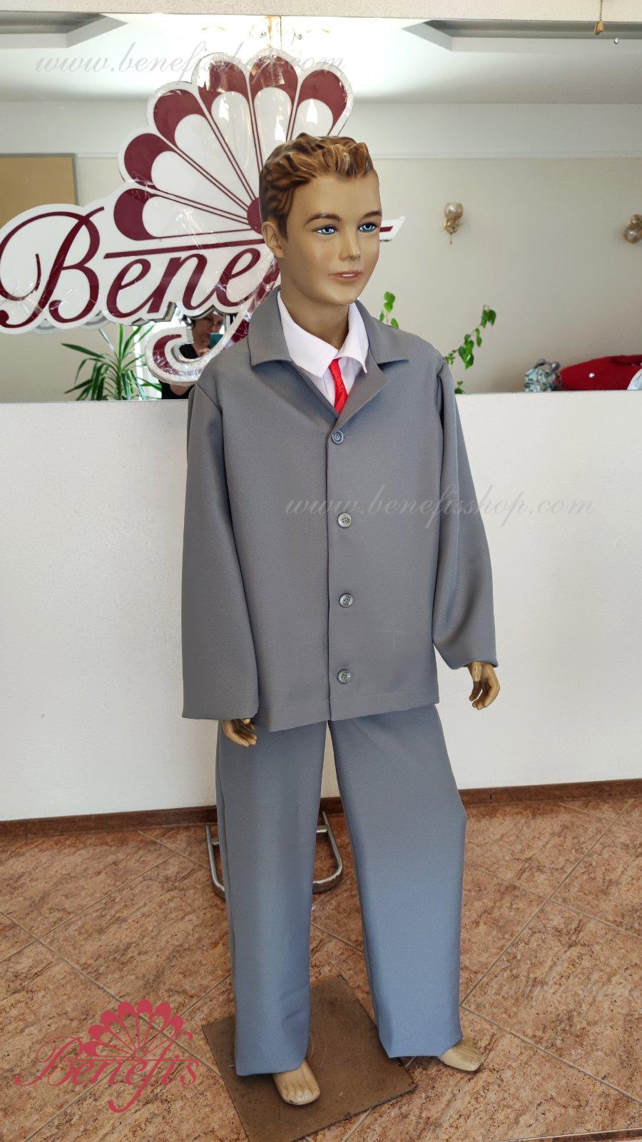 Details: grey jacket and trousers, white shirt front, red tie.The blouse is made of Madonna fabric, the trousers are made of thick elastic fabric.