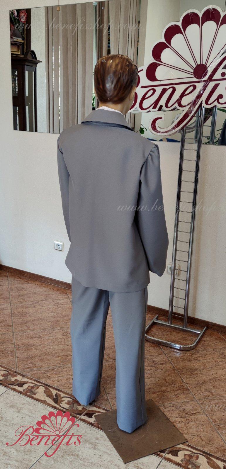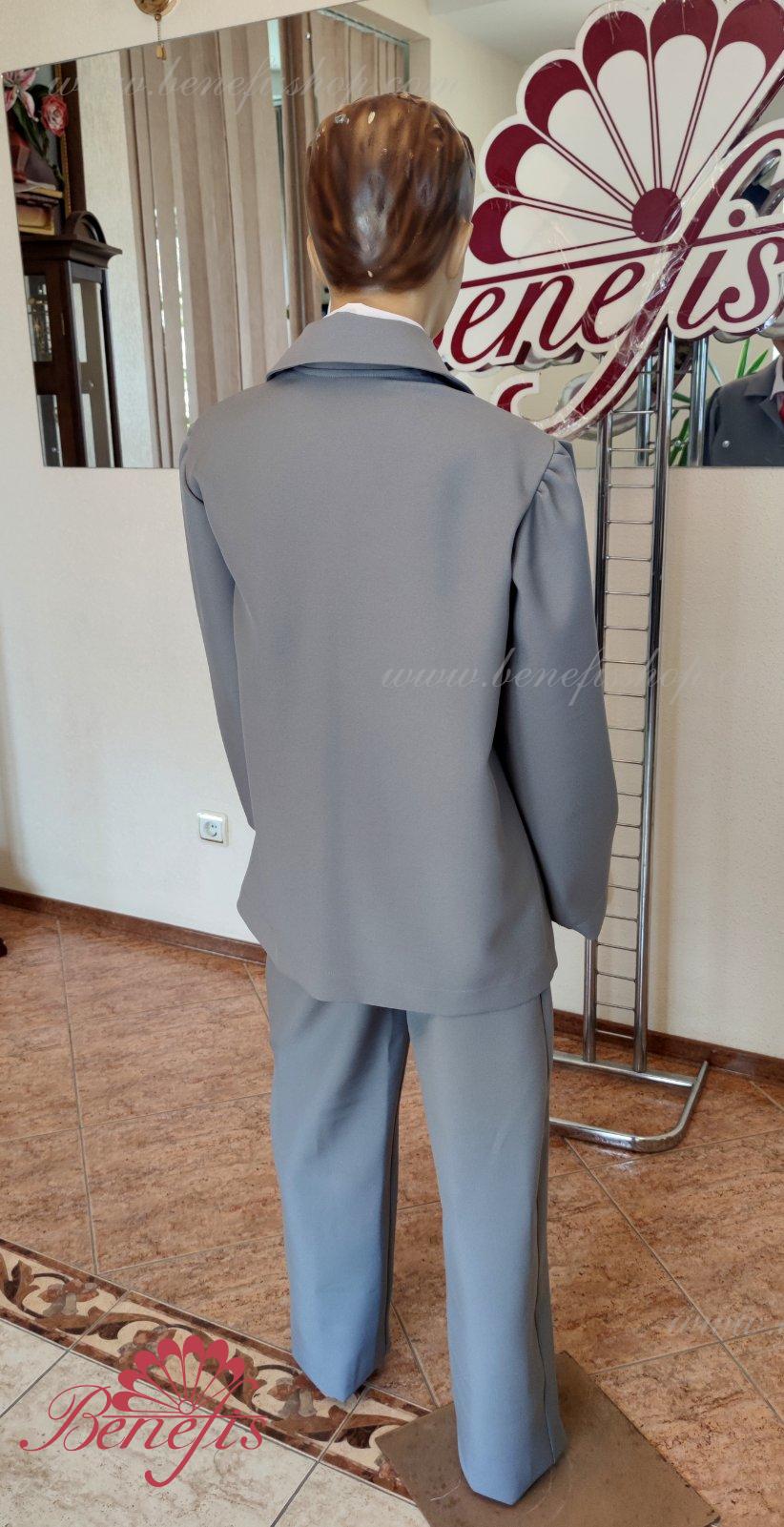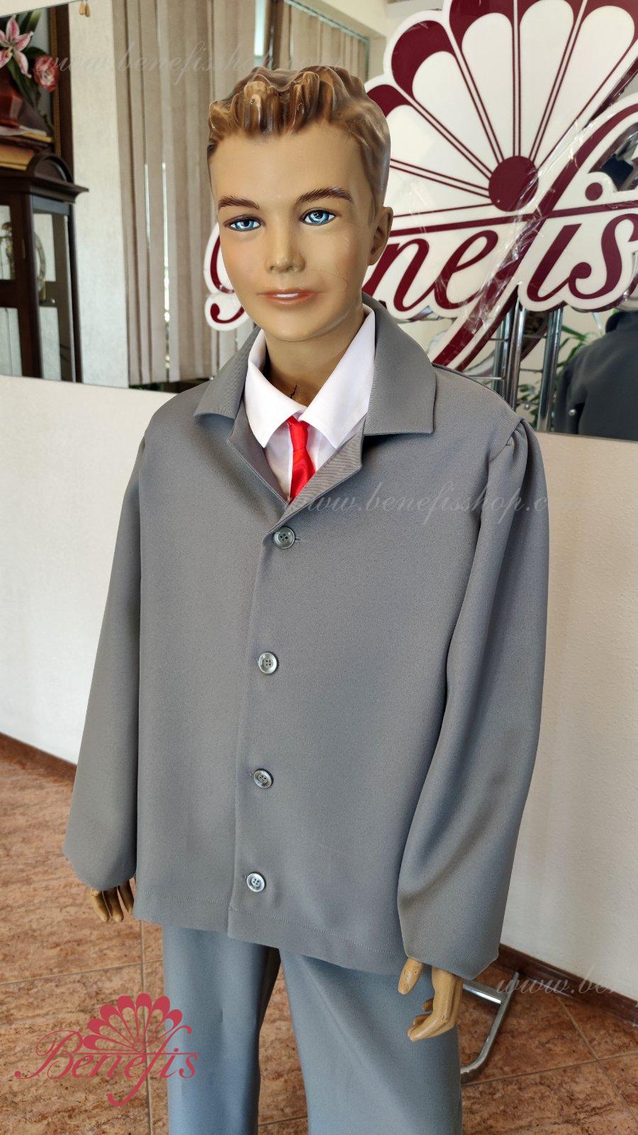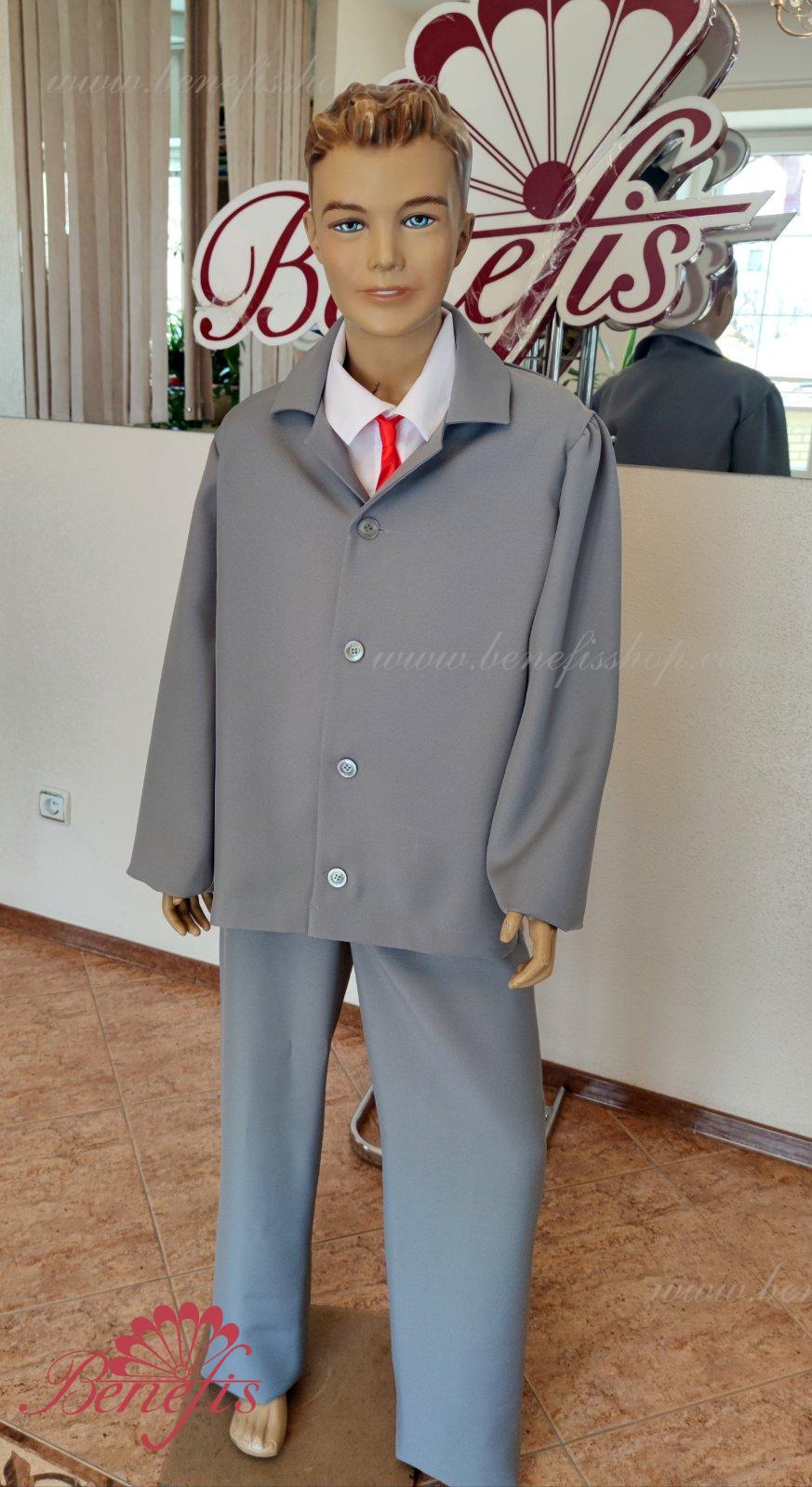 Details: grey jacket and trousers, white shirt front, red tie.The blouse is made of Madonna fabric, the trousers are made of thick elastic fabric.