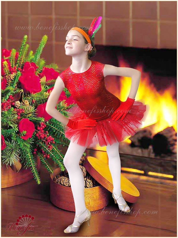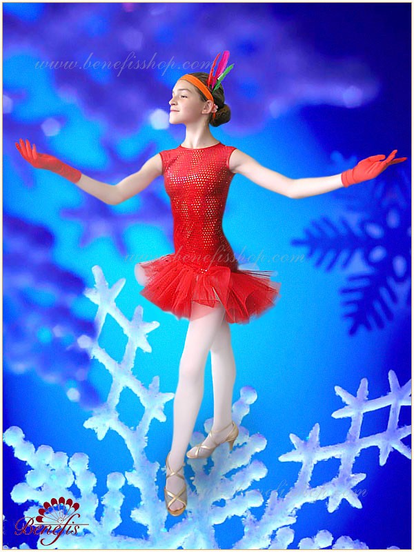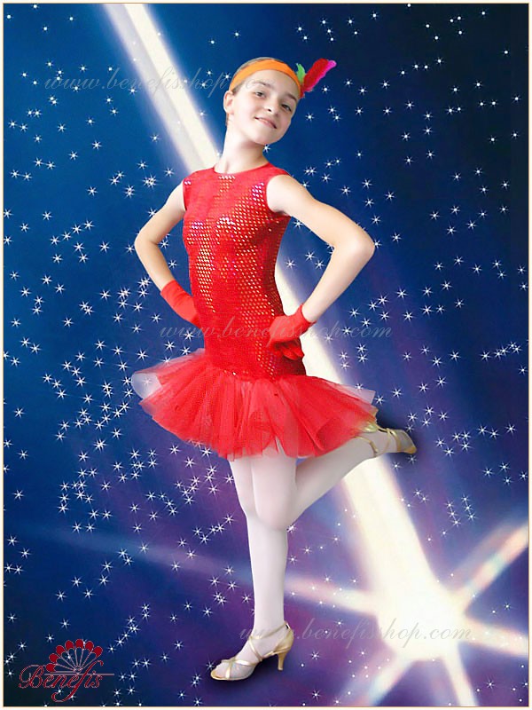 The dress is of stretch supplex, decorated with sparkles. The bottom of the dress is trimmed with a large flounce of tulle. The dress is fastened on the back with a button. The headpiece is on elastic band, and decorated with natural feather.