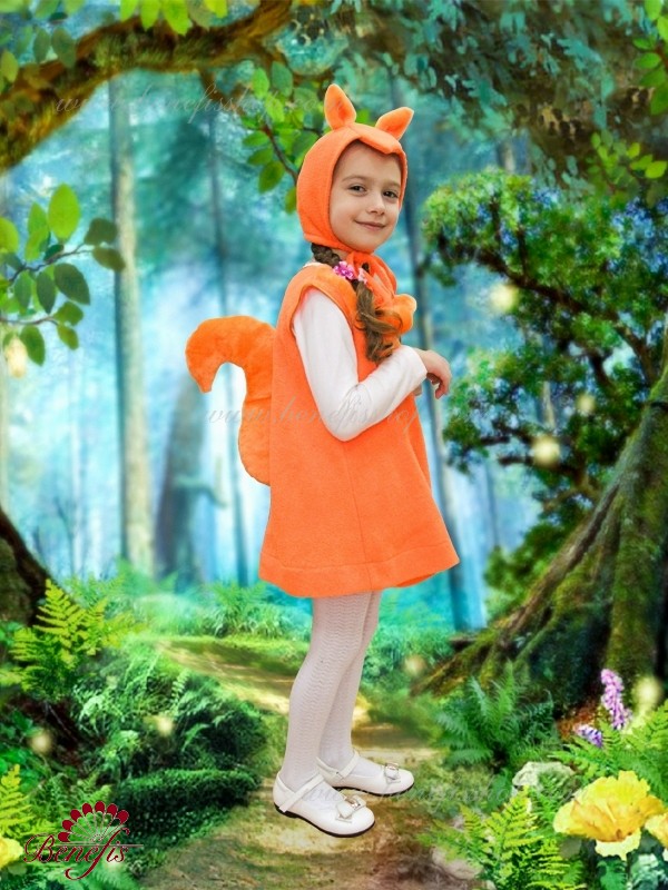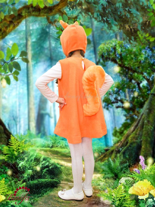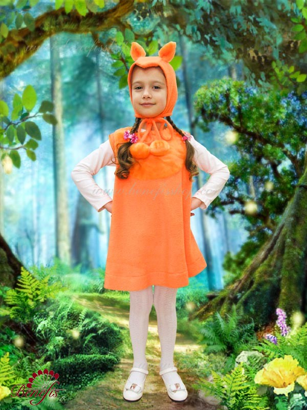 The costume is made of fleece. Fur inset on the chest is used as decor, tail is attached to the back of the dress. The dress fastens with buttons.