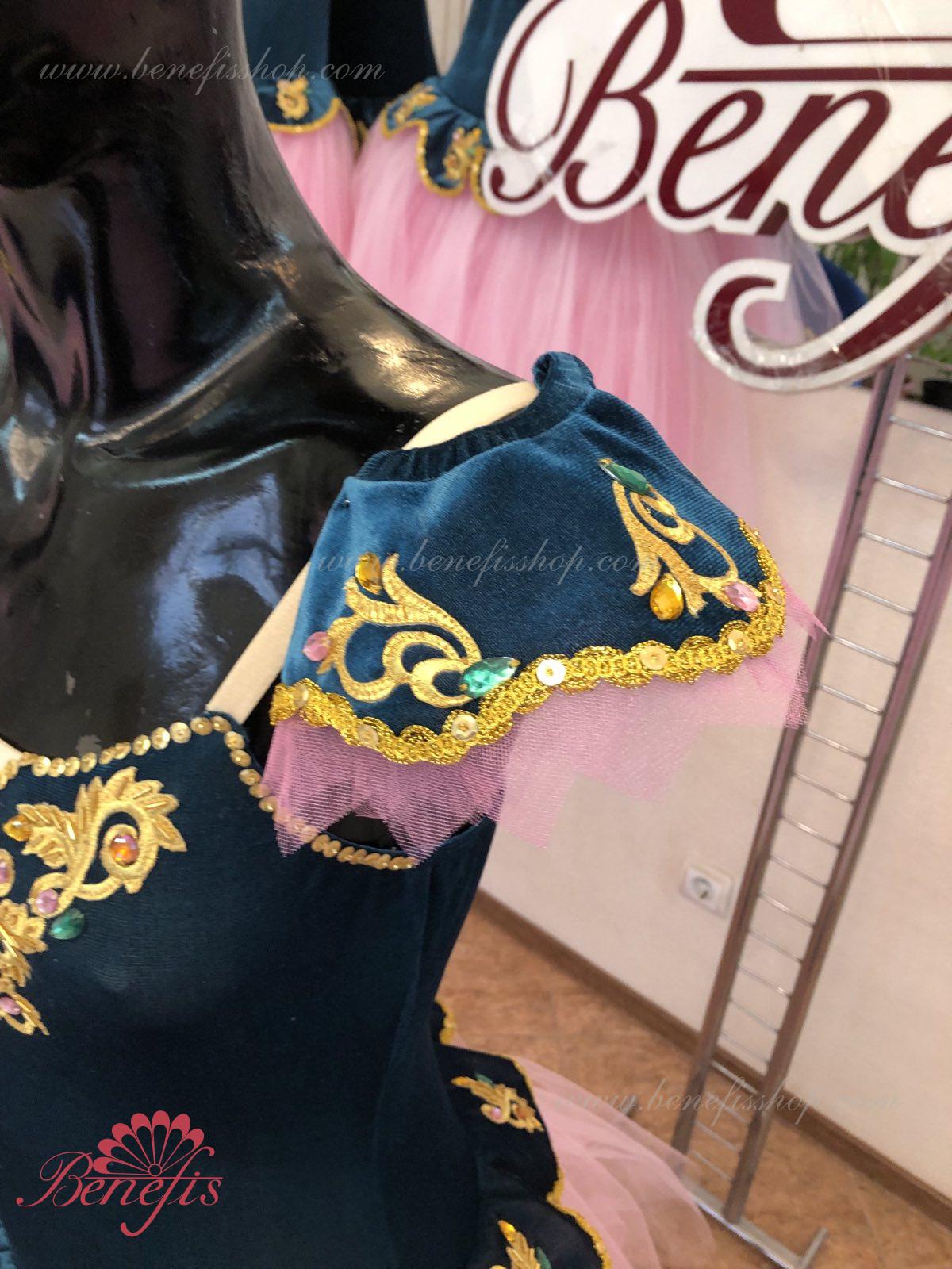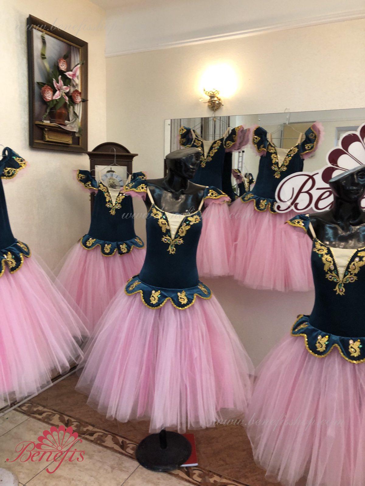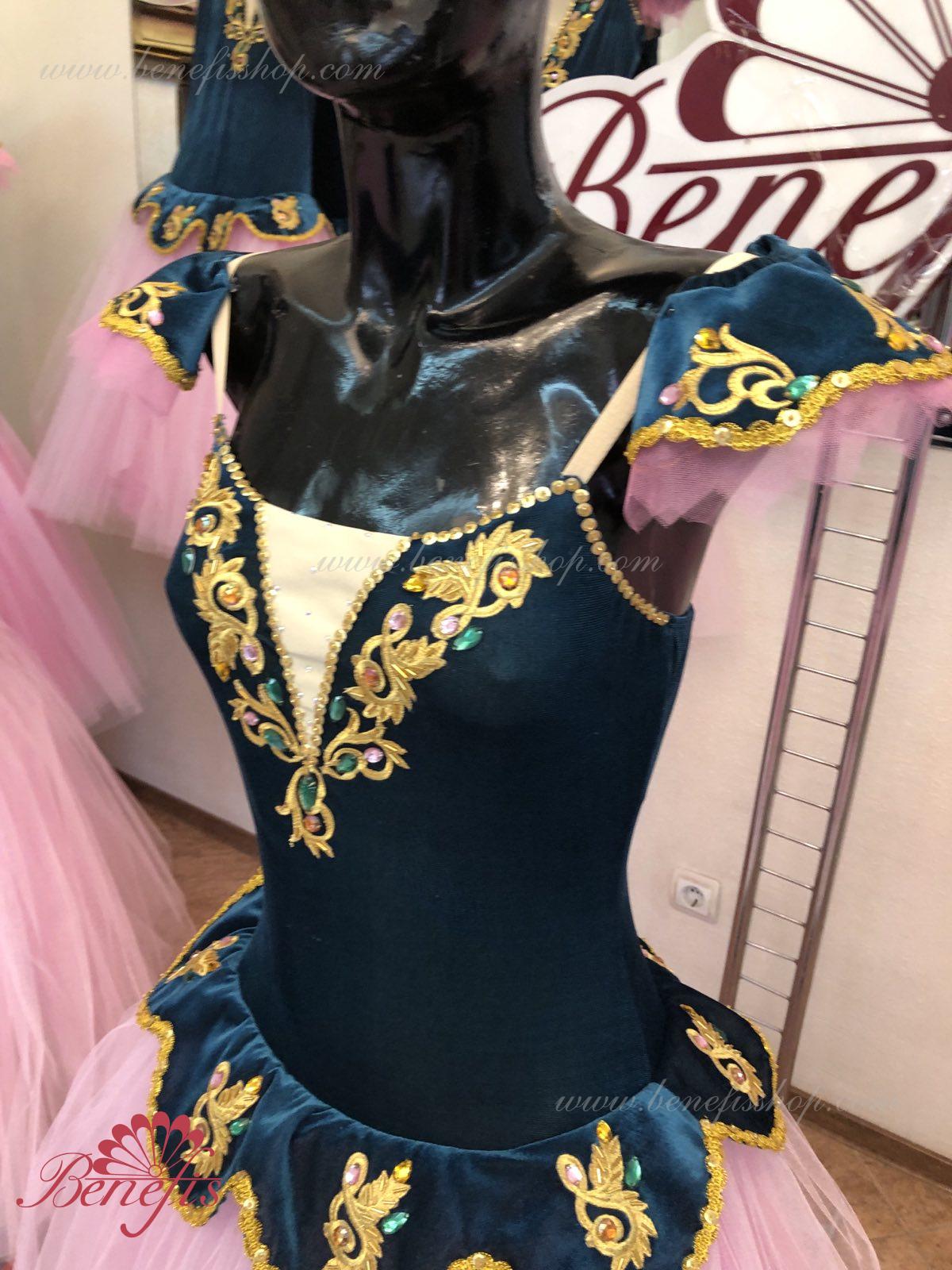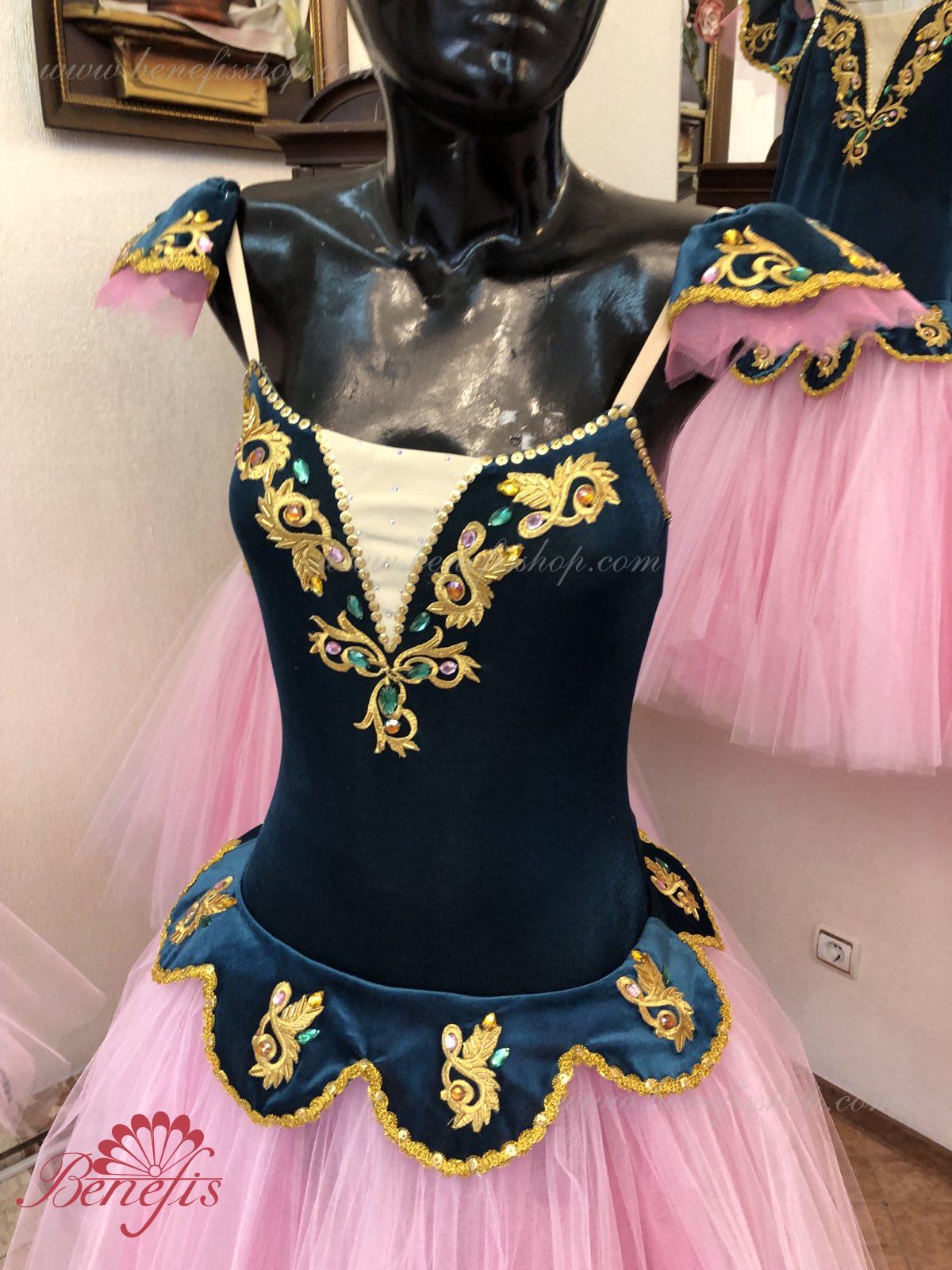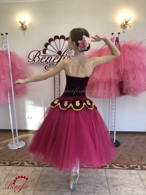 It is a professional stage costume, which is made on the basis of the professional basic romantic tutu #T0008 (see section “Basic tutus”) and is made of tulle of 4-х layers. The bodice is made of the elastic velvet leotard on elastic flesh-colored straps and is decorated with exquisite applications.