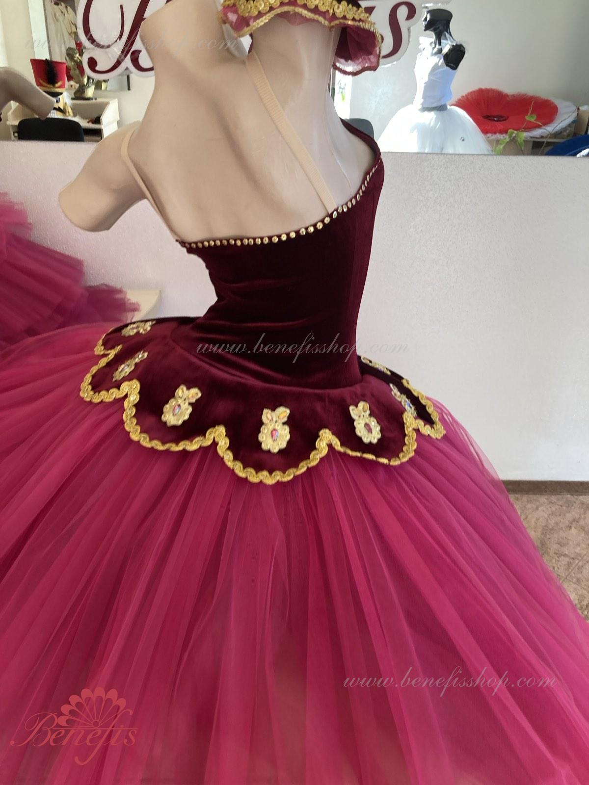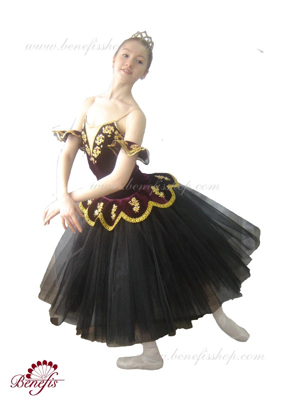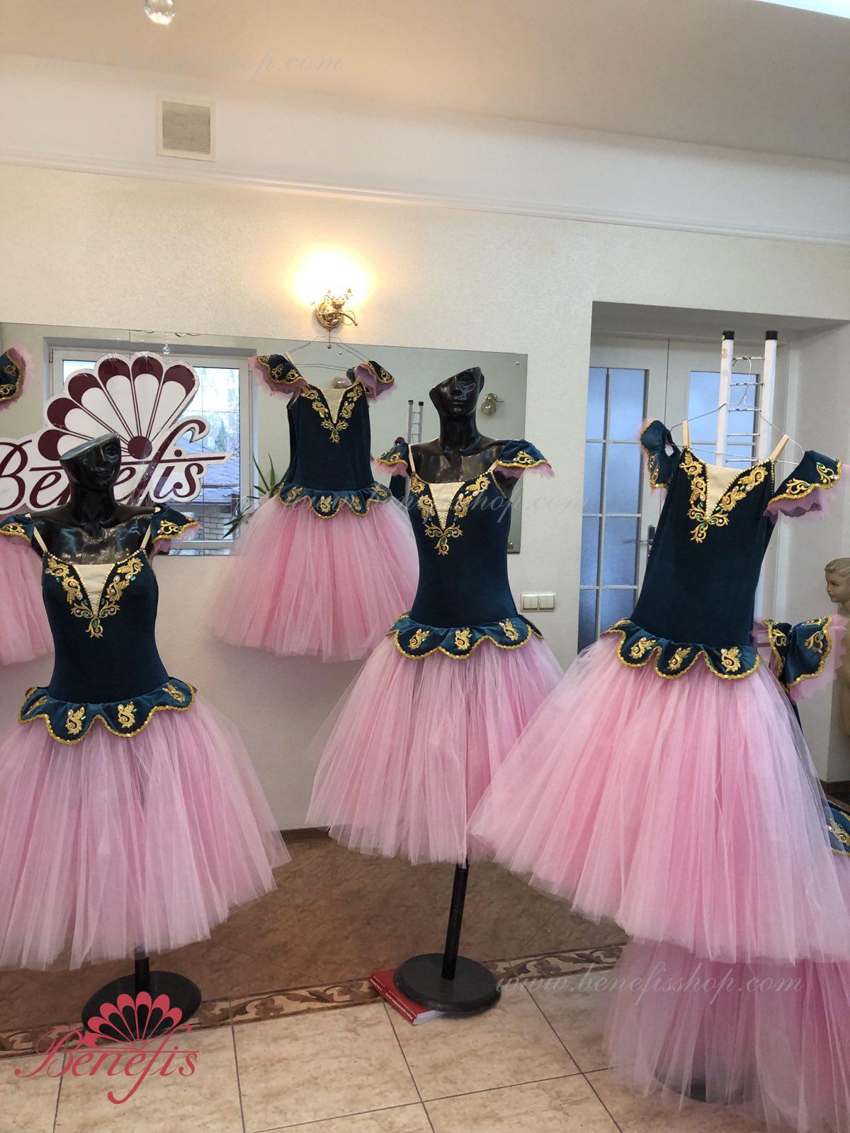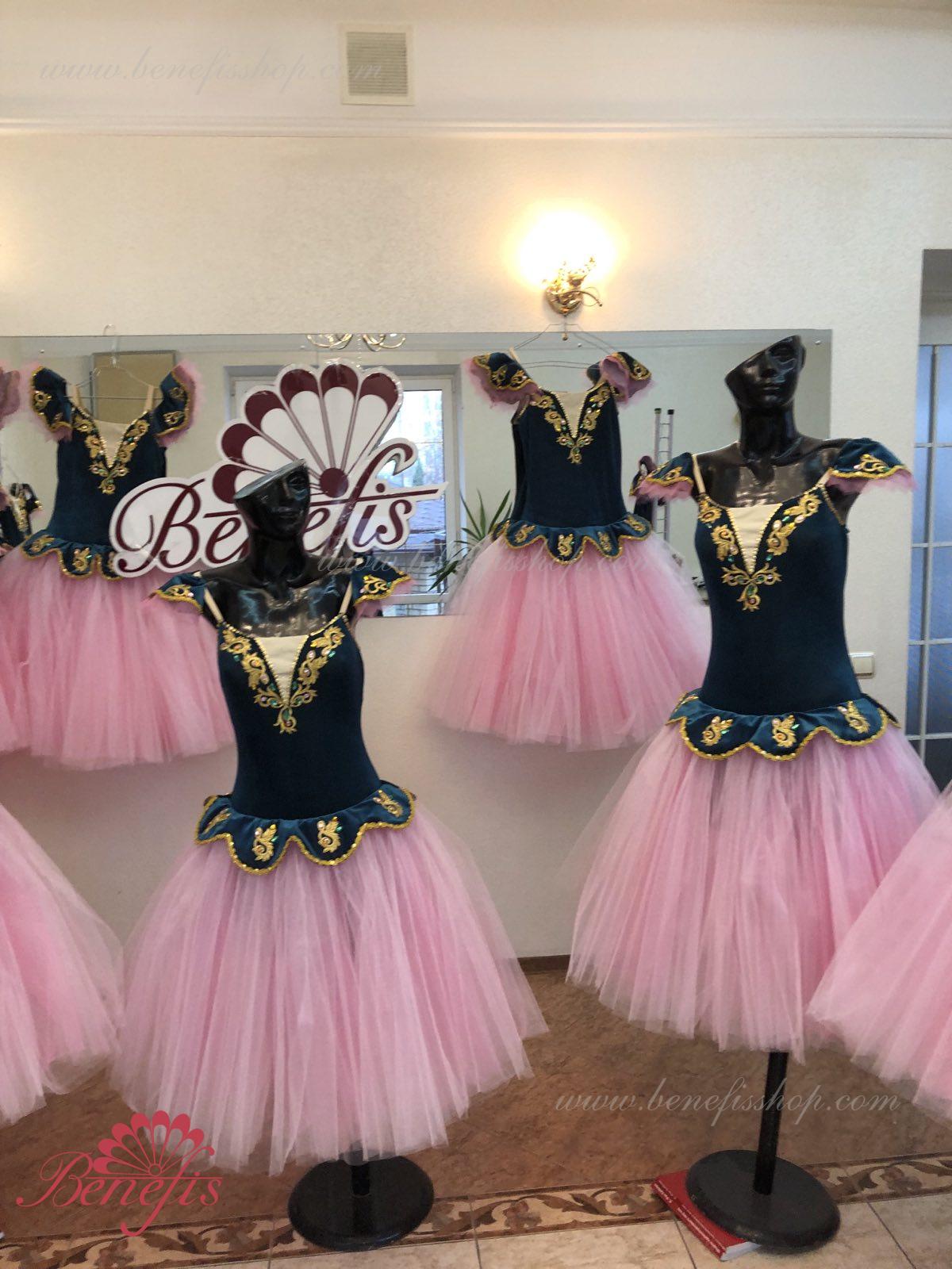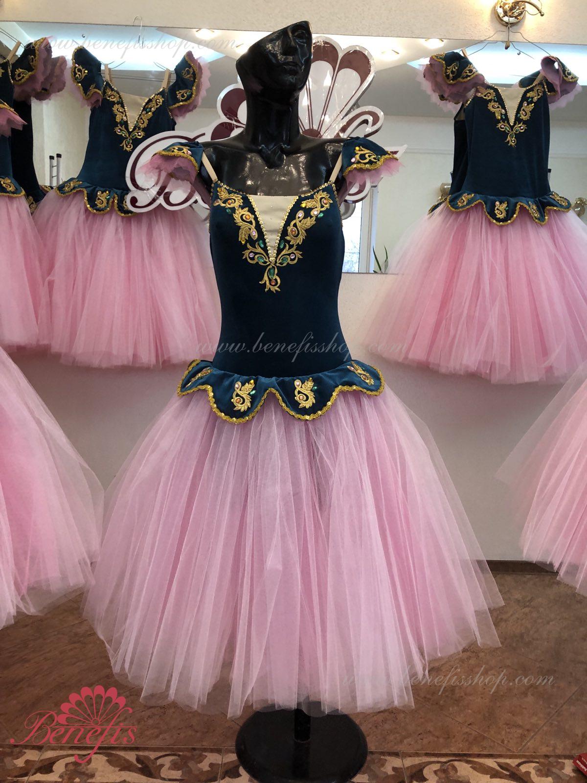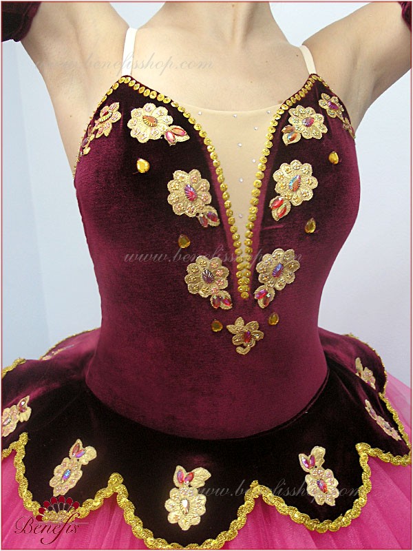 It is a professional stage costume, which is made on the basis of the professional basic romantic tutu #T0008 (see section “Basic tutus”) and is made of tulle of 4-х layers. The bodice is made of the elastic velvet leotard on elastic flesh-colored straps and is decorated with exquisite applications.