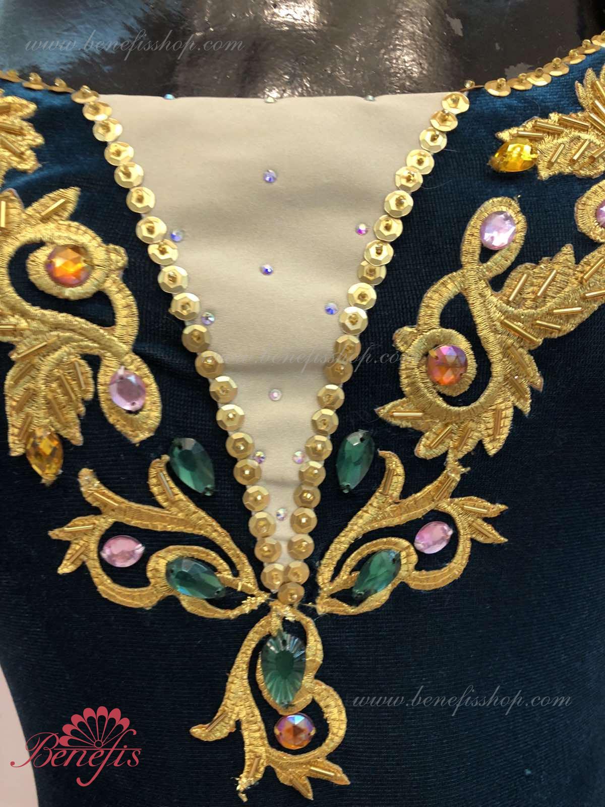 The applications of different colors, crystals, braid, sparkles, and pearls impart an original look to the costume.