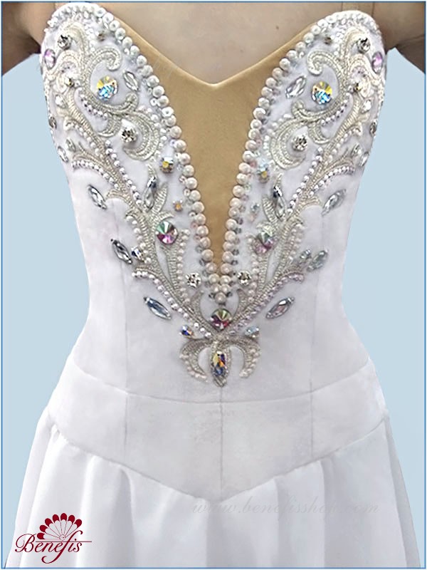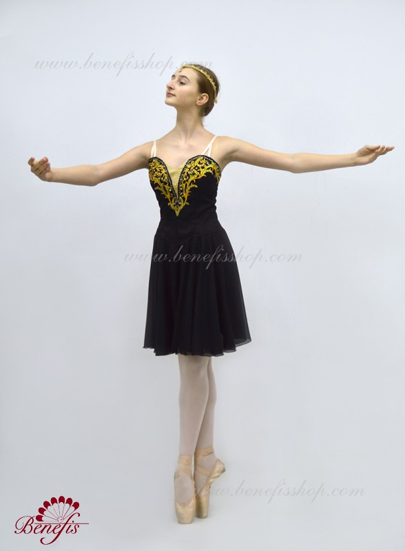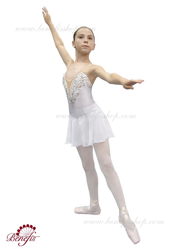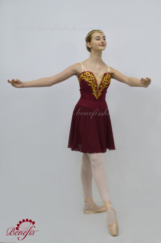 The costume consists of a bodice made of dense semi-stretched fabric or stretch velvet with attached panties and a two-layered attached skirt made of chiffon, which begins on hips. There is a flesh-colored inset on the chest.