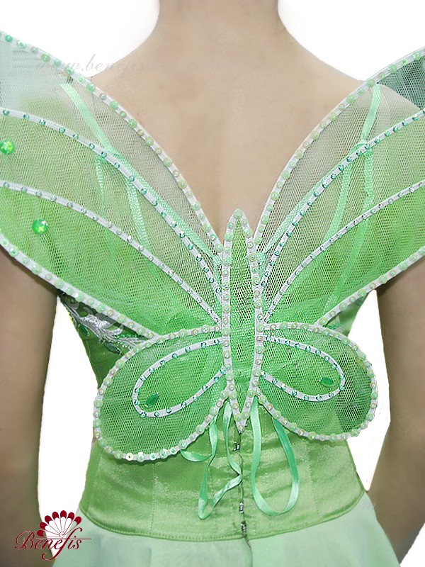 The whole décor is concentrated on the bodice. Big quantity of crystals, bugles, beads are used as the costume\'s décor. All the décor elements are carried out manually.