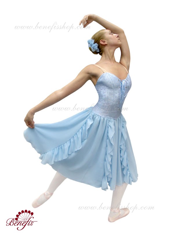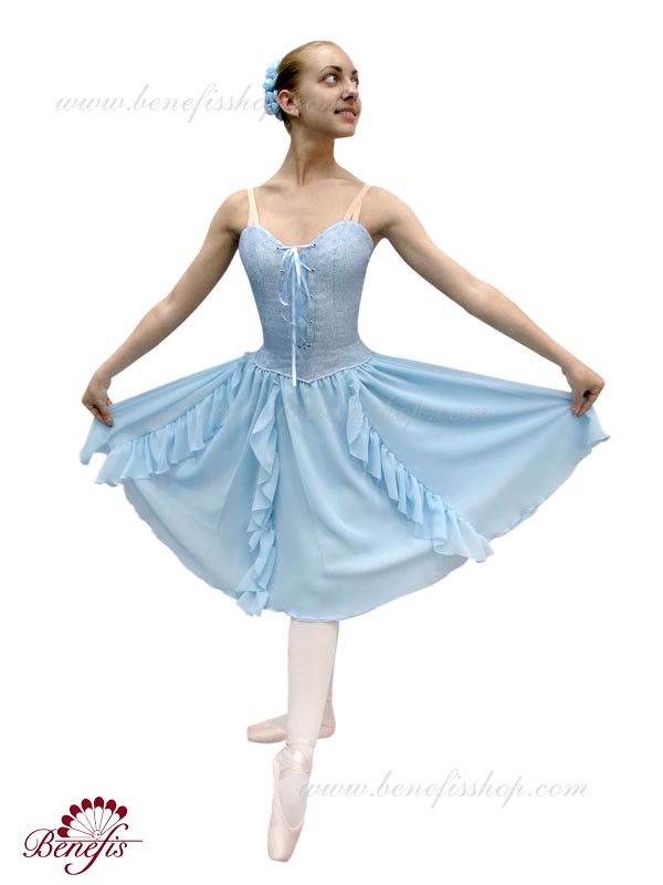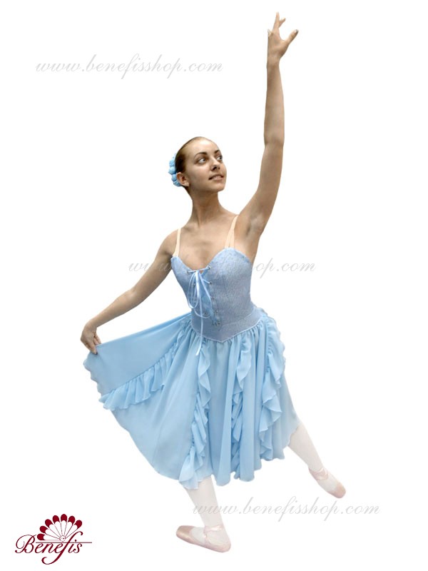 This is a professional ballet costume, which has a body conscience silhouette. It consists of a bodice, an elastic panty and a wide skirt with gussets.