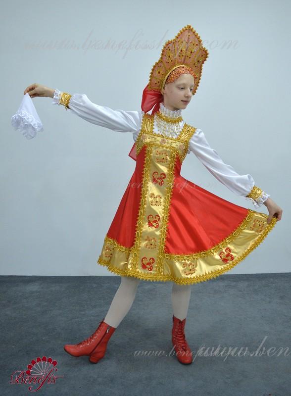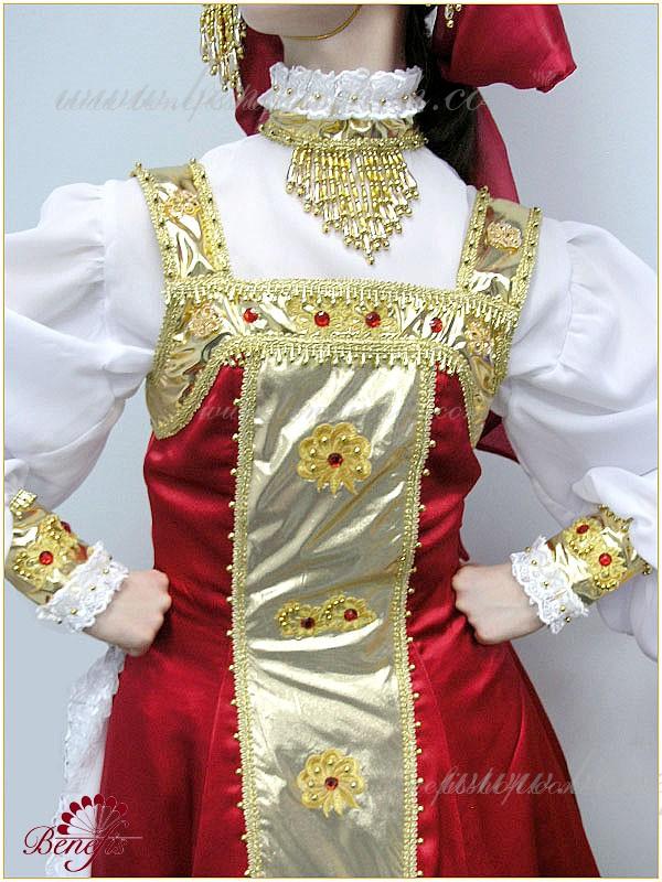 The large, slim-lined sarafan on large straps is made of satin. There is an insertion of gold brocade in the front, embroidered with beads, braid and applications. There is a similar insertion of gold brocade at the breast level.