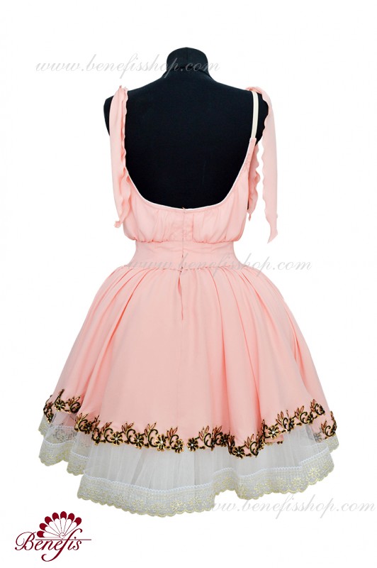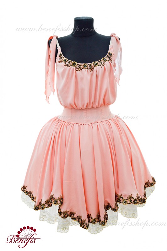 Professional stage costume made on the basis of the basic skirt T0003. The top layer of the skirt is made of semi-stretch fabric and trimmed with appliqués along the edge. The bodice is made of semi-stretch fabric with drapery. The bodice has two rows of hooks at the back. The costume is decorated with applications.