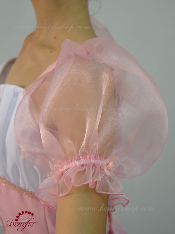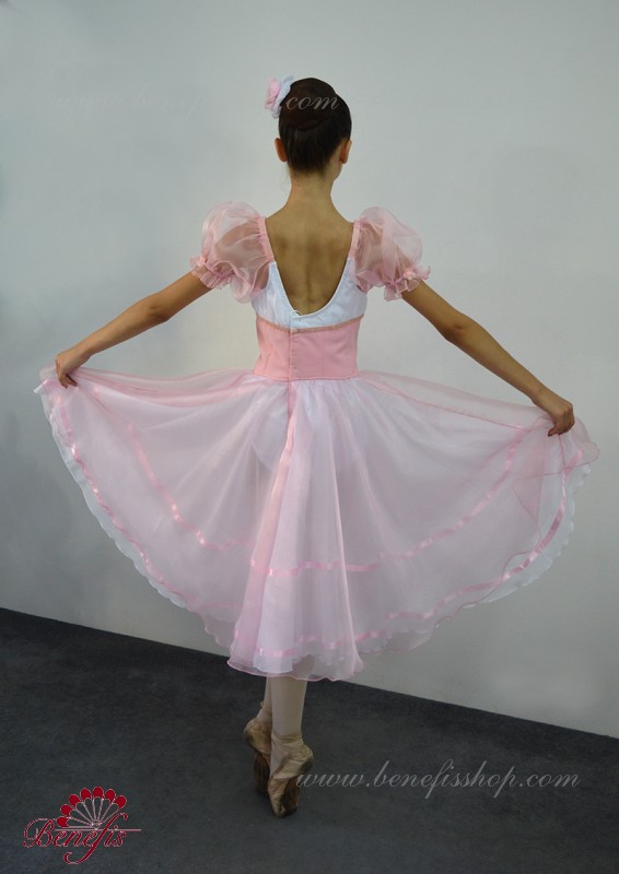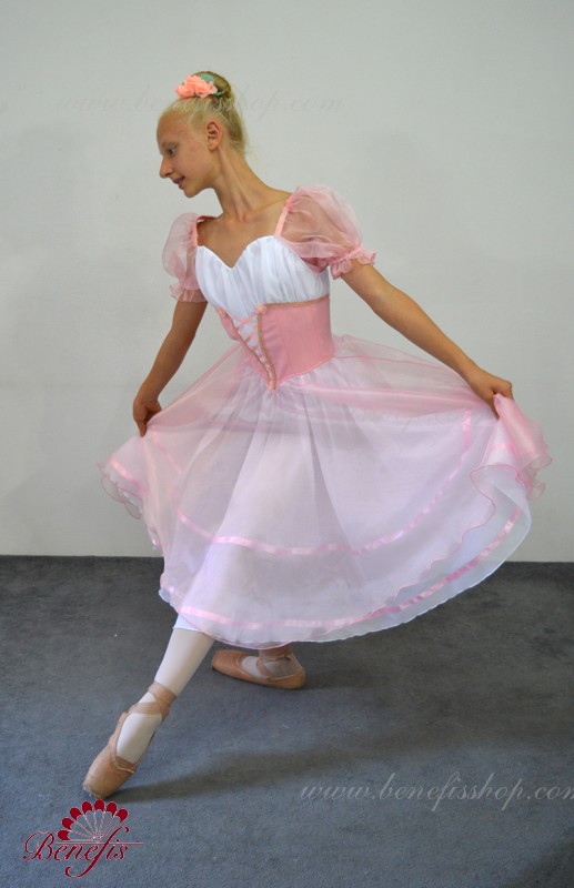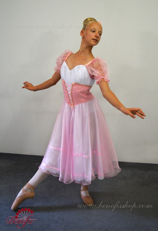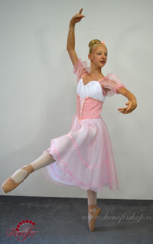 This professional stage ballet costume is made of a dense fabric of two colors. The upper part of the bodice is doubled with chiffon with decorative lacing in front. Clasp behind on two rows of hooks. The skirt consists of 2 layers. The upper skirt is decorated with two satin ribbons on the bottom.