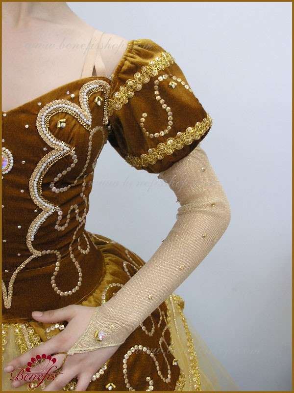 The sleeves are made in the shape of velvet sleeve - puffs with attached closely fitting gloves of the thin semi-stretch mesh fabric. There are elastic loops on the gloves for fingers.