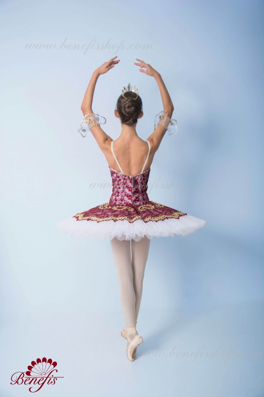 Professional stage costume made on the basis of the basic tutu T0001B. The bodice is made of semi-stretched fabric, doubled with guipure with the V-neck, spread out. The bodice is fastened on the back with 2 rows of hooks. The costume is decorated with sparkles, rhinestones, guipure applications and shiny braid.