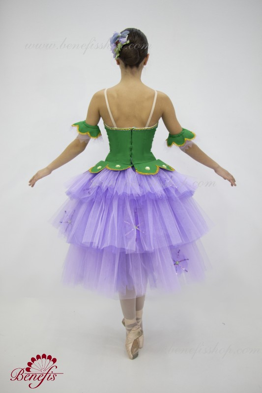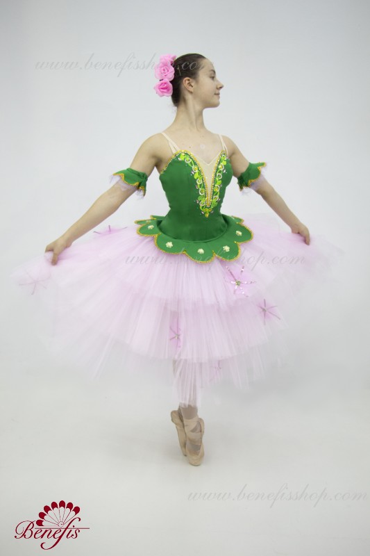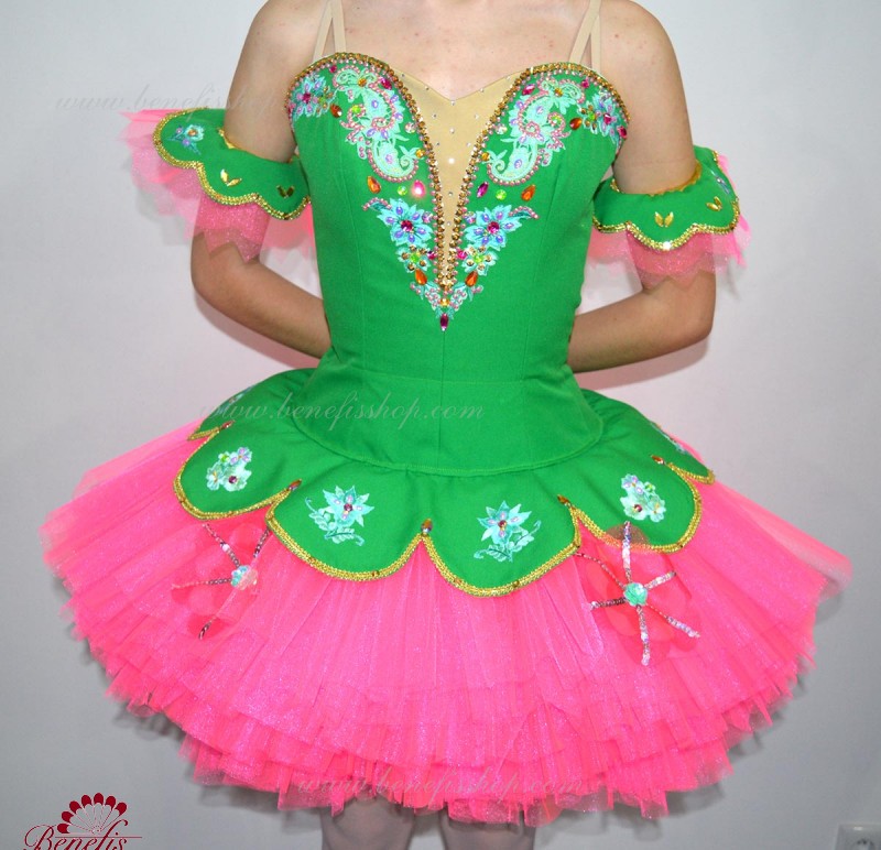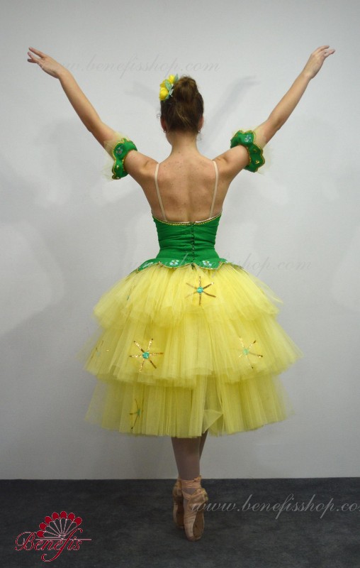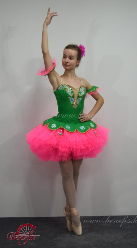Green bodice is made of the semi-stretched fabric. It has a flesh-colored inset on the chest and elastic straps.