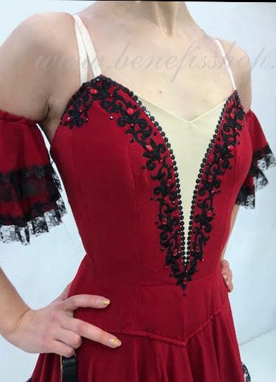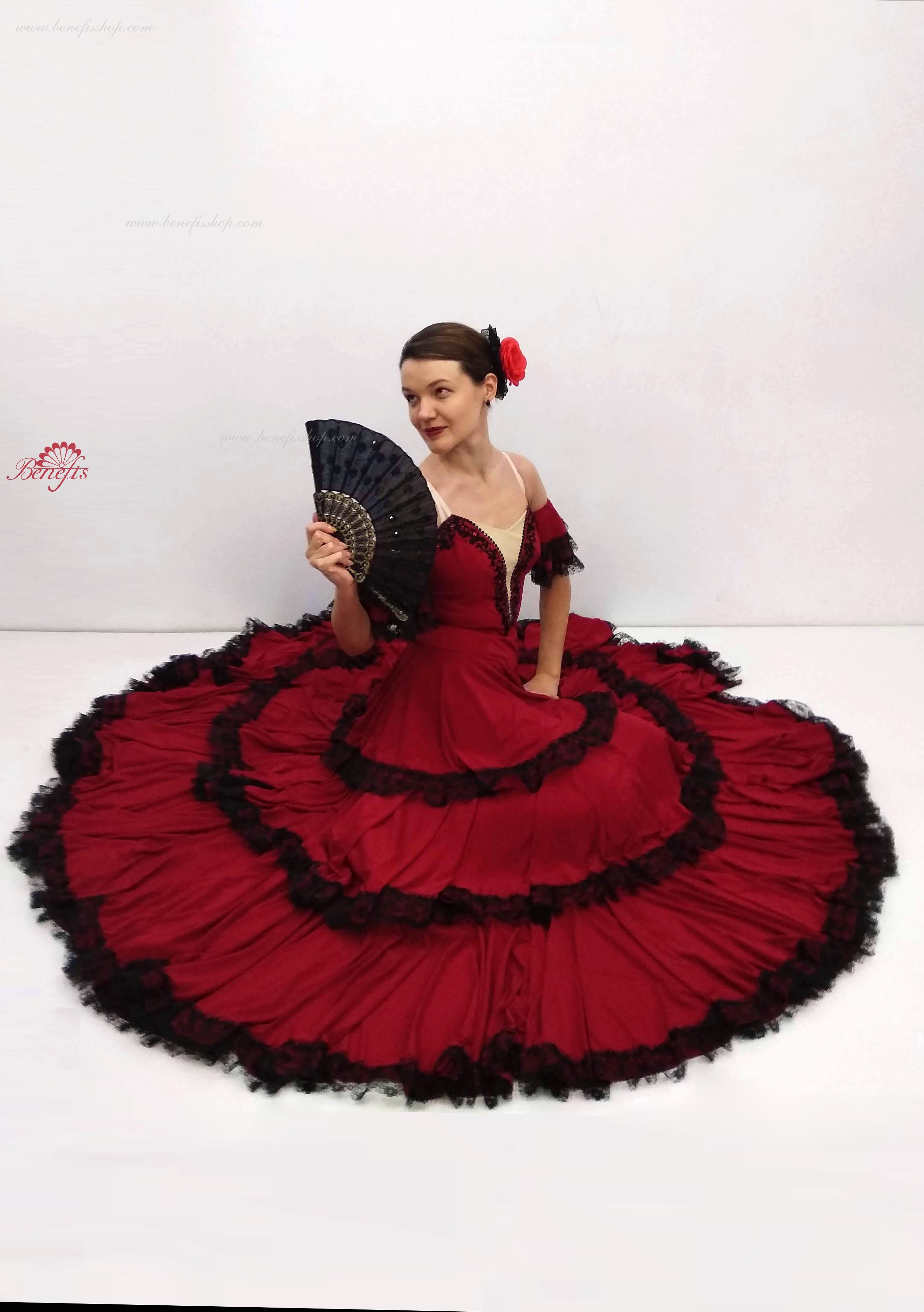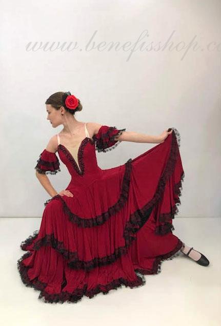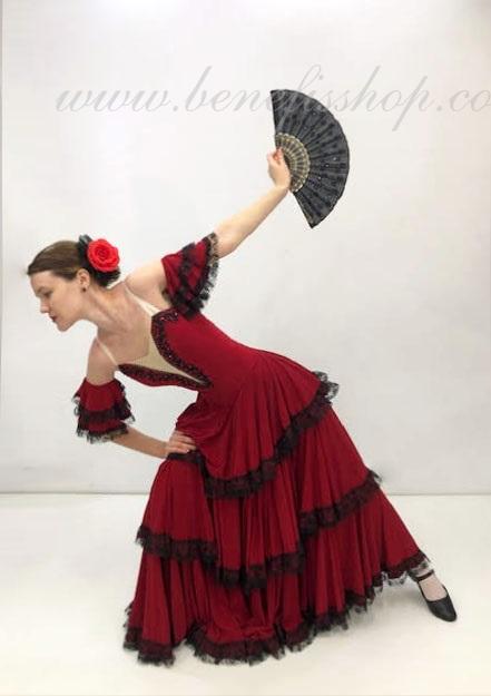 Spanish dress made of elastic fabric hb 1.5 cm skirt, with three ruffles decorated with black lace.