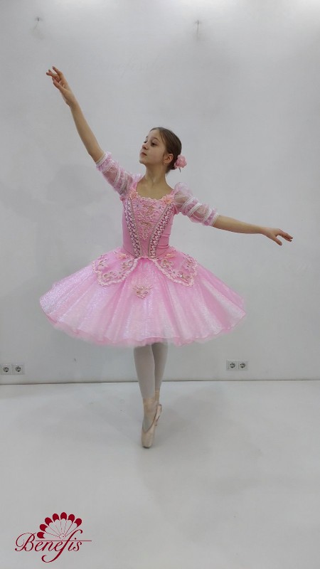 This professional ballet stage costume is made on the basis of P0510. The skirt consists of 7 layers, 2 upper layers of soft tulle and 5 lower layers of hard. Rigid shuttlecocks are laid in folds and tied to two rows of the insole, which gives the shape of a bell.