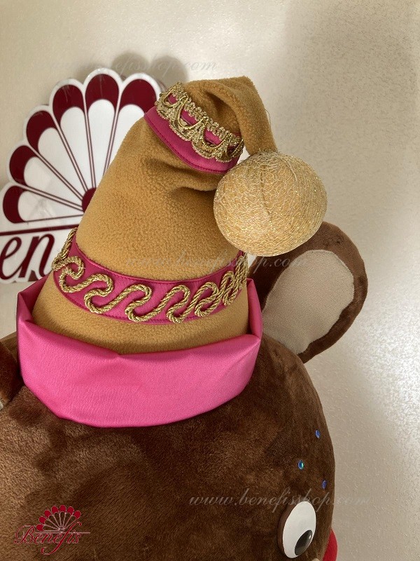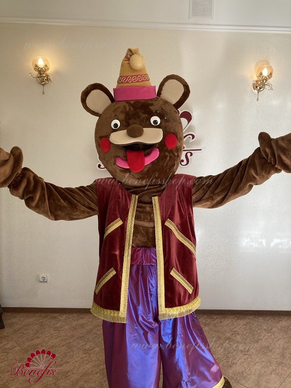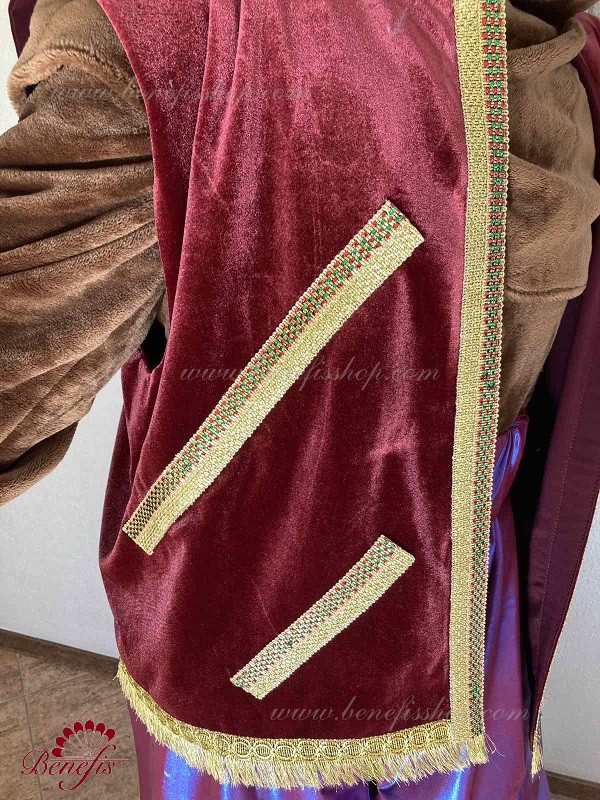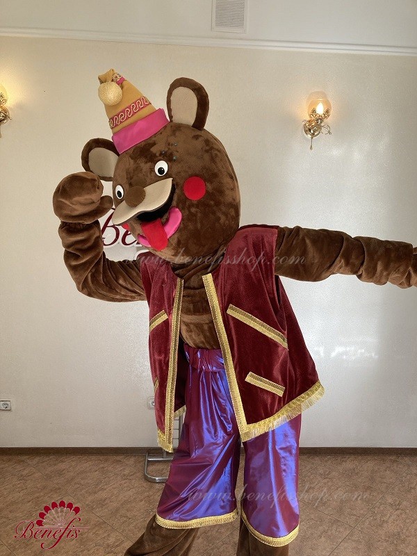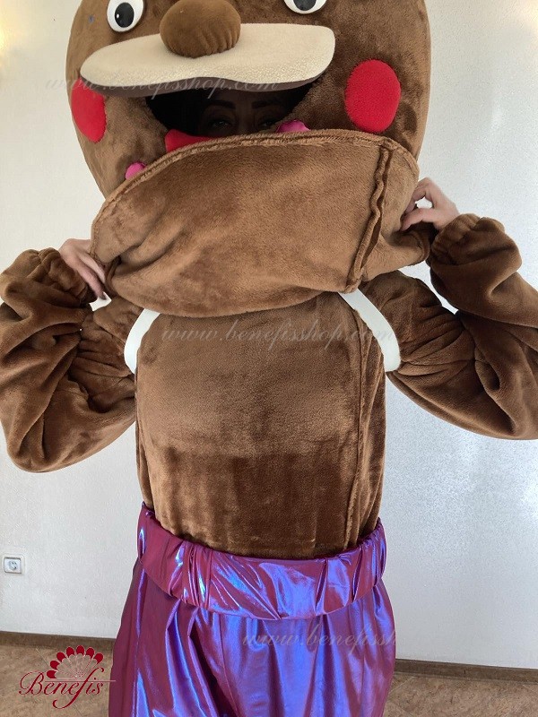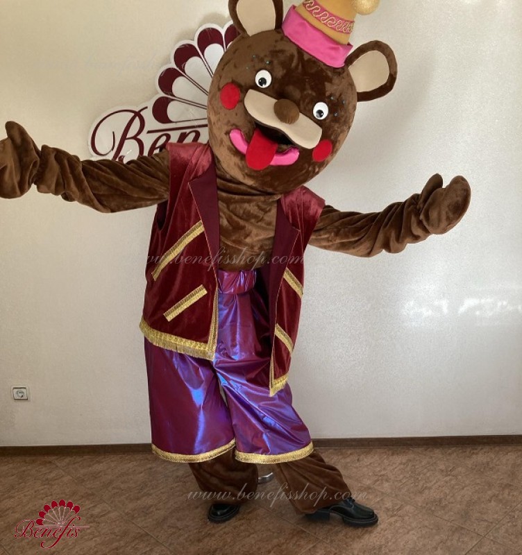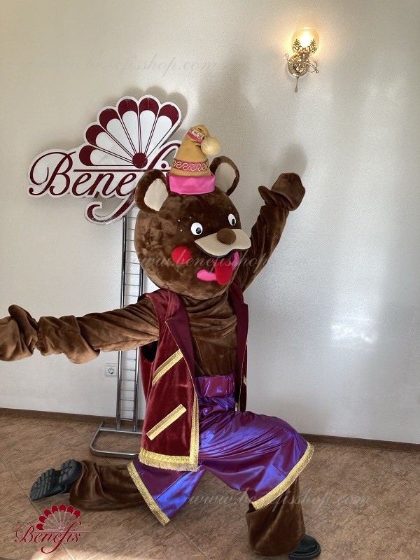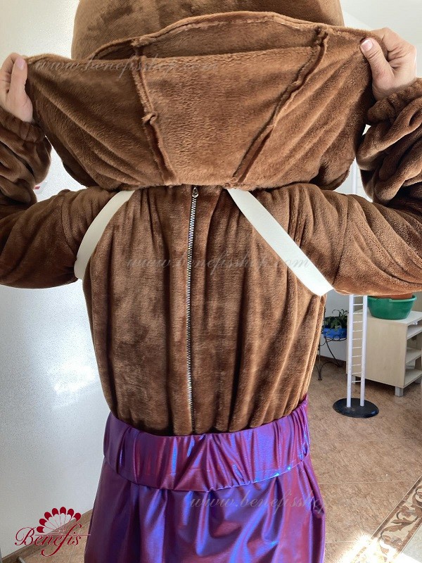 Details: costume. Faux fur jumpsuit. The vest is made of velvet lined with gabardine and decorated with braid. Elongated stretch lycra shorts. A faux fur head with a cap.