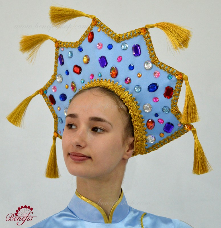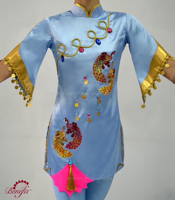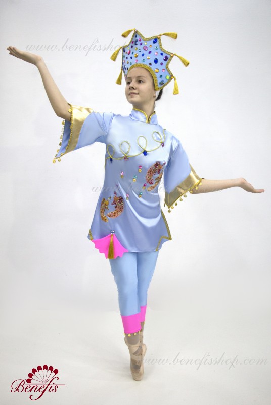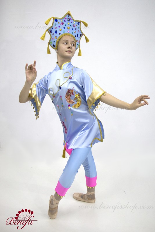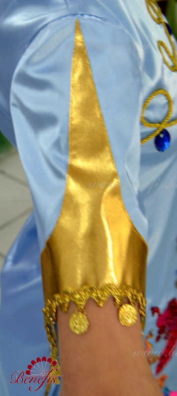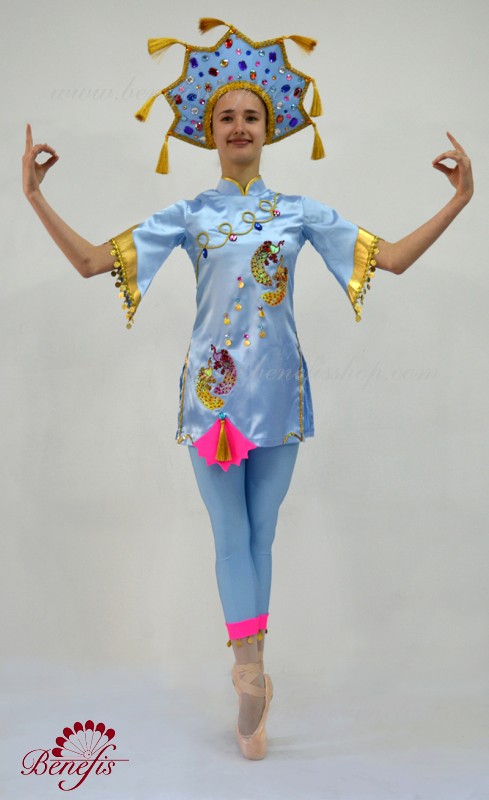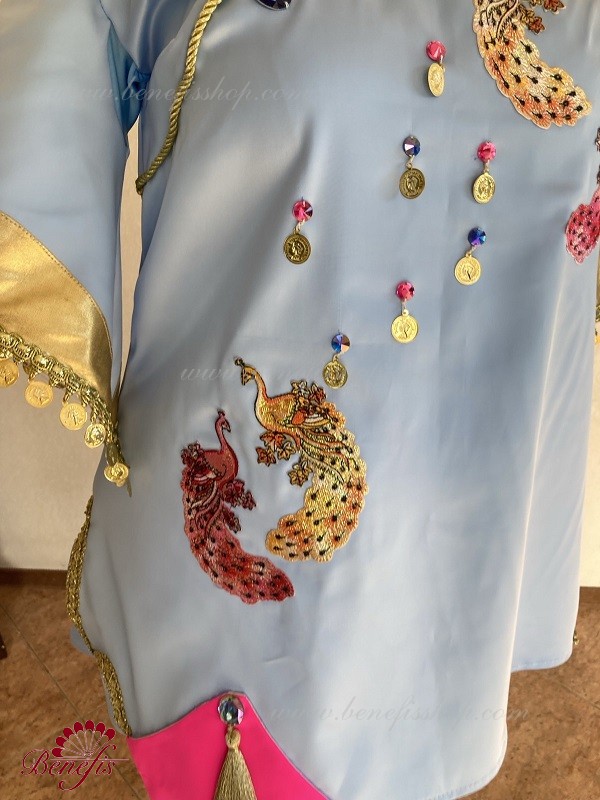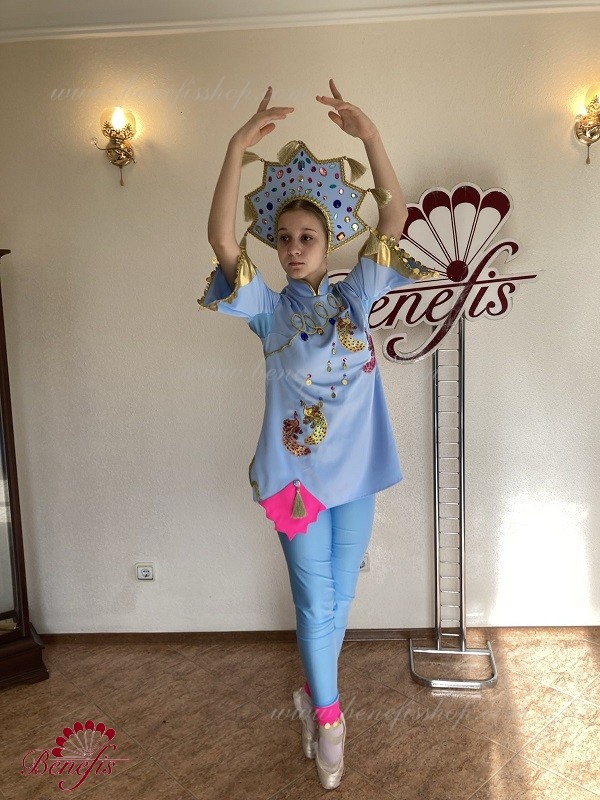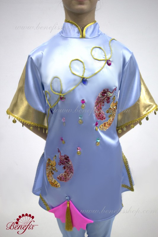 The tunic is made of semi-stretched fabric, with cuts on the sides. Clasp behind the zipper. As a decor are used appliques, braid, sequins, monists, rhinestones.