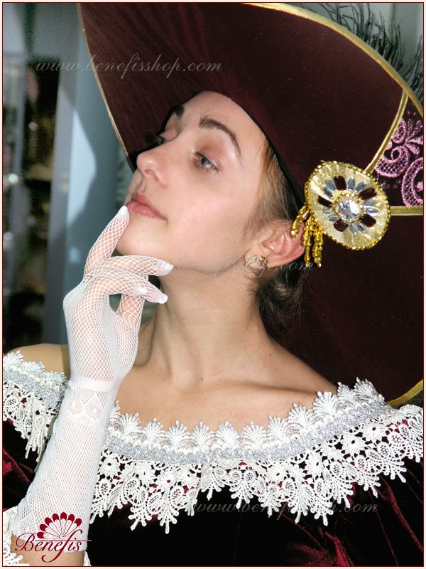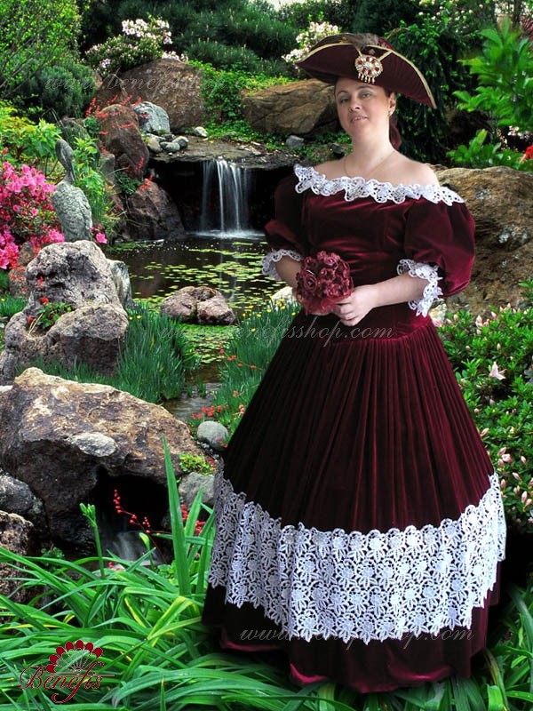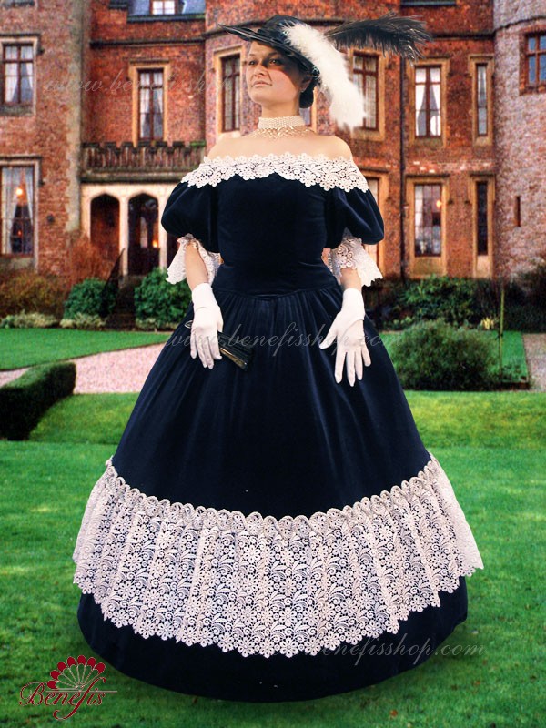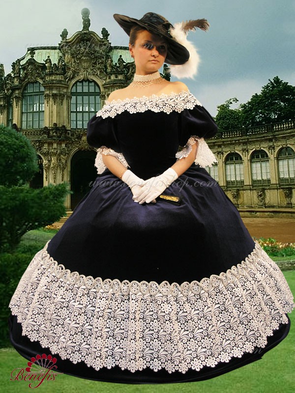 This dress is made of velvet. The bodice is with opened shoulders and puff sleeves. The skirt consists of three layers: velvet, tulle and lining. The dress is beautified with heavy laces in age-old style and is trimmed with silver cord. The dress fastens with zip or claspers (depending on the client’s wish).